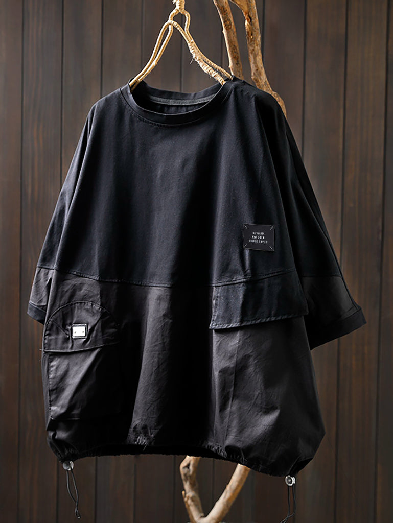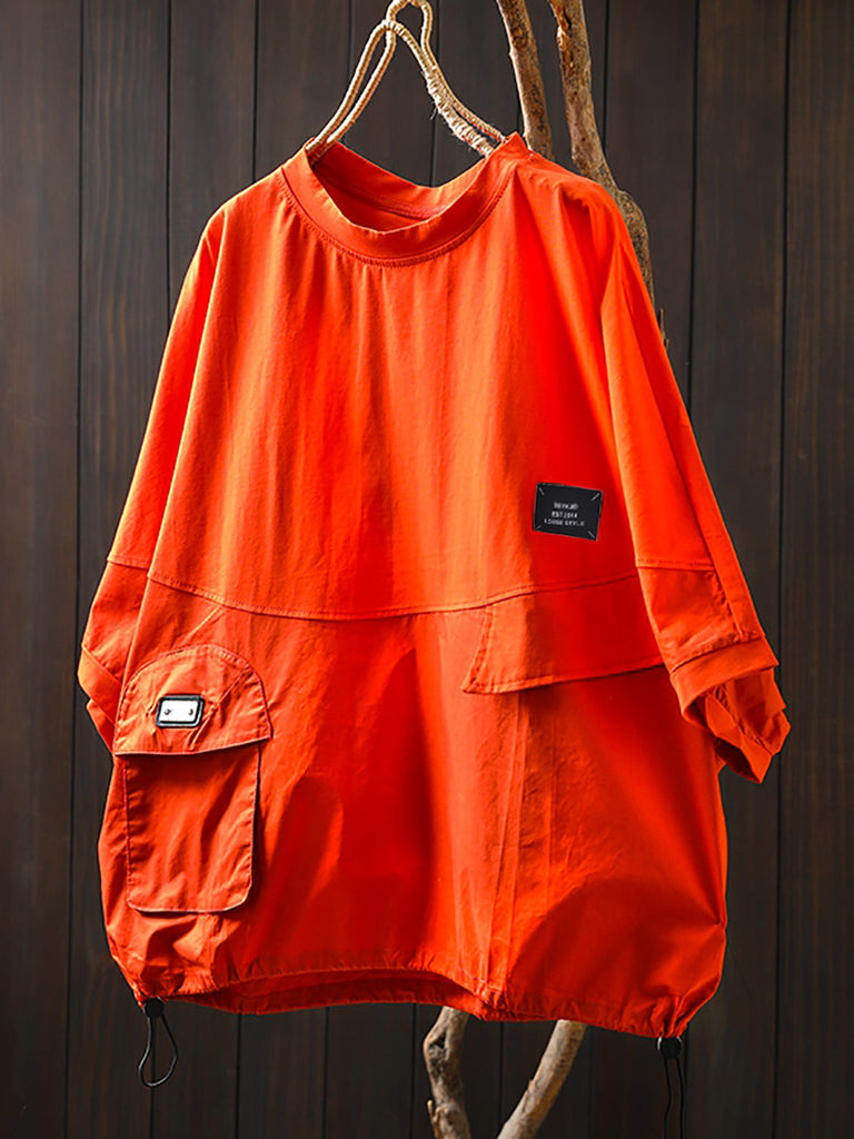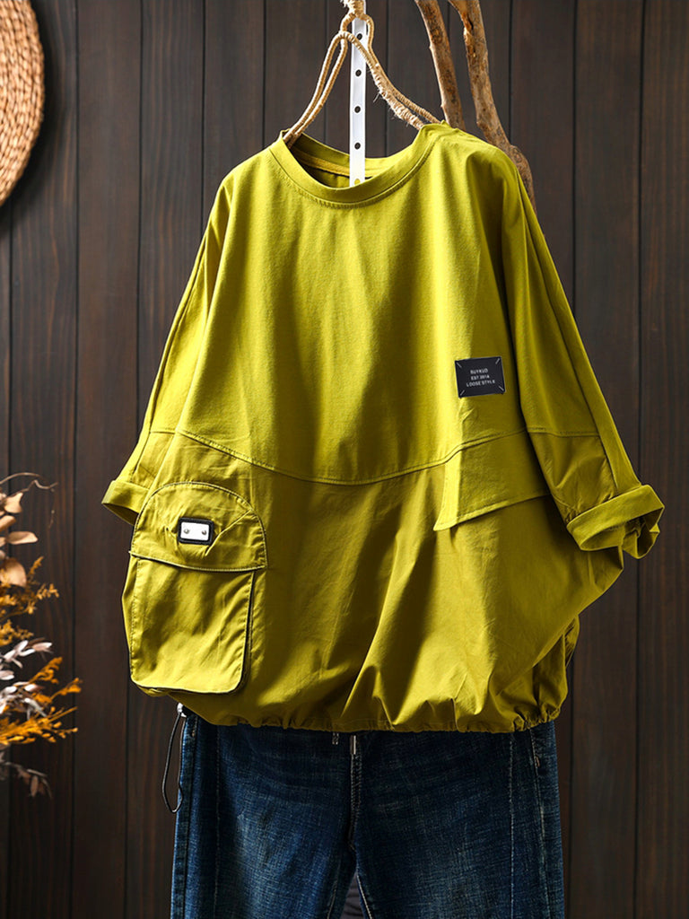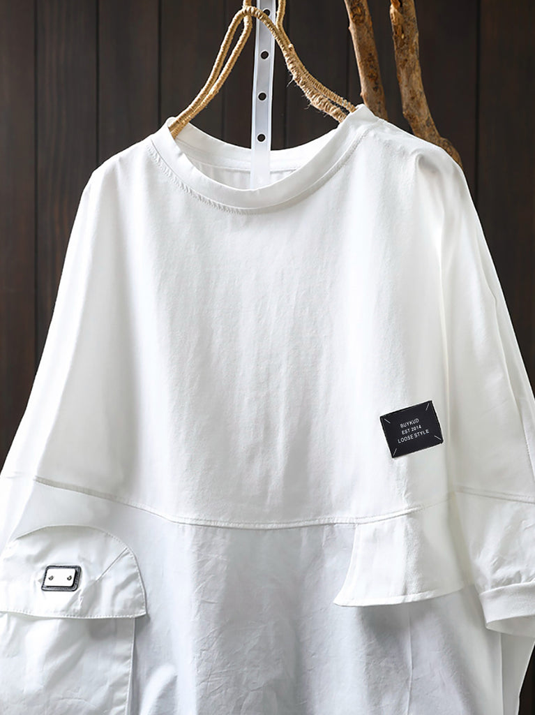 Camisa de algodão plus size feminina com bolso de verão e gola redonda em cor pura