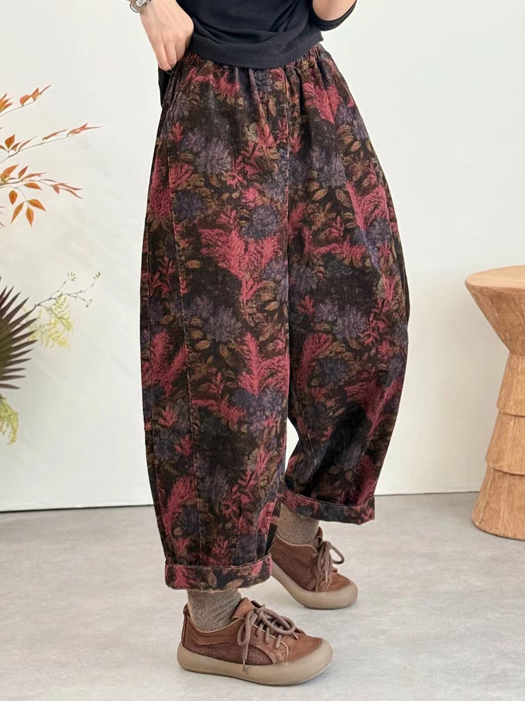 Calças harém femininas de veludo cotelê étnico com flores de inverno