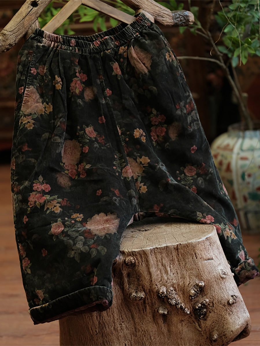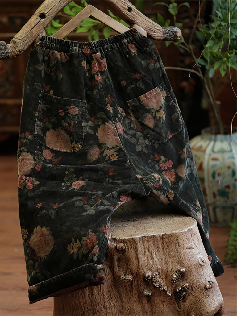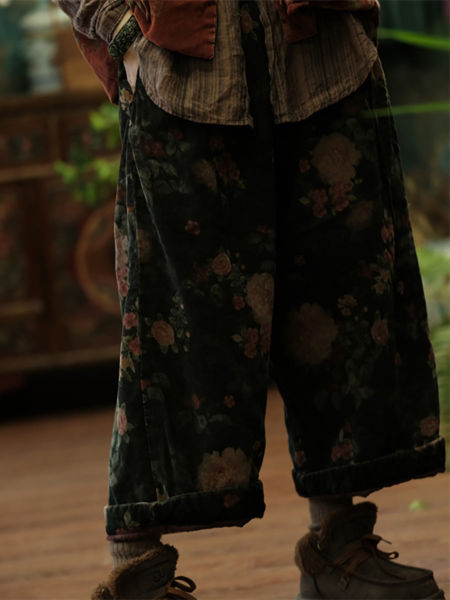 Calças femininas de inverno retrô com flores de algodão e linho, pernas largas