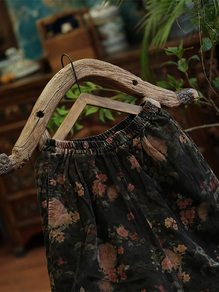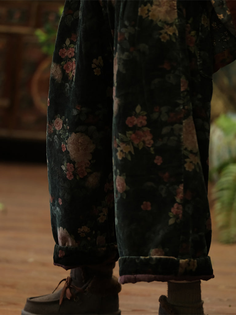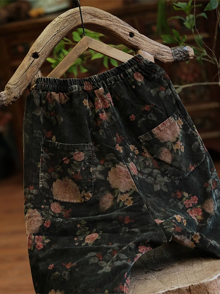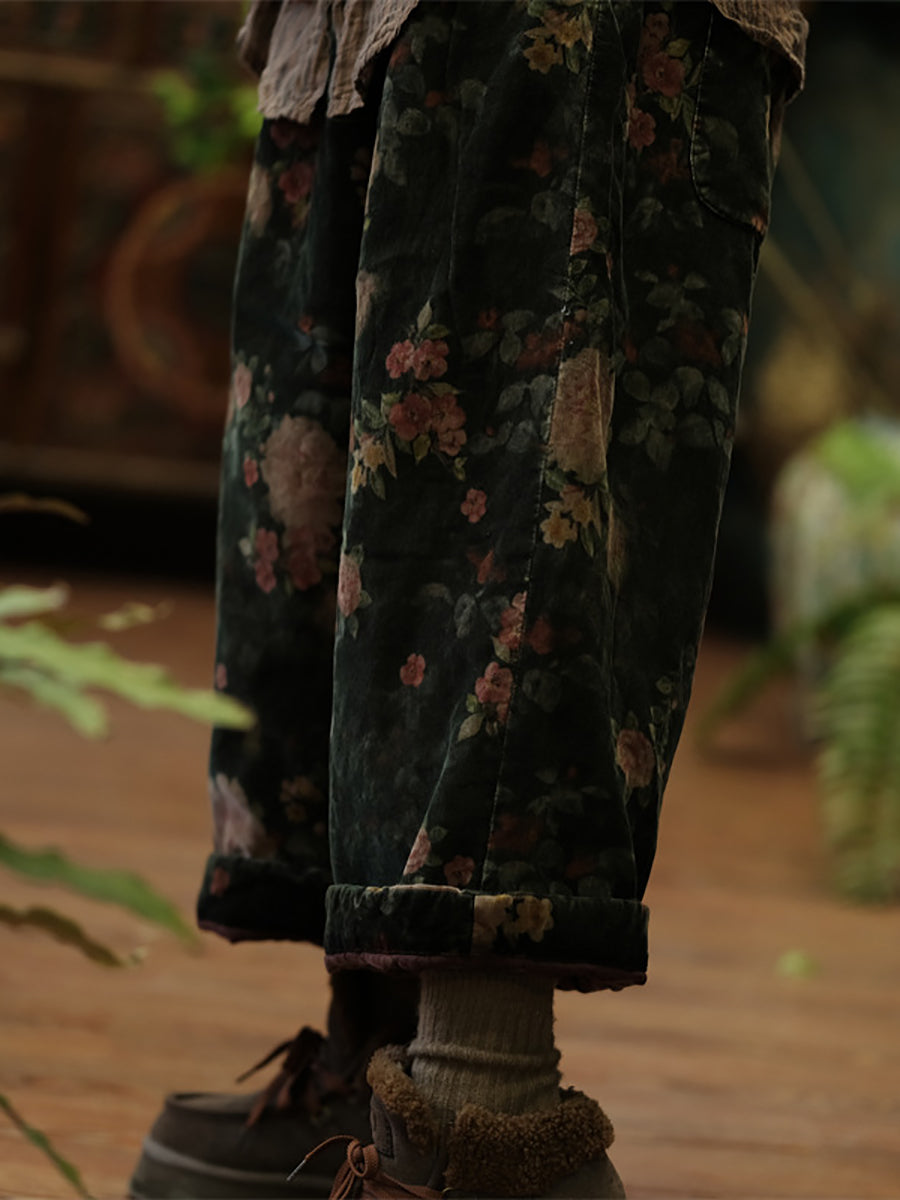 Calças femininas de inverno retrô com flores de algodão e linho, pernas largas