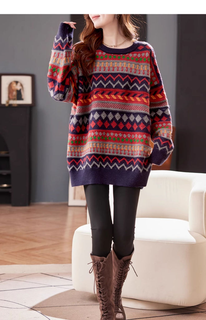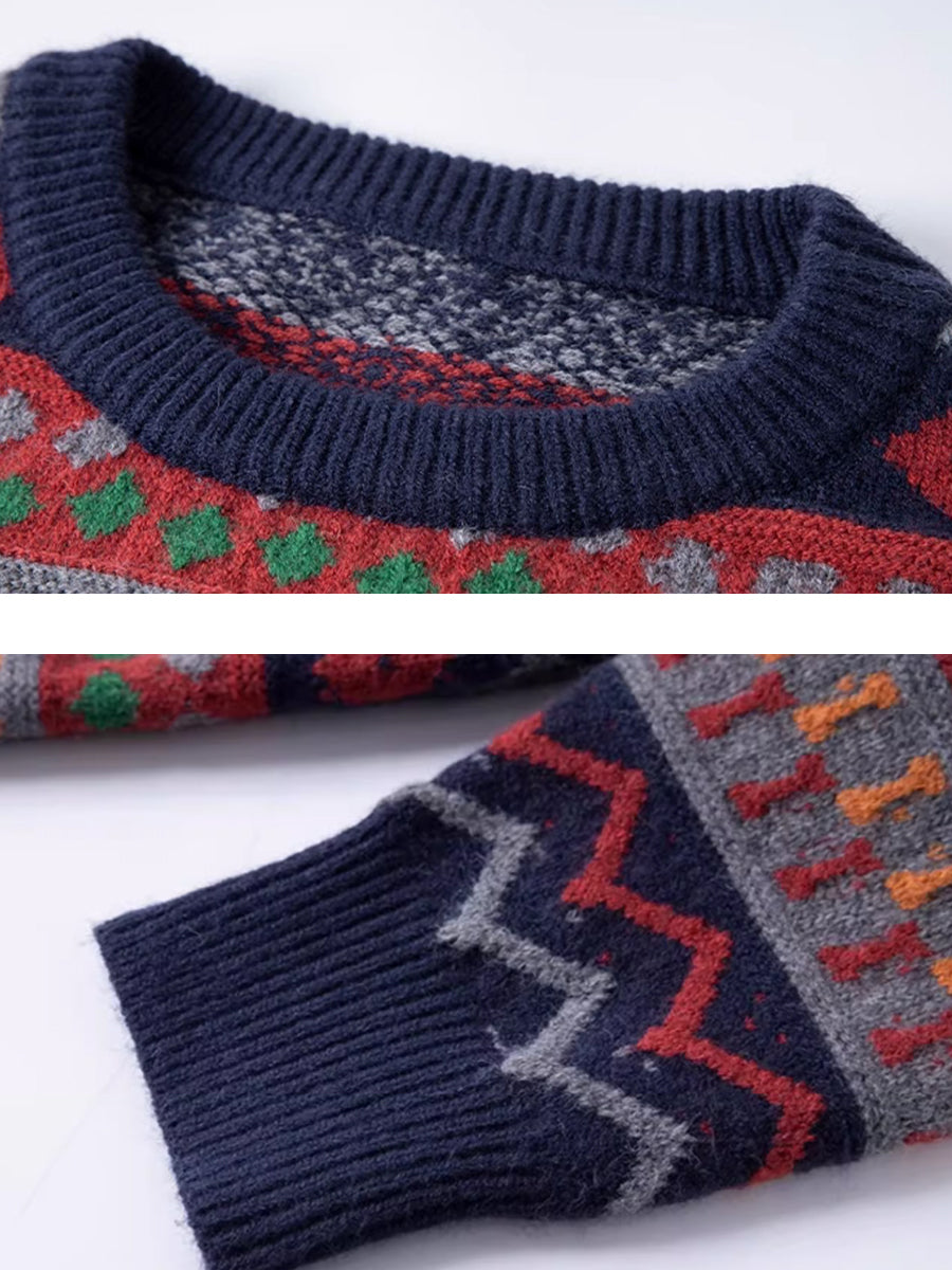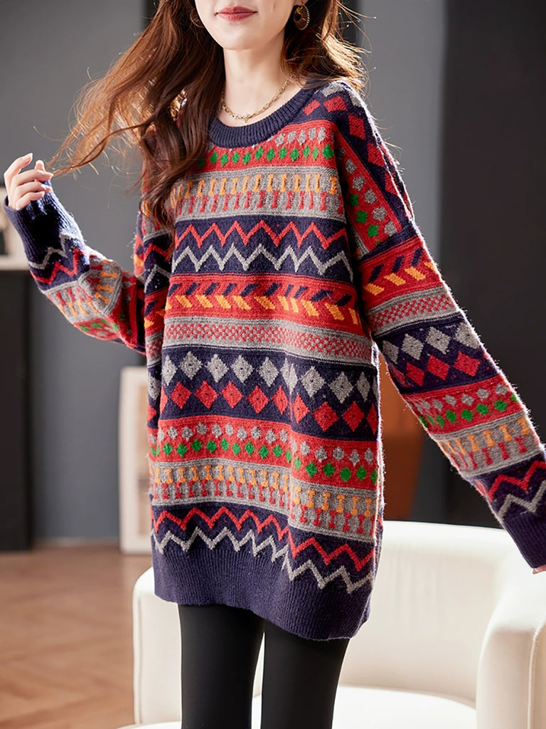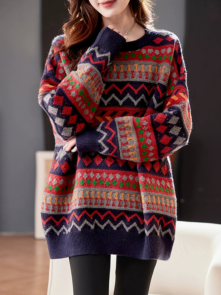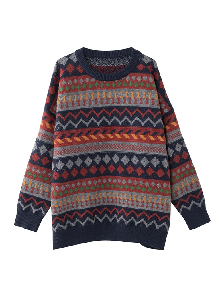 Suéter feminino de gola redonda com estampa jacquard listrada para o outono
