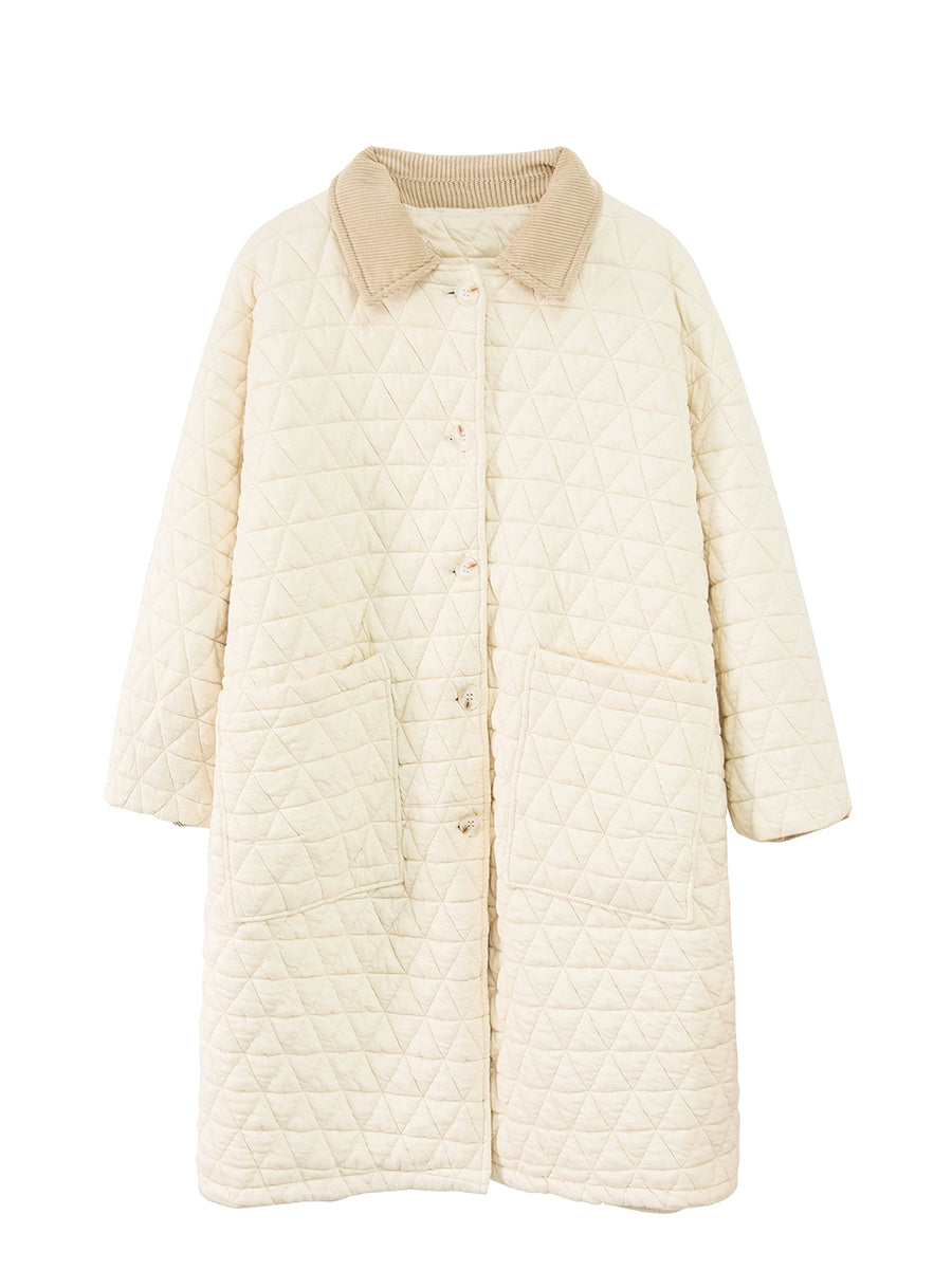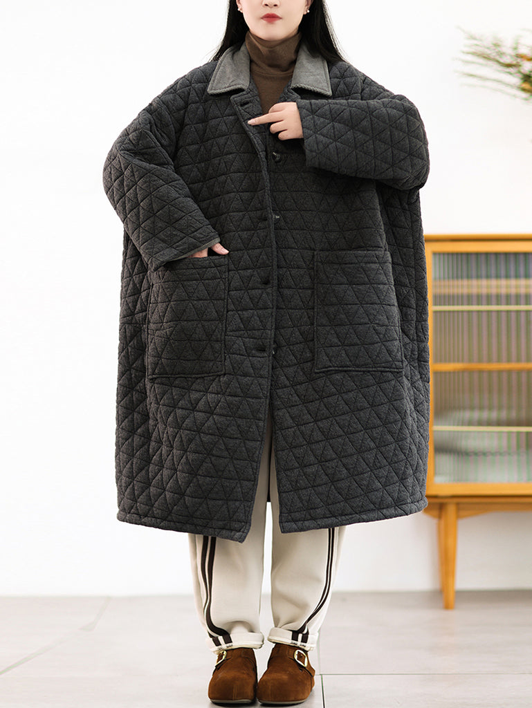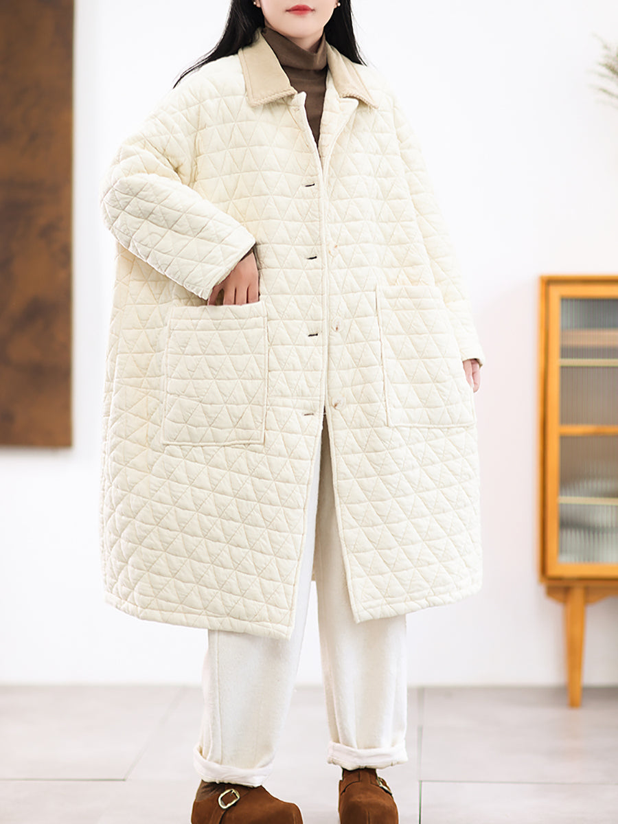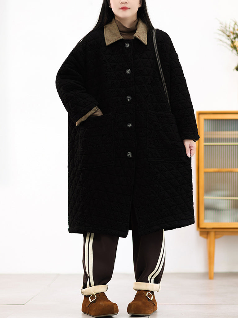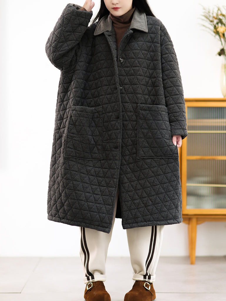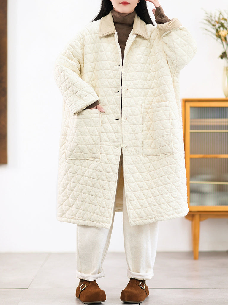 Casaco longo acolchoado feminino de inverno, cor lisa, com gola dobrável.