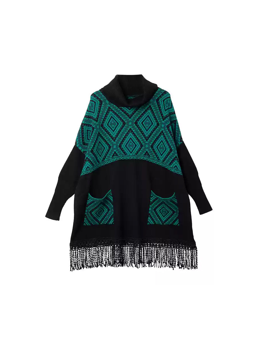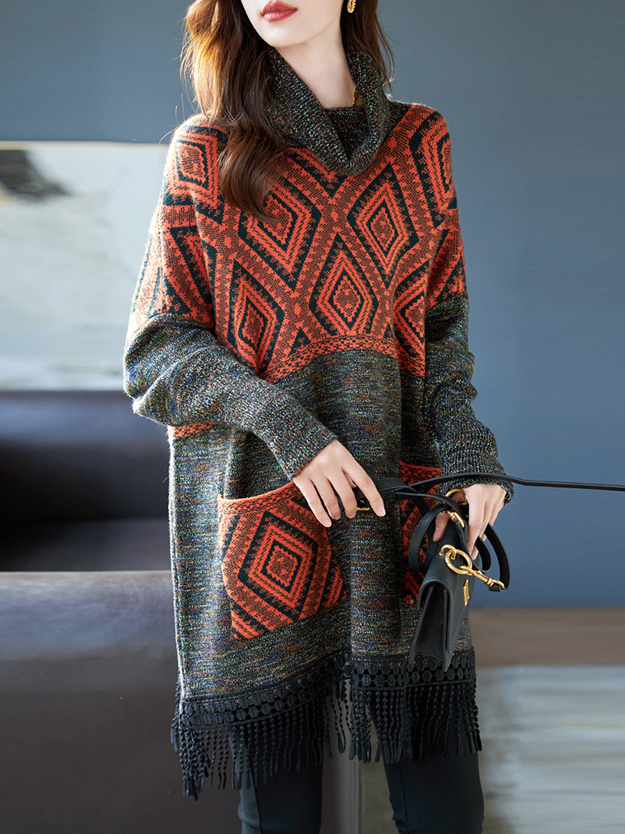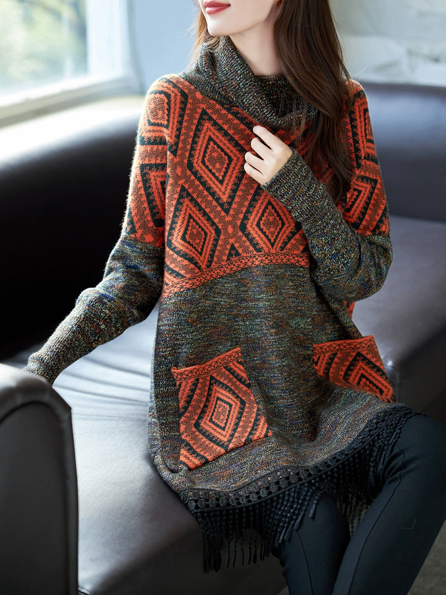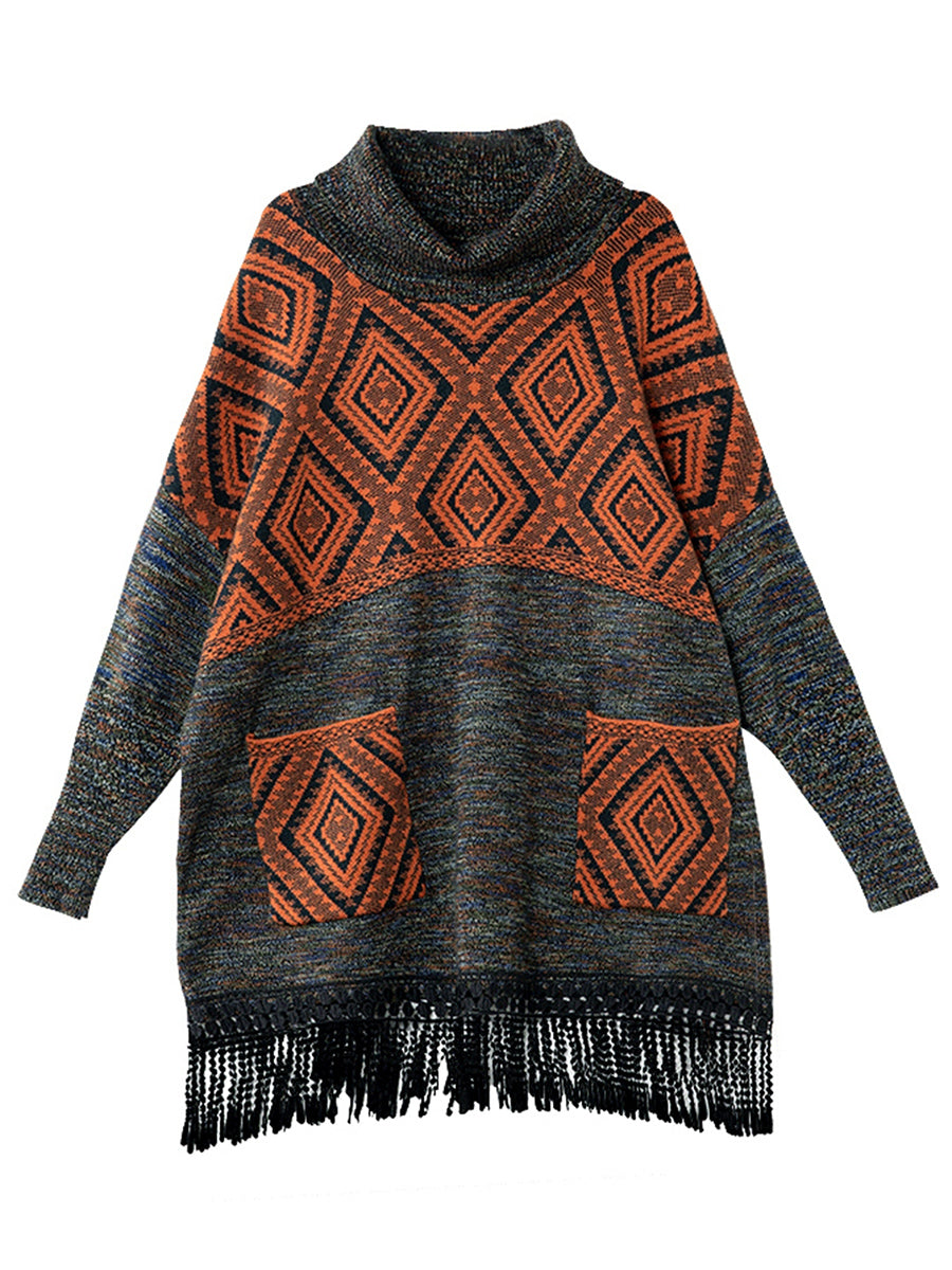 Suéter feminino de inverno vintage com gola alta e franjas em losangos.