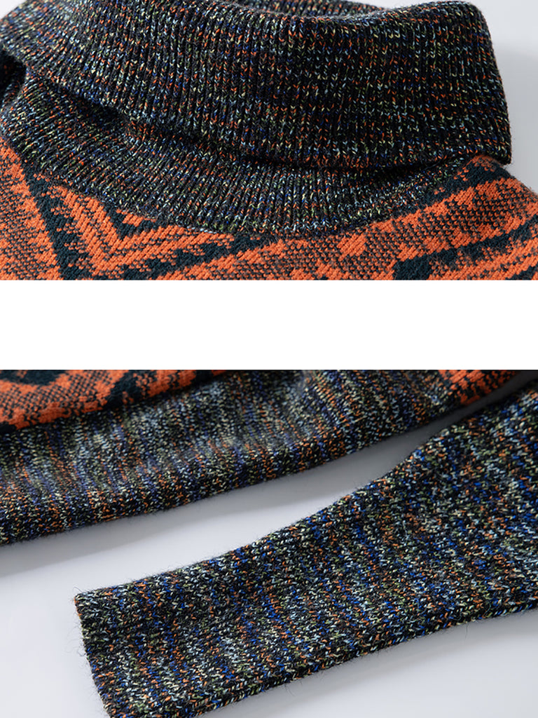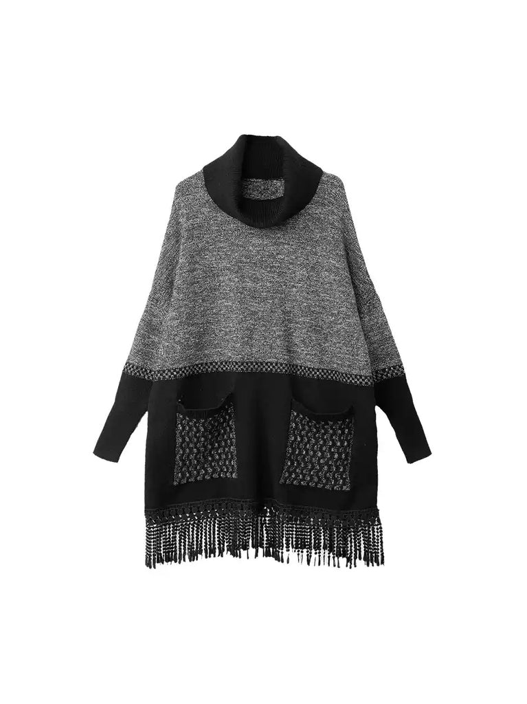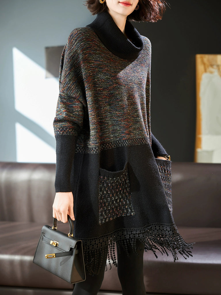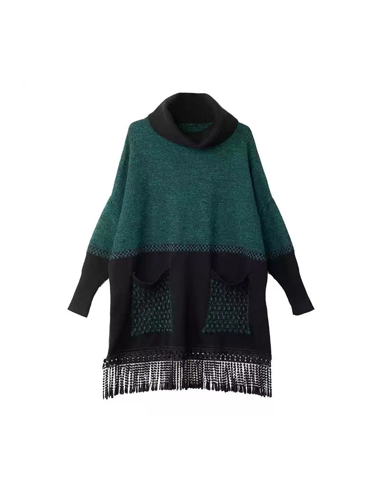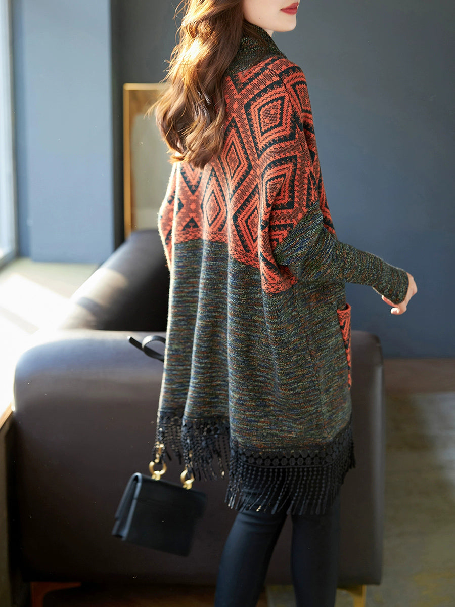 Suéter feminino de inverno vintage com gola alta e franjas em losangos.