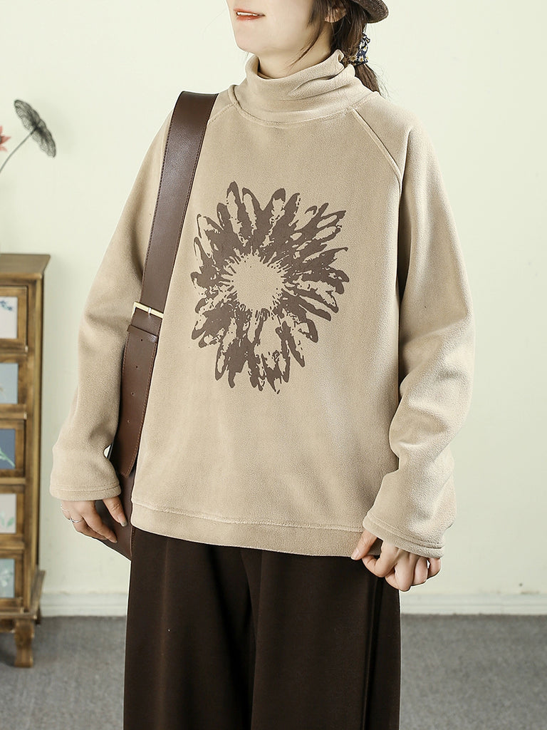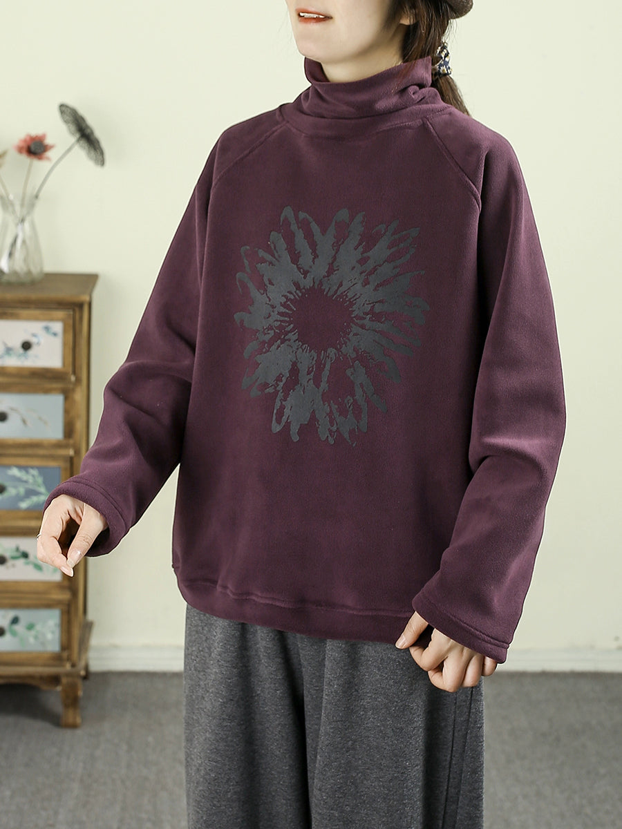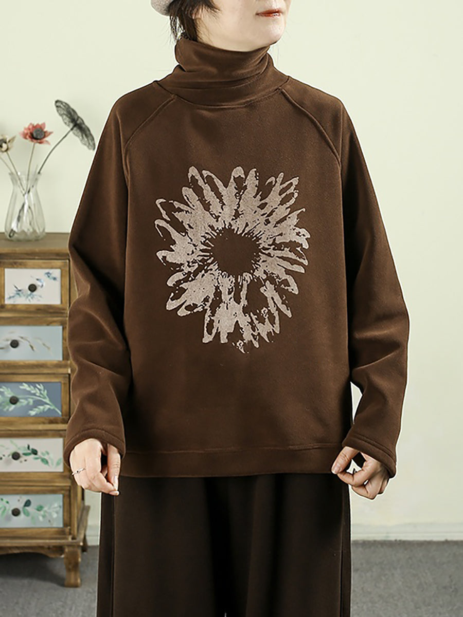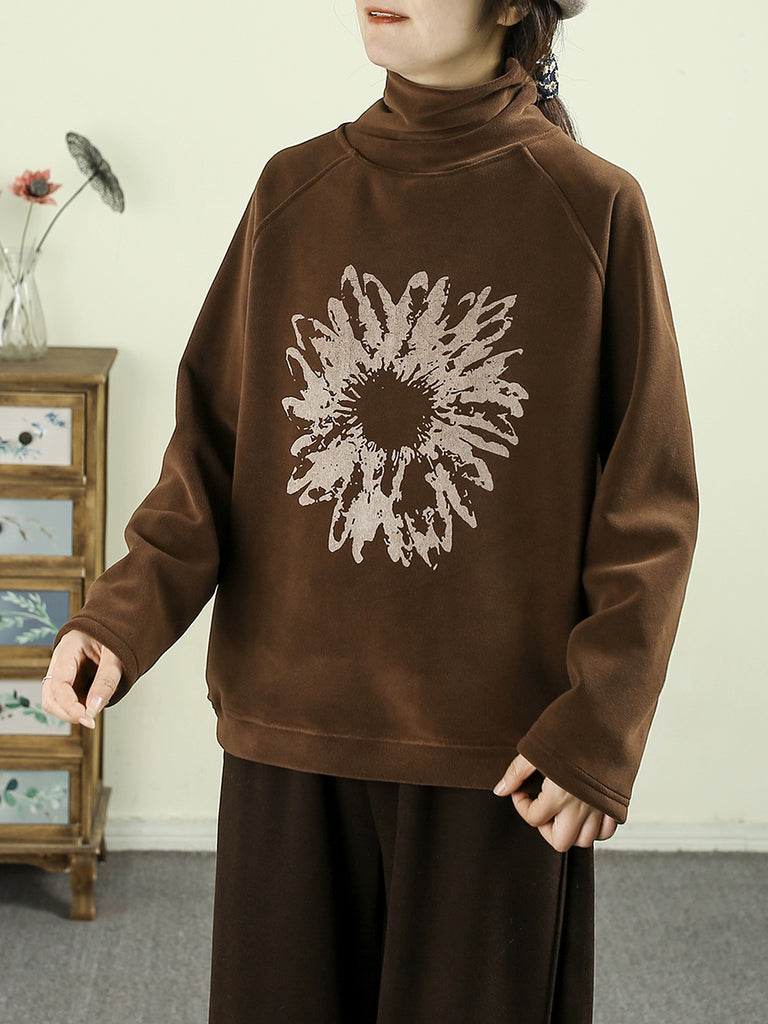 Blusa feminina vintage de gola alta com estampa floral outonal e forro de lã.