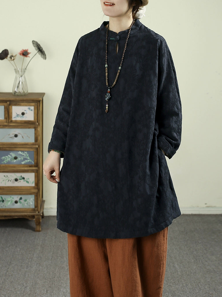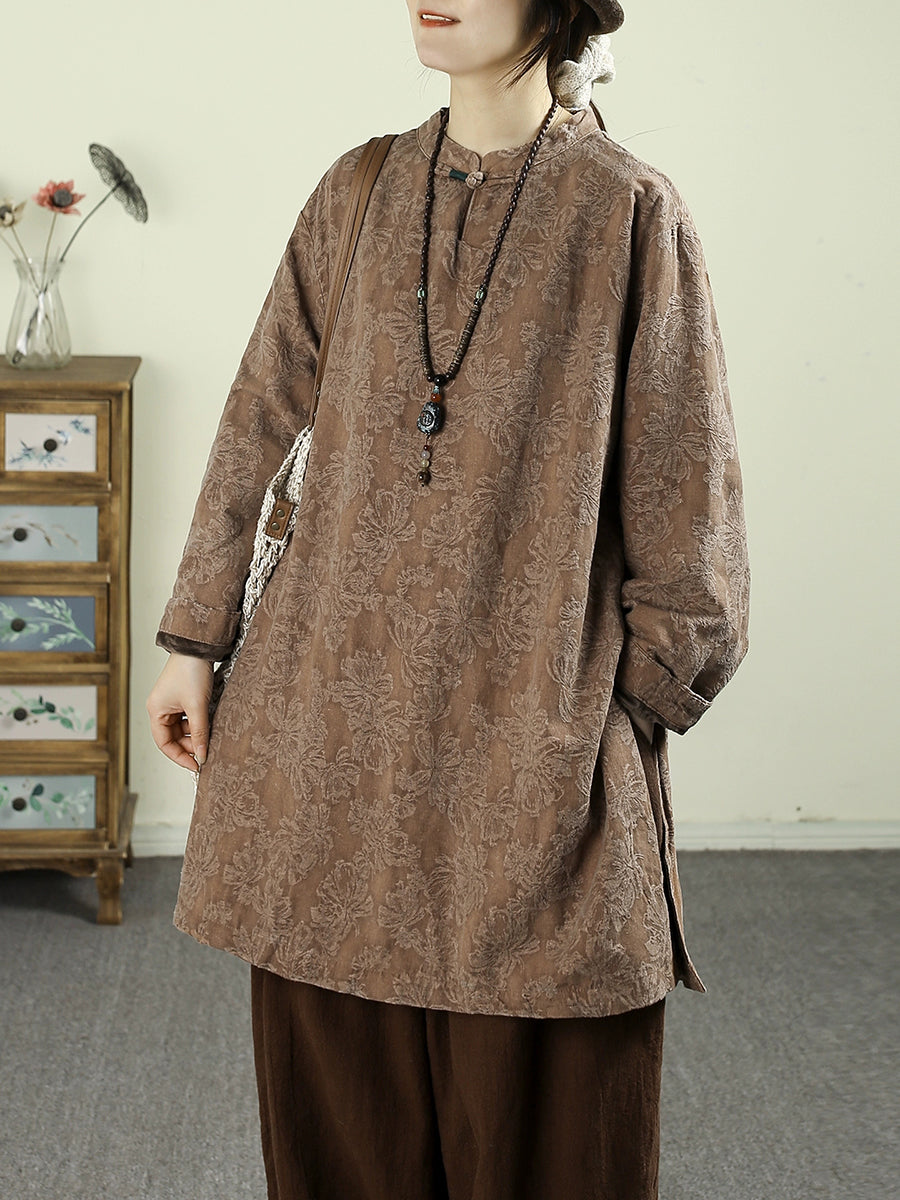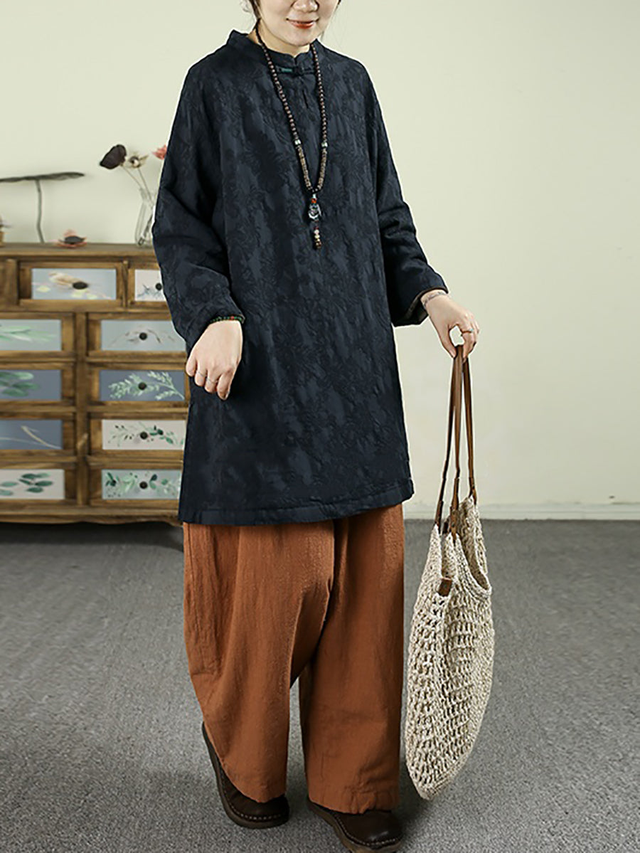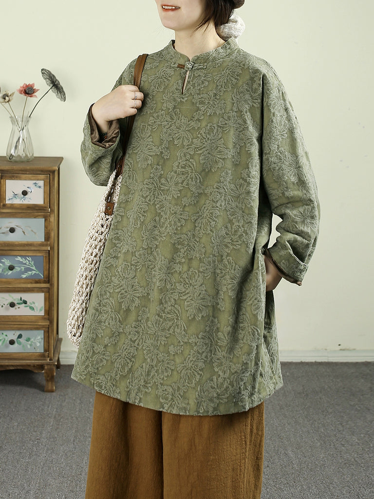 Camisa feminina de inverno retrô em jacquard, 100% linho, com forro de lã.