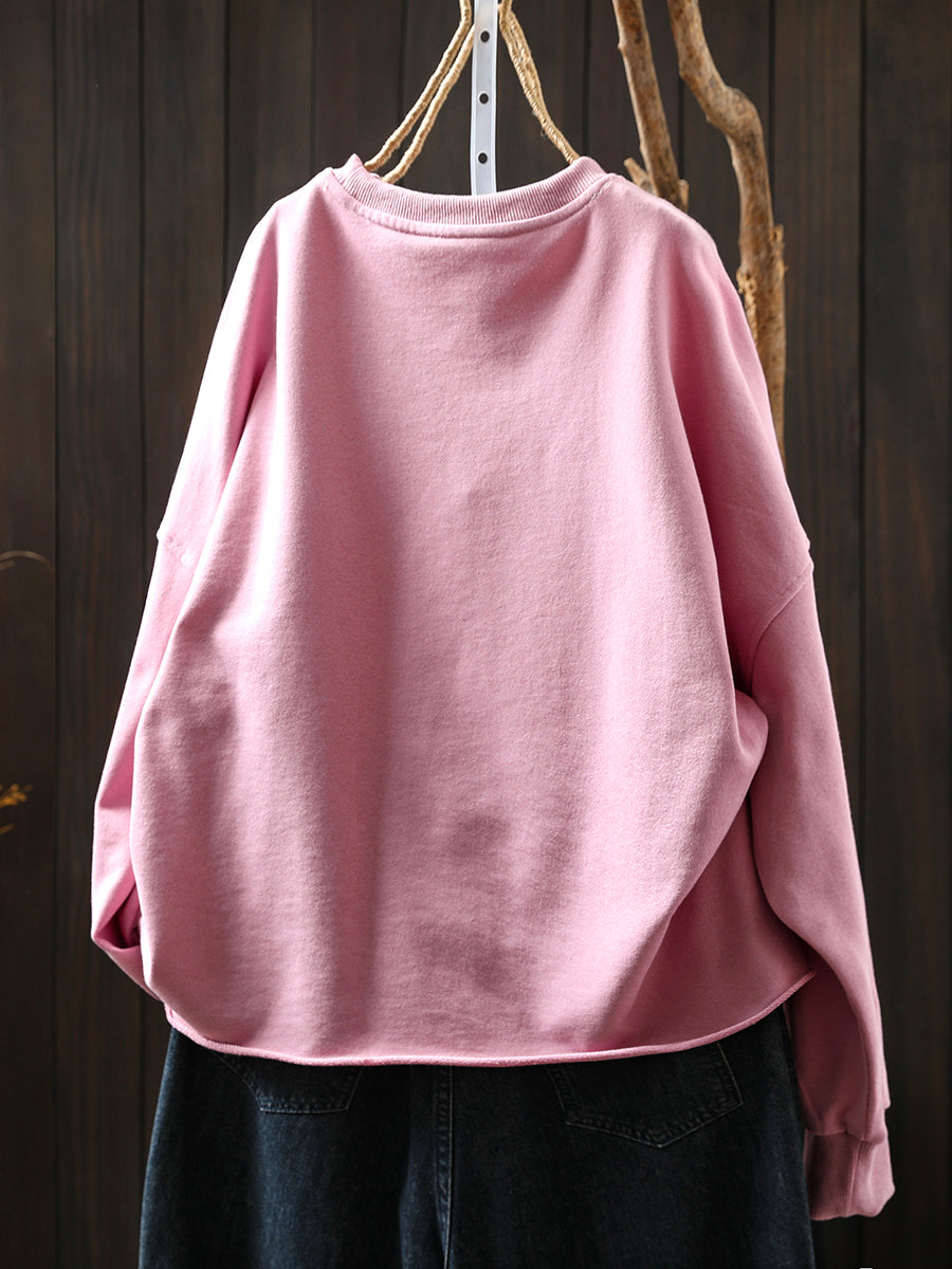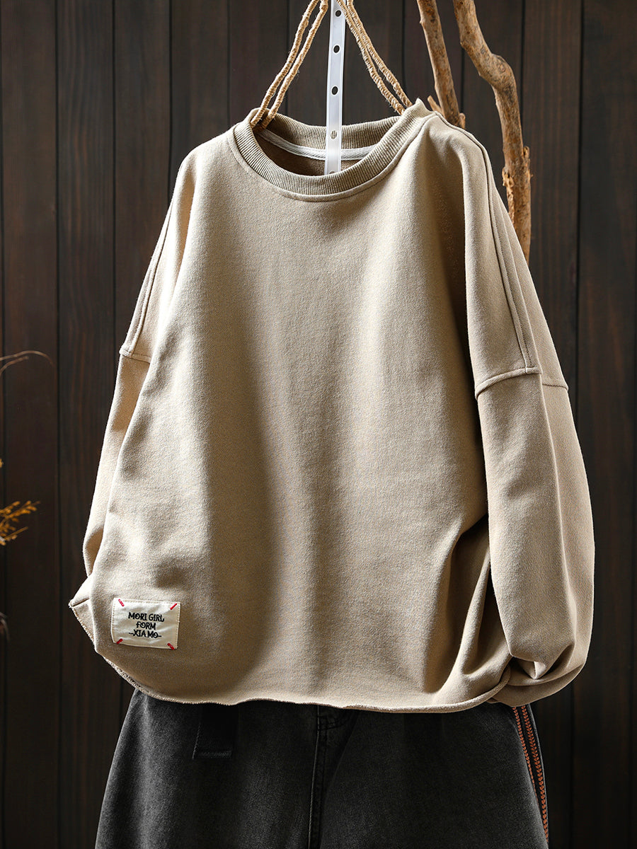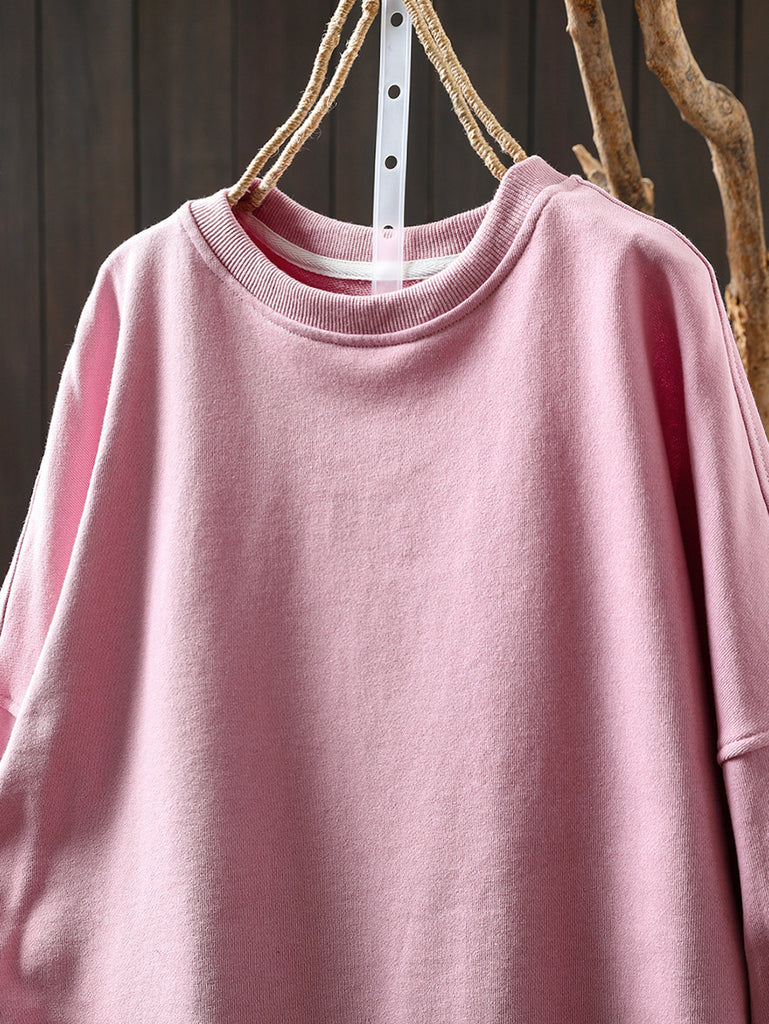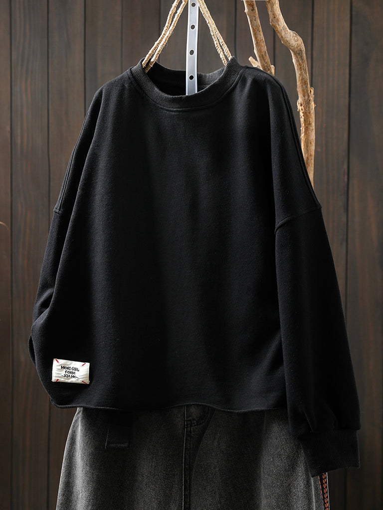 Blusa feminina de algodão com decote redondo, estilo retrô outonal, em cor lisa.