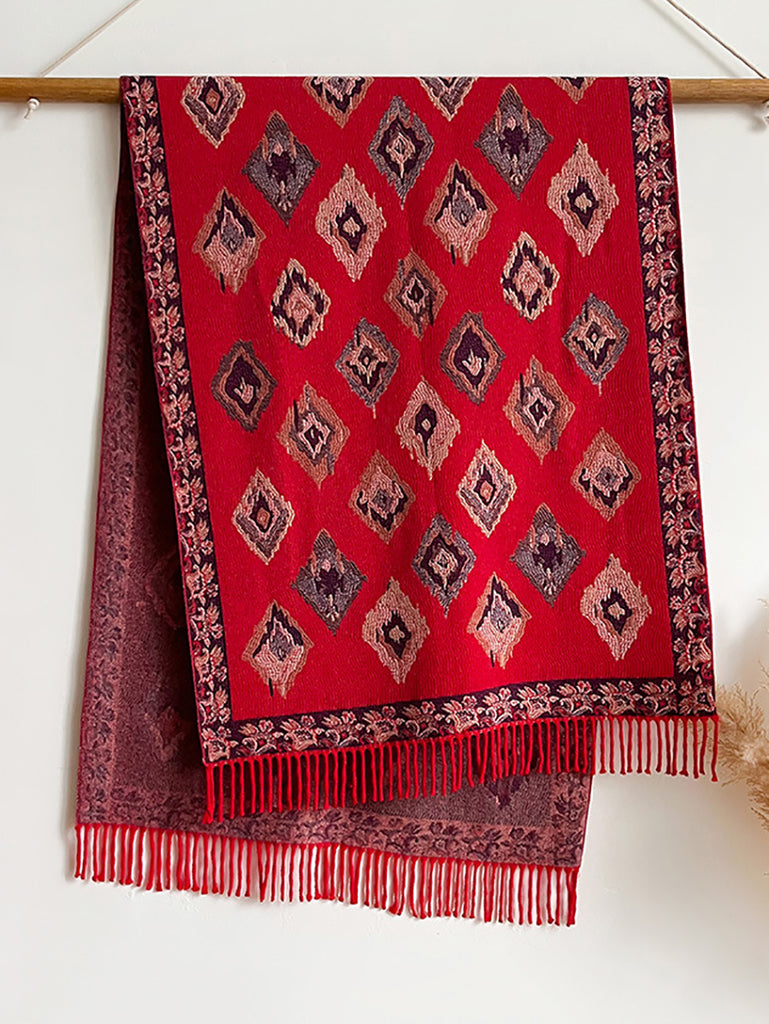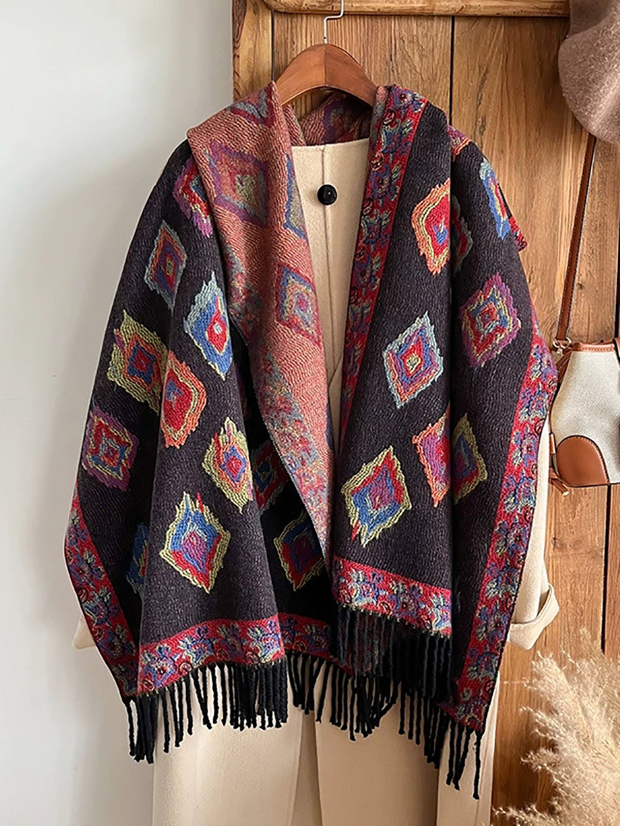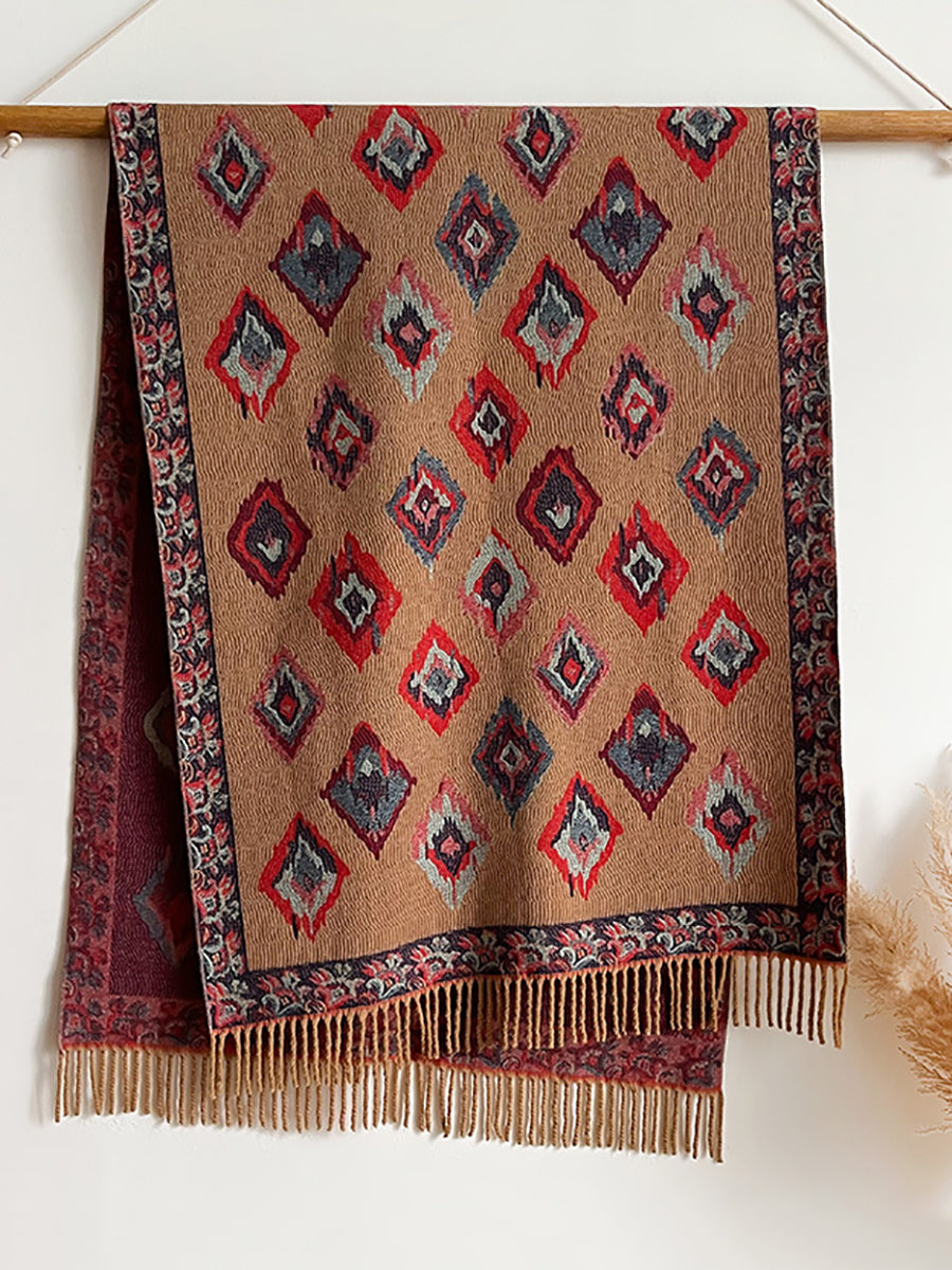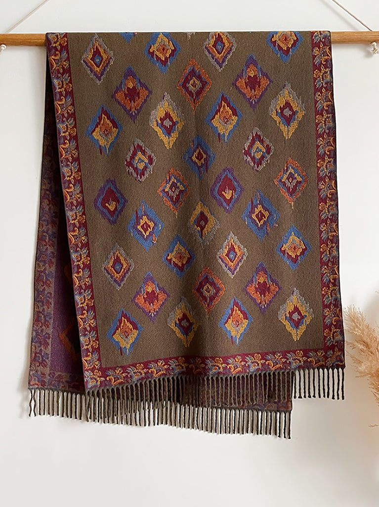 Xale/Cachecol Feminino Étnico com Borlas em Formato de Losangos