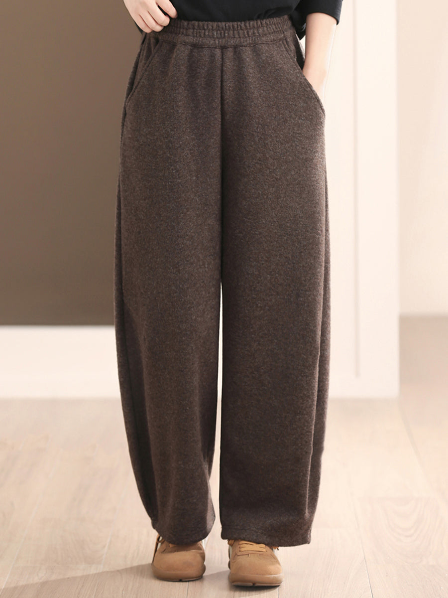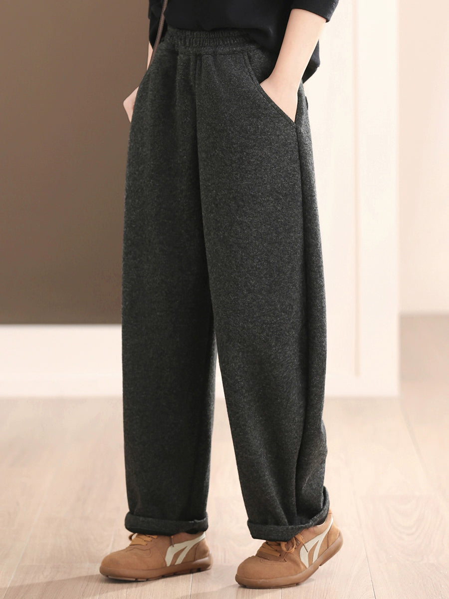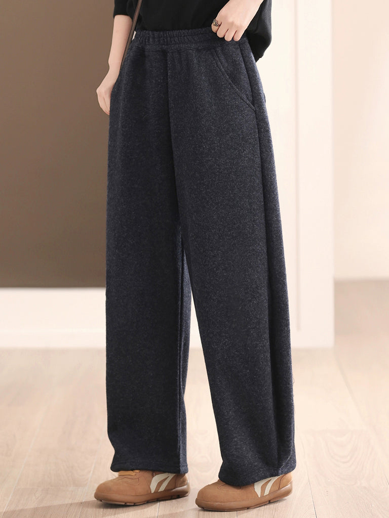 Calça feminina de inverno retrô, lisa, forrada com lã, de pernas largas.