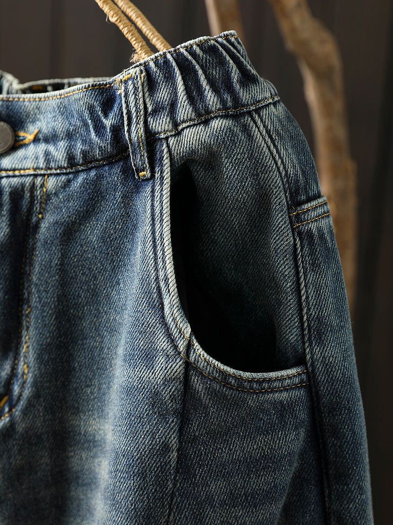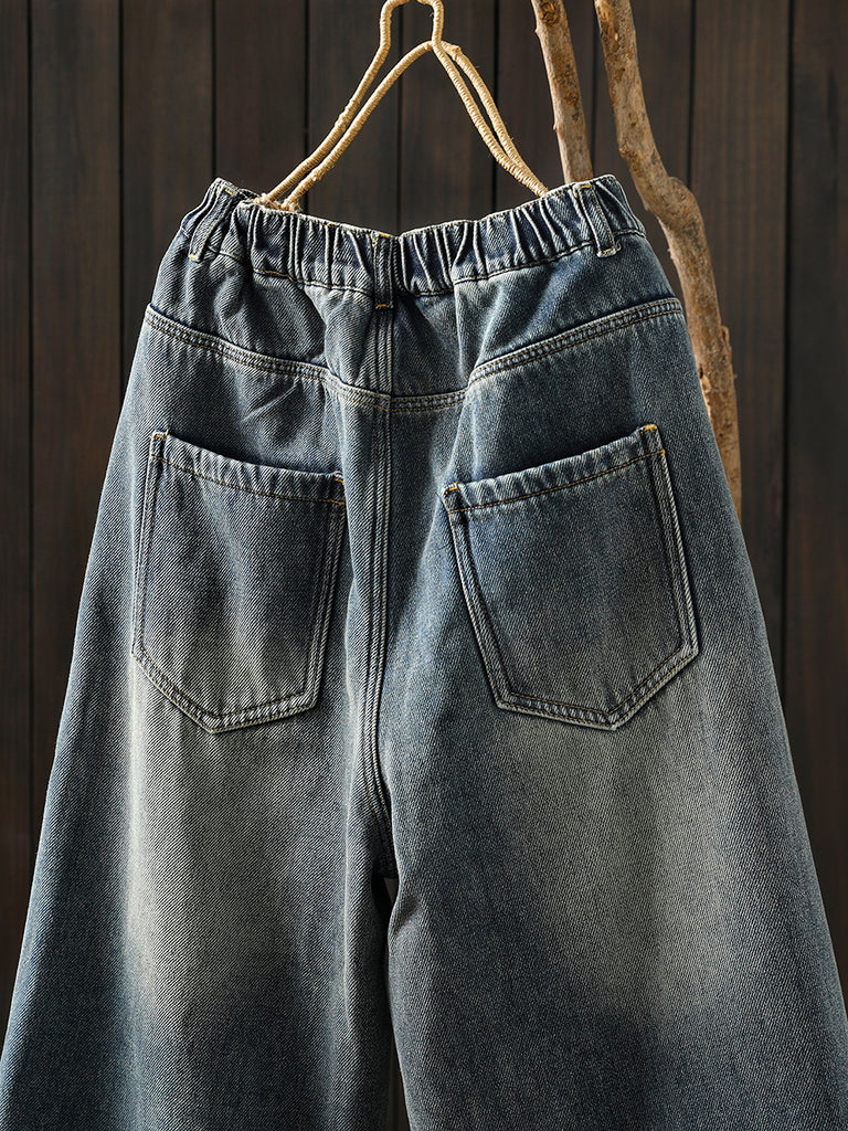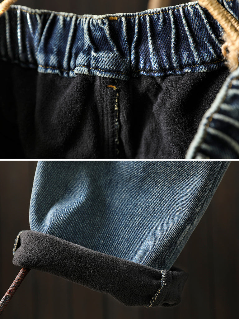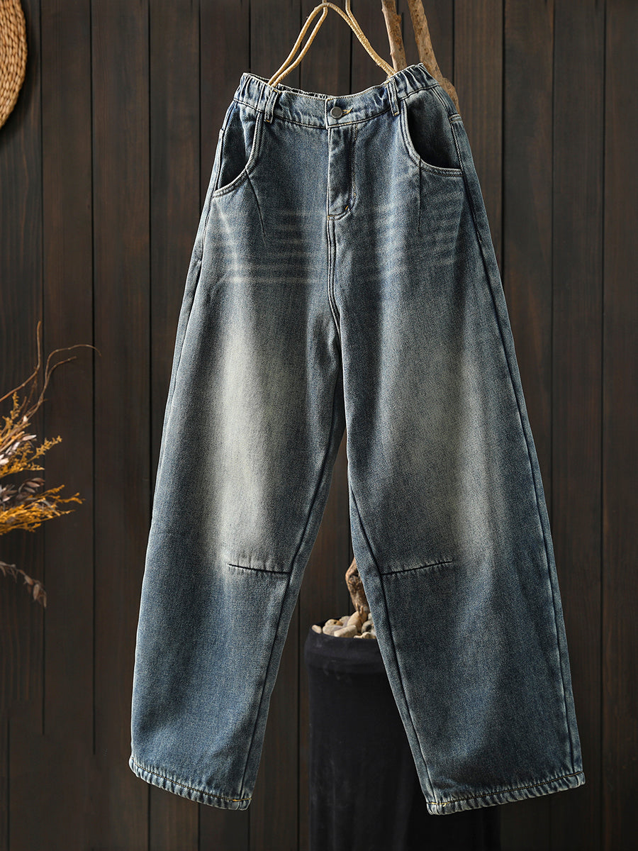 Calça feminina de inverno retrô, lisa, forrada com lã, de pernas largas.