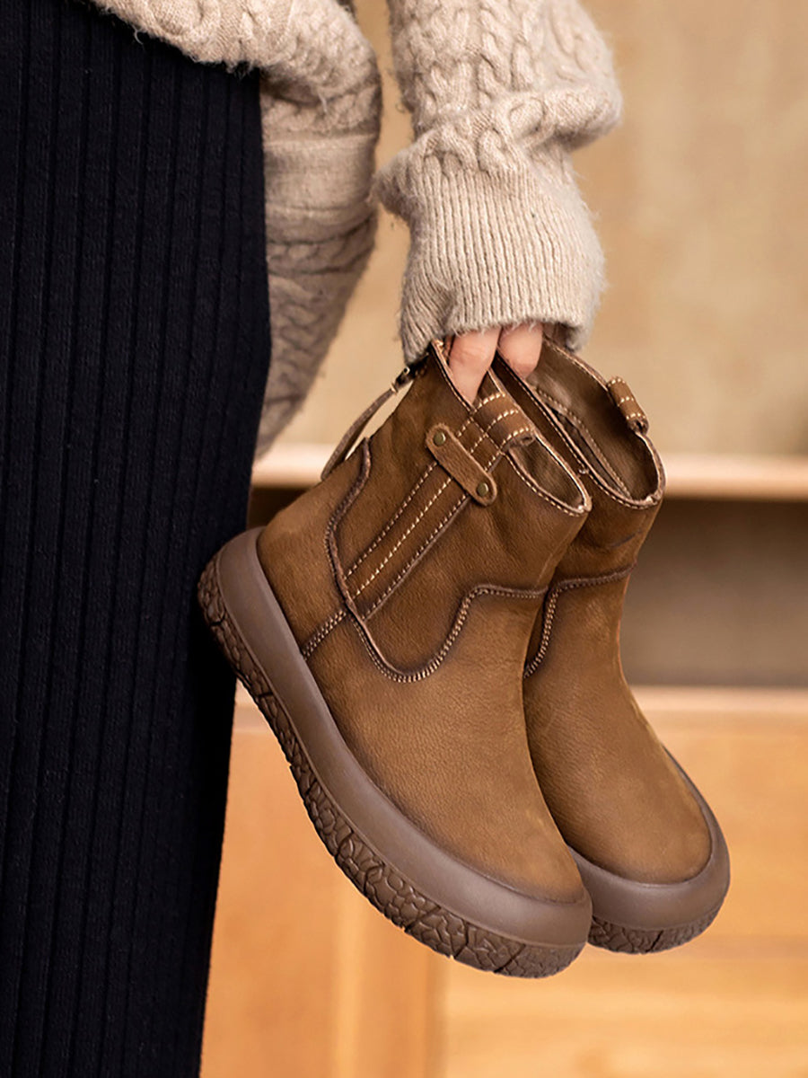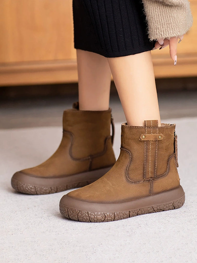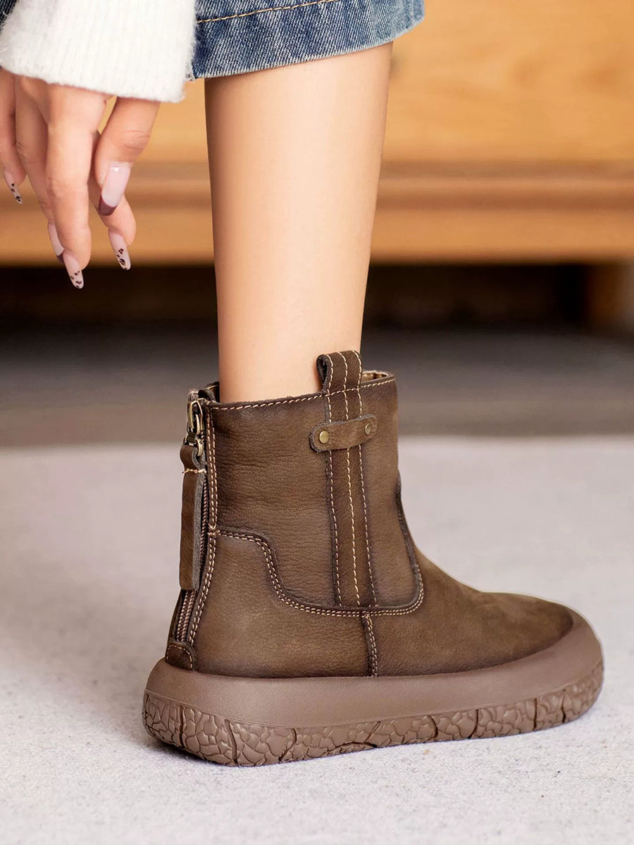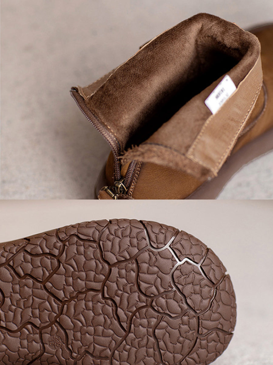 Botas de cano curto femininas retrô de inverno em couro com forro de lã