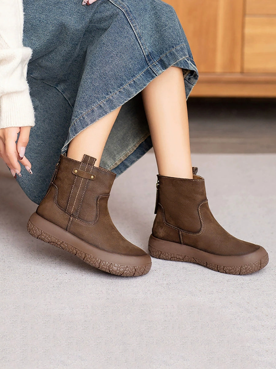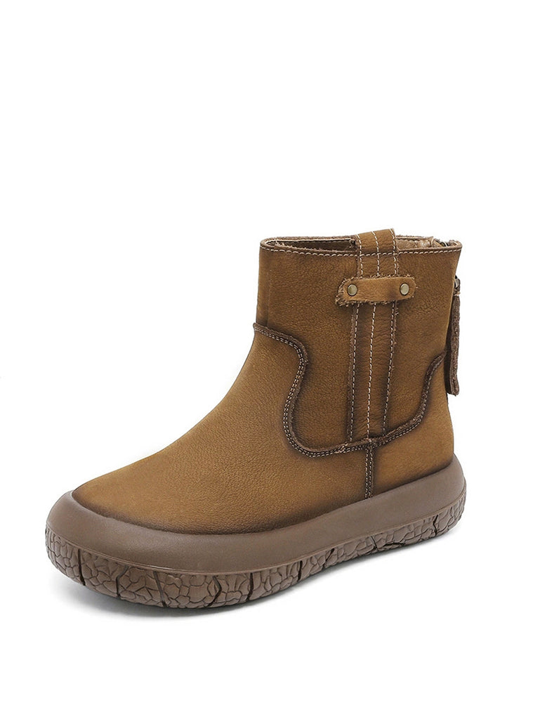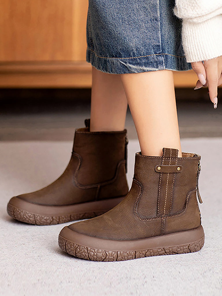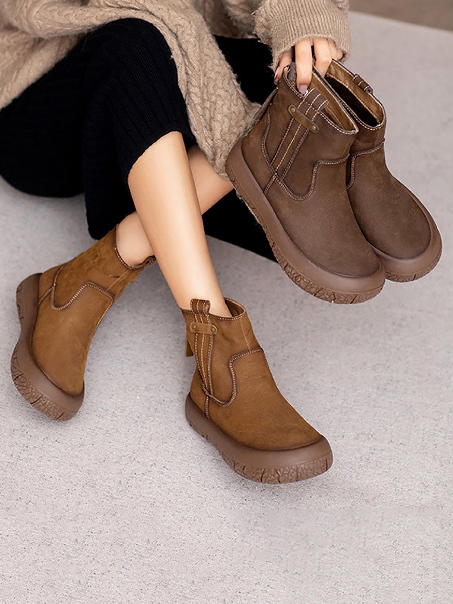 Botas de cano curto femininas retrô de inverno em couro com forro de lã