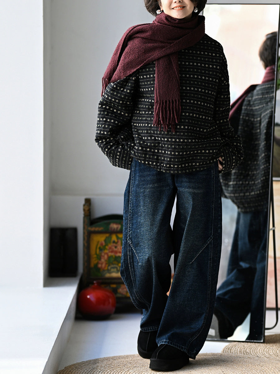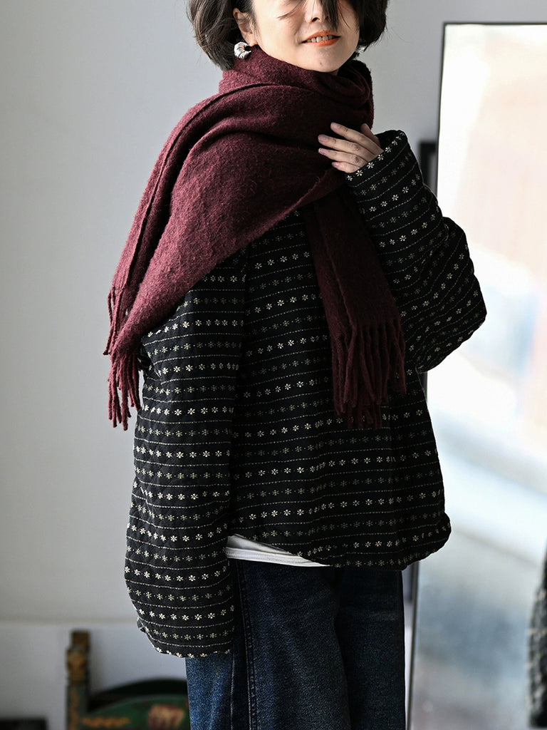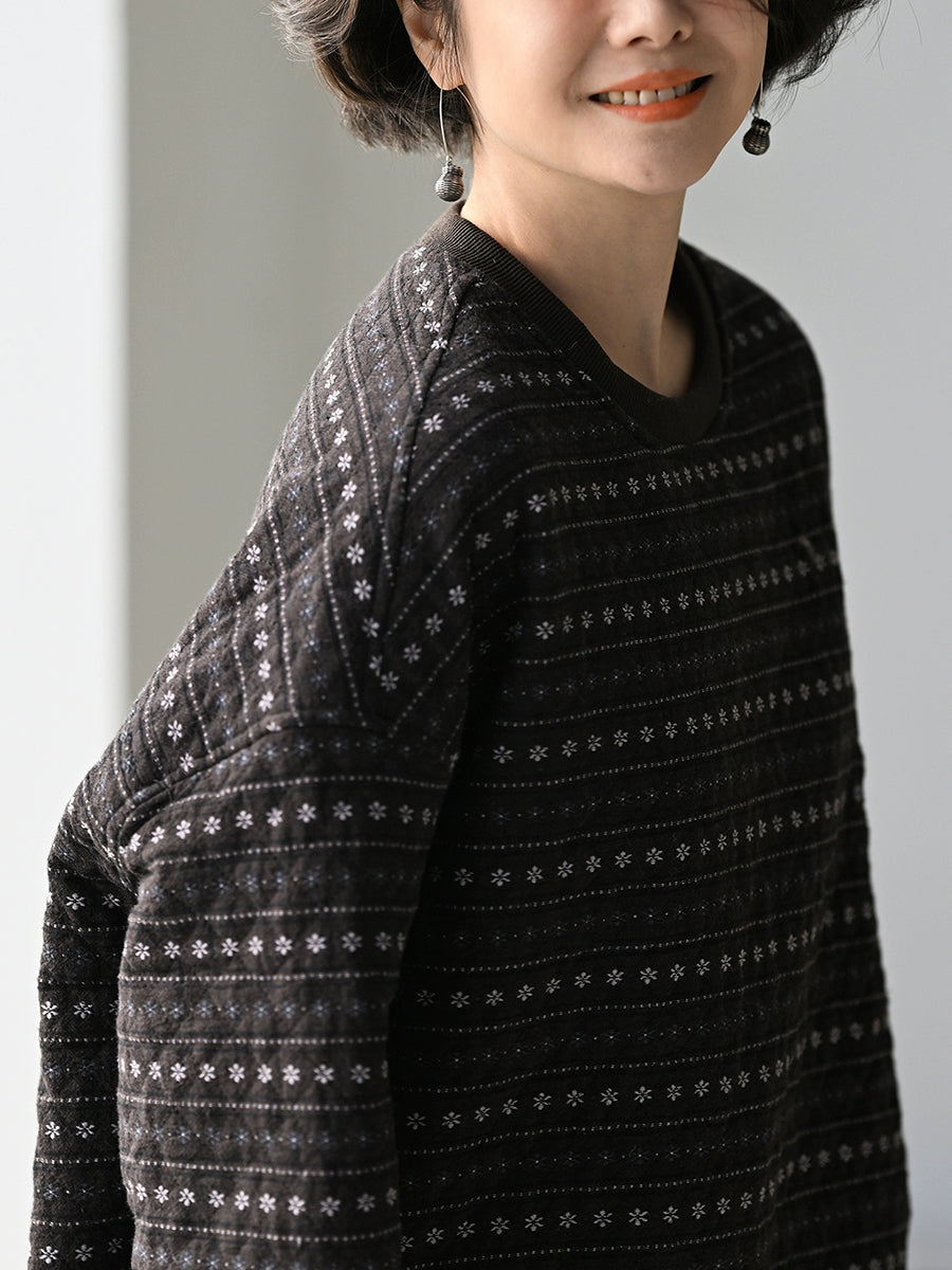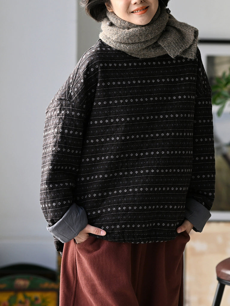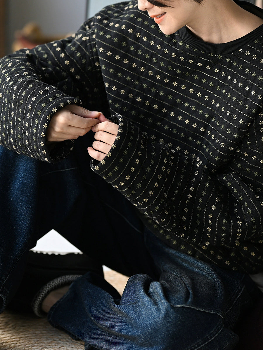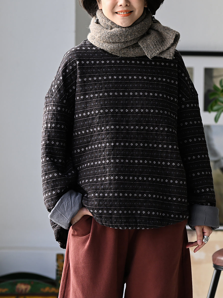 Casaco acolchoado feminino de inverno com estampa floral retrô e listras, gola redonda.