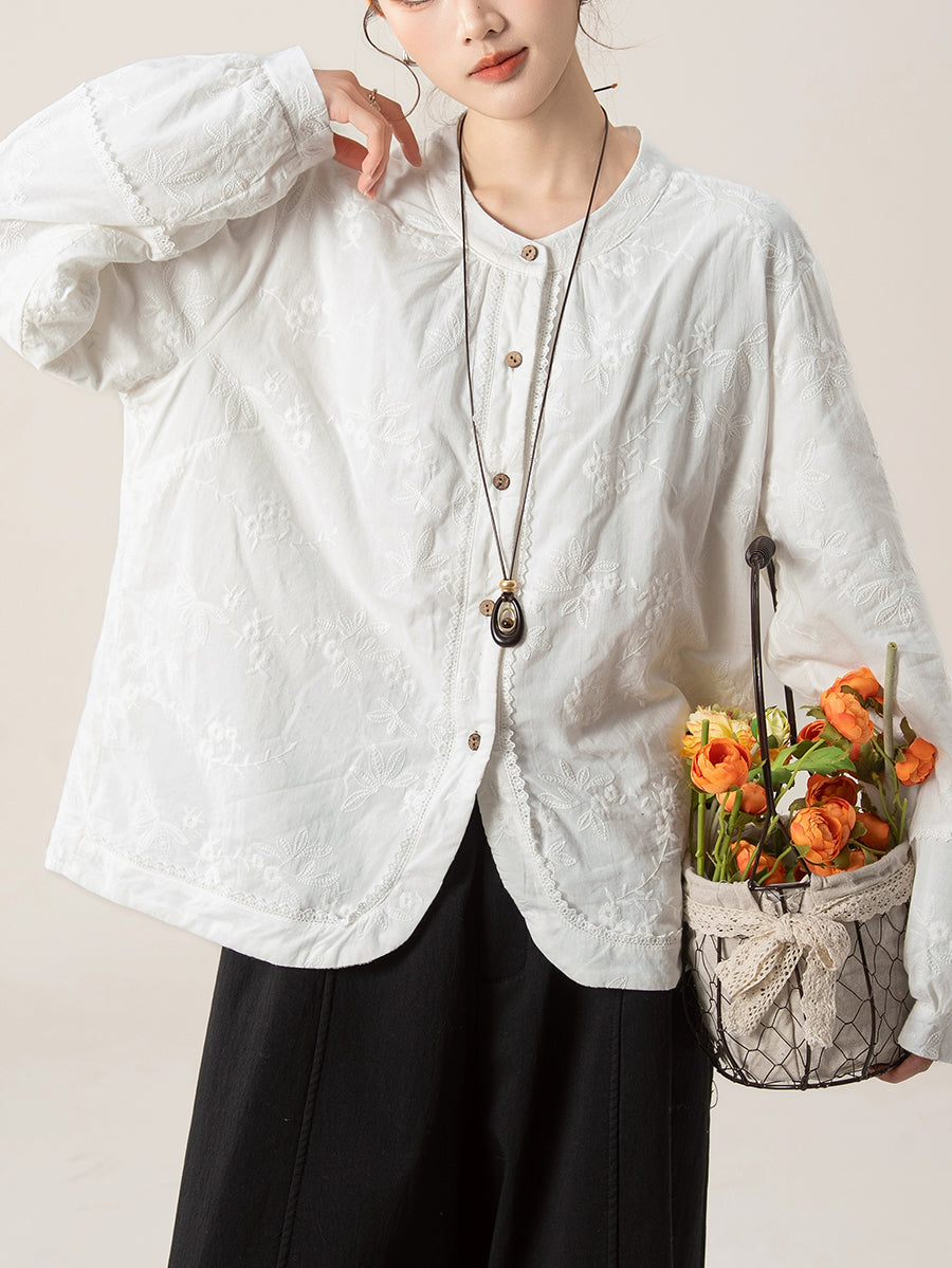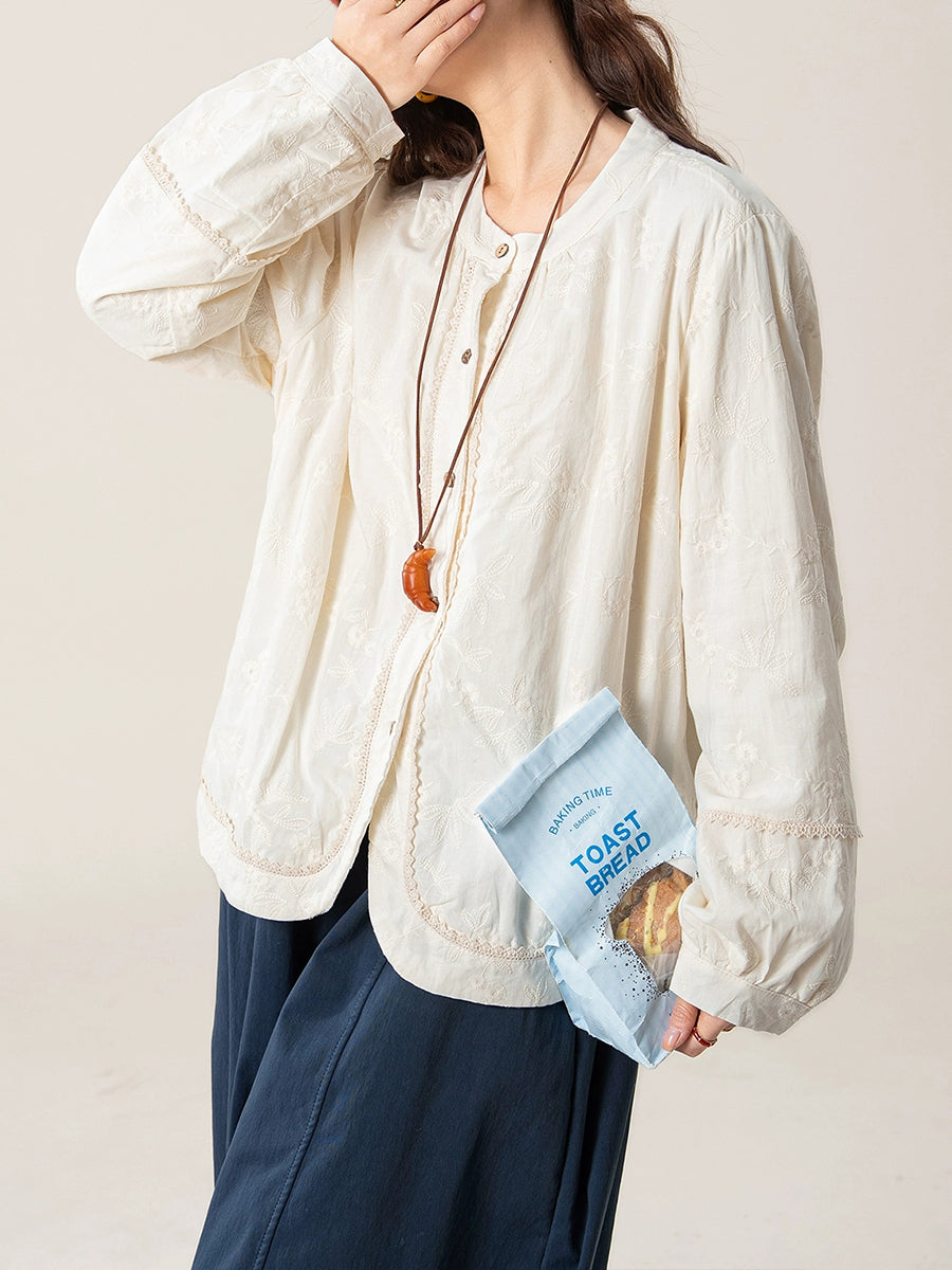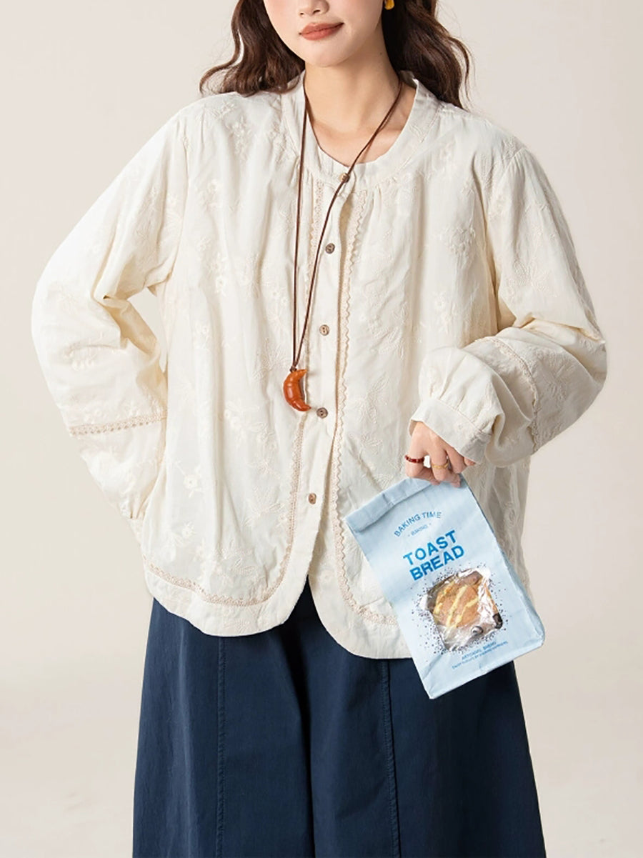Camisa feminina artística de outono com bordado e gola redonda