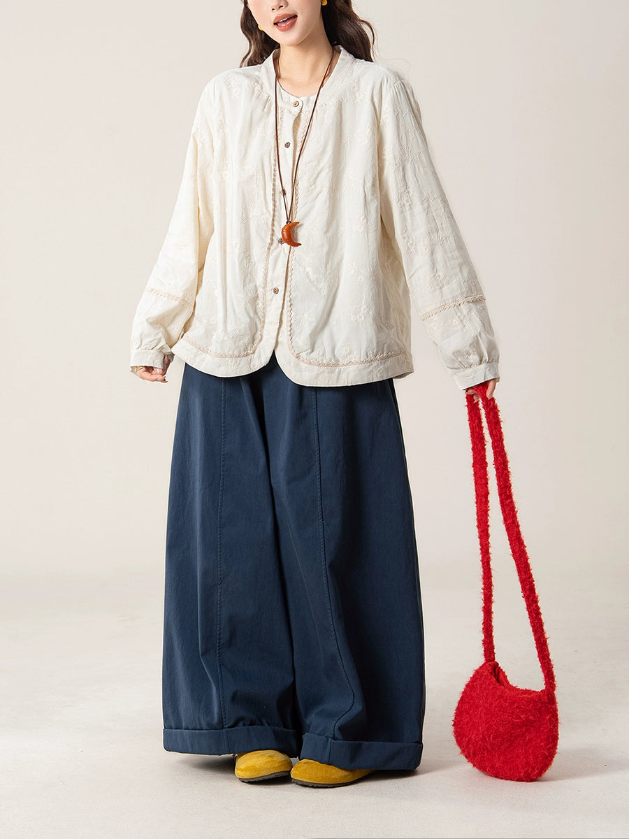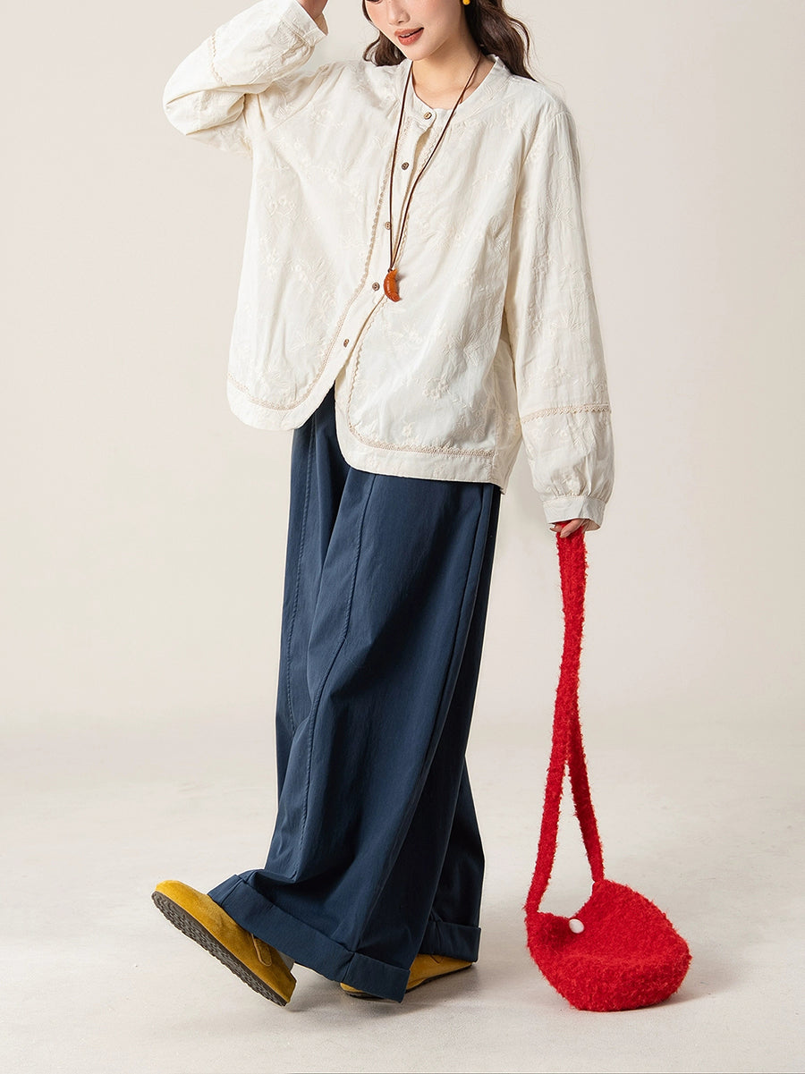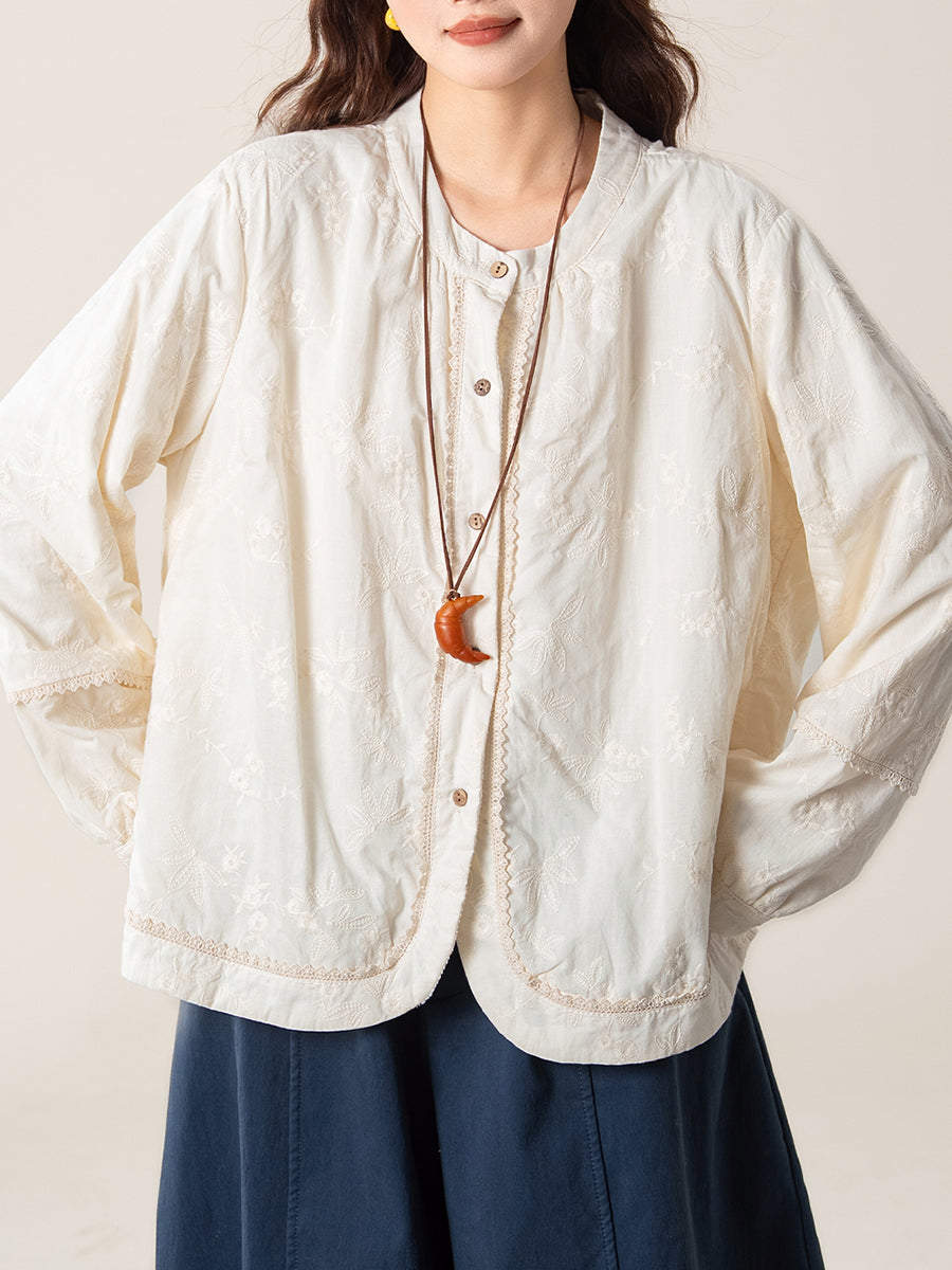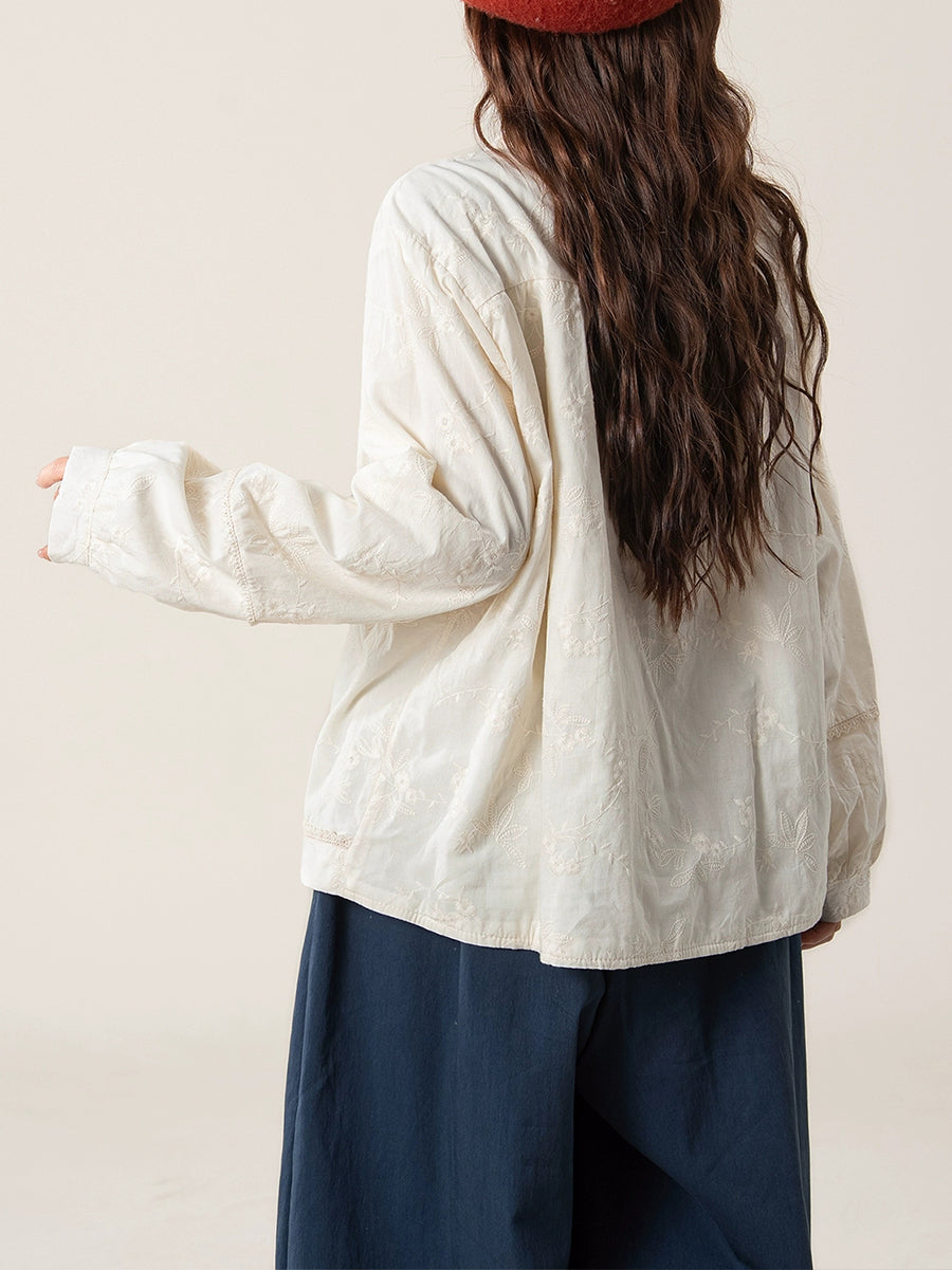 Camisa feminina artística de outono com bordado e gola redonda