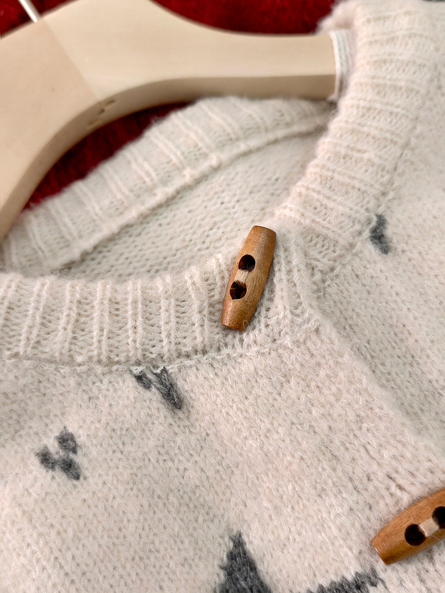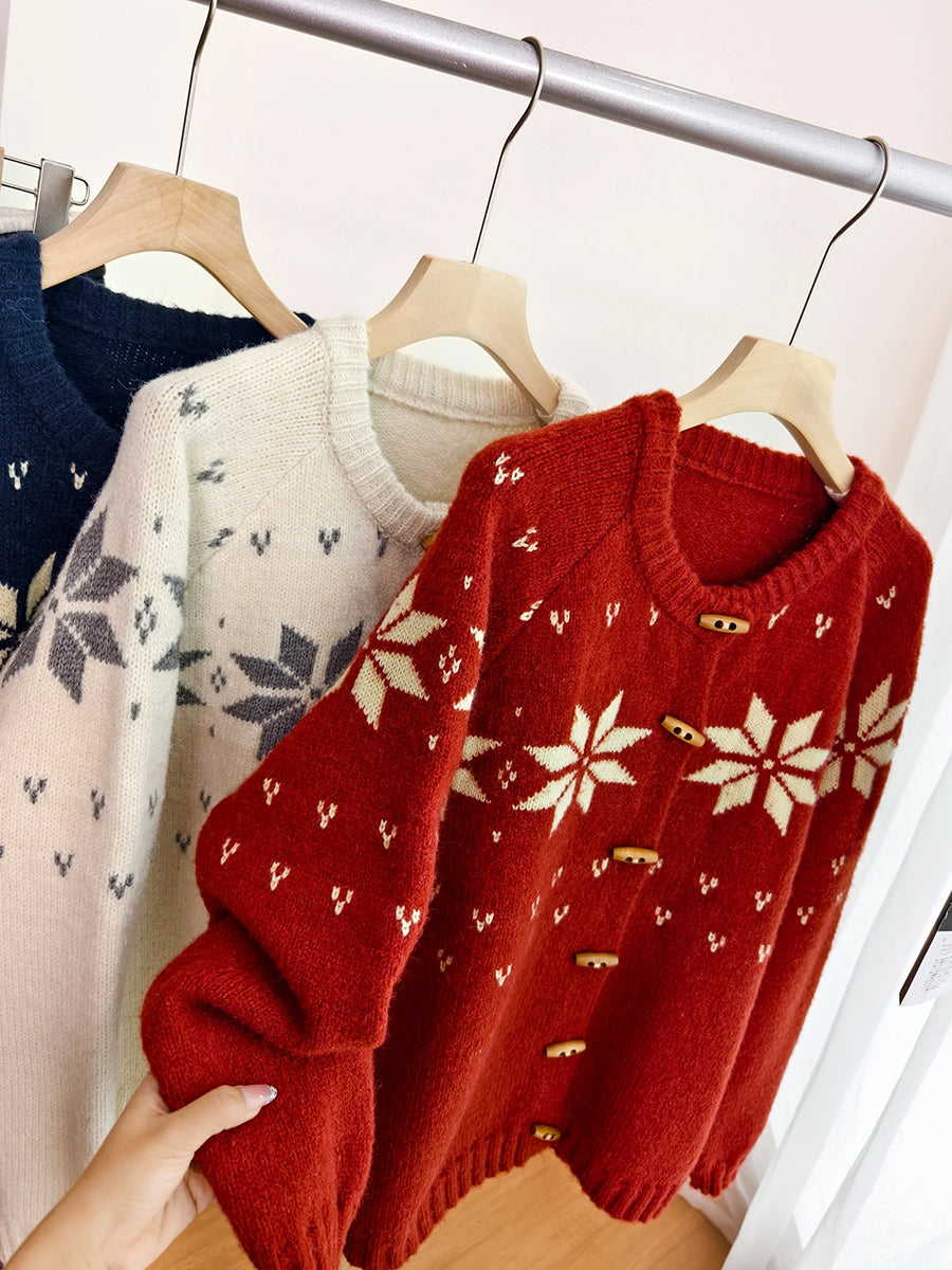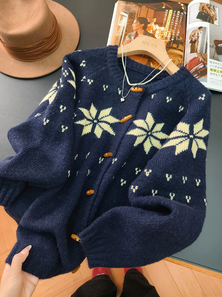 Suéter feminino de tricô com estampa floral artística de outono e gola redonda.