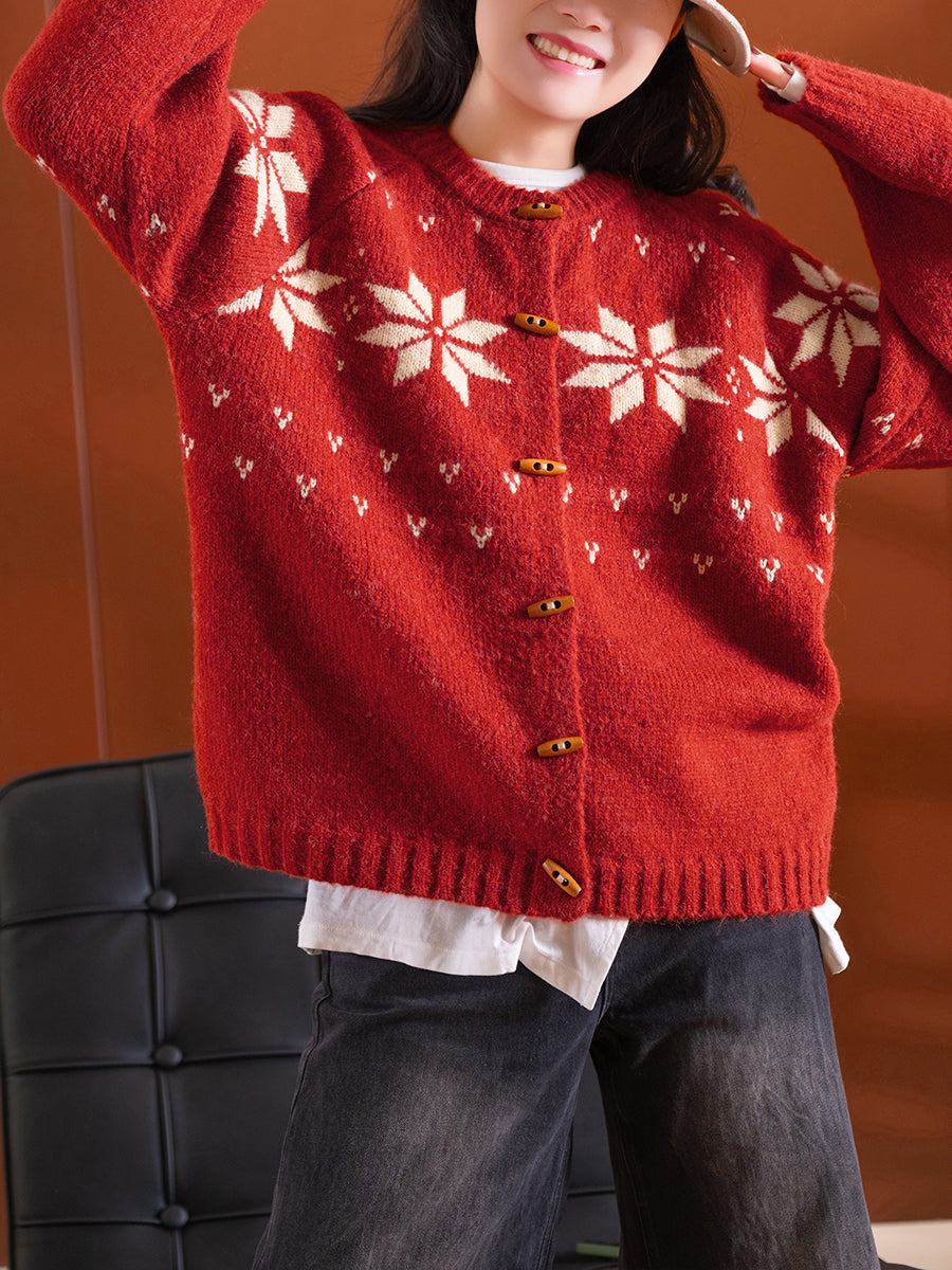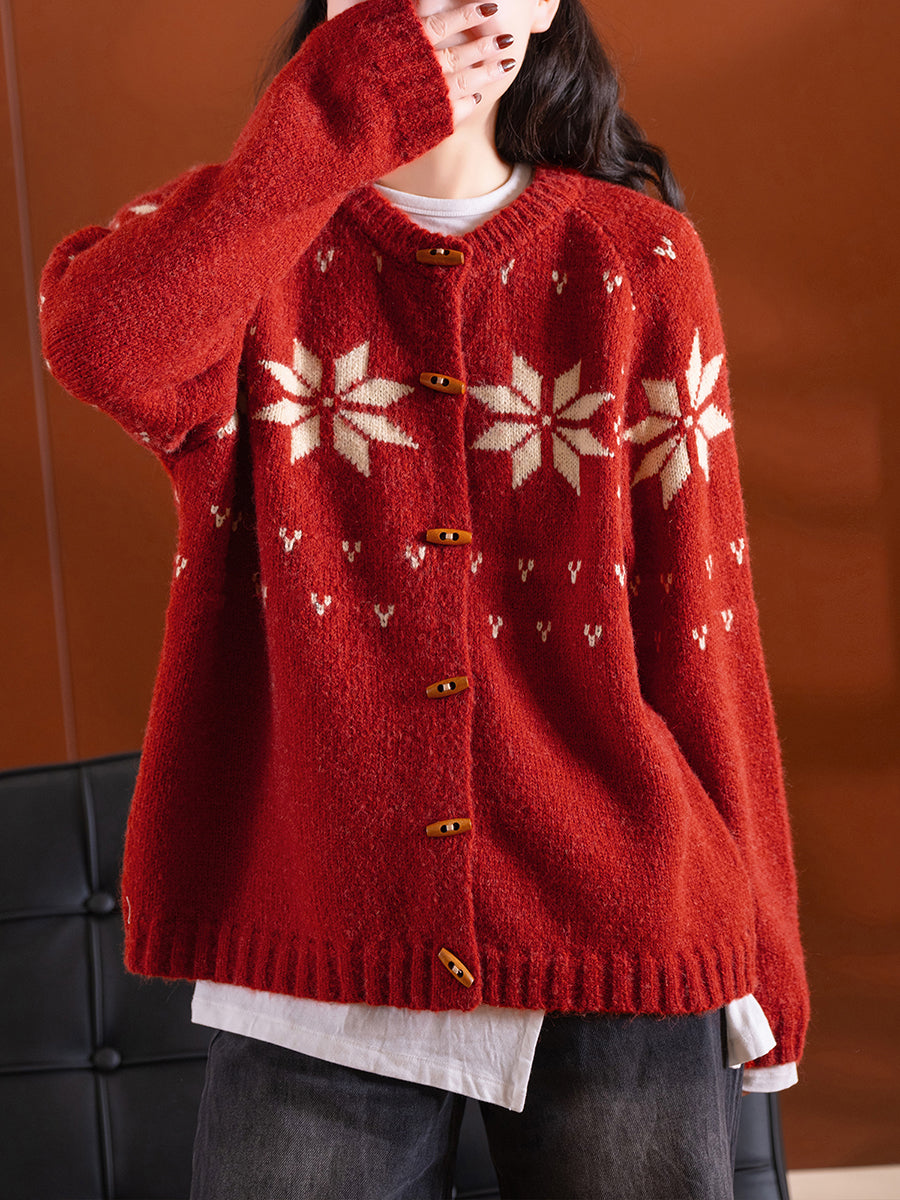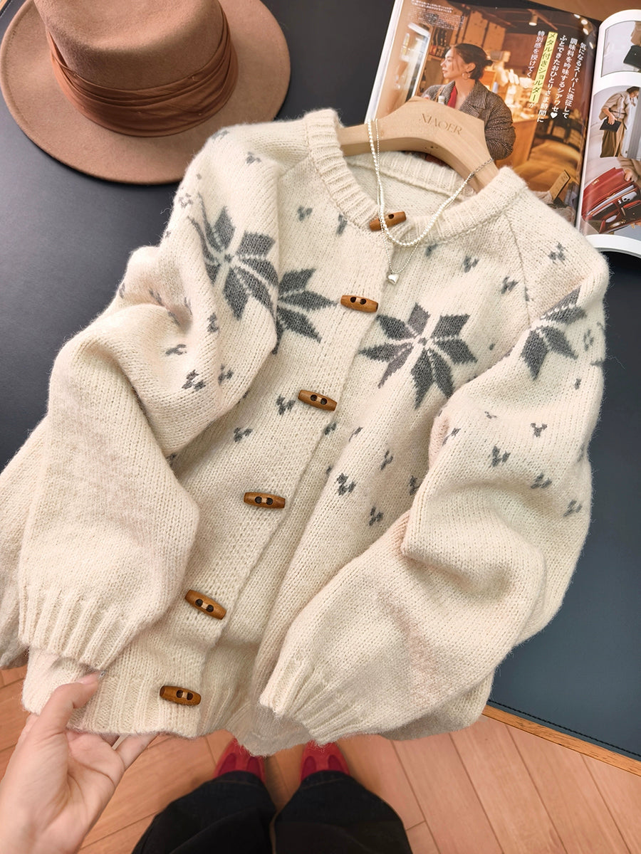 Suéter feminino de tricô com estampa floral artística de outono e gola redonda.