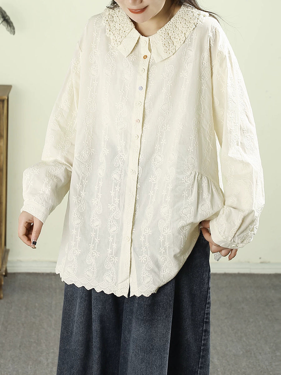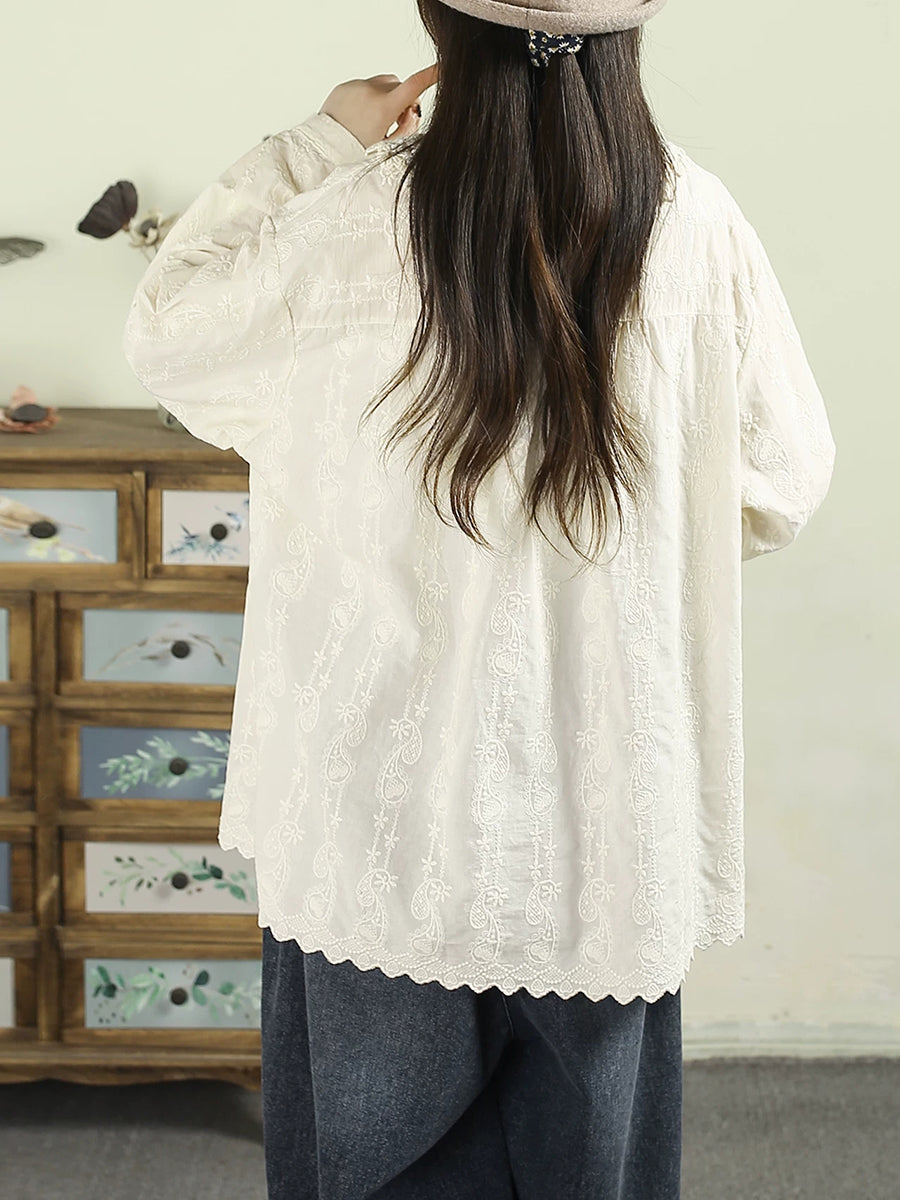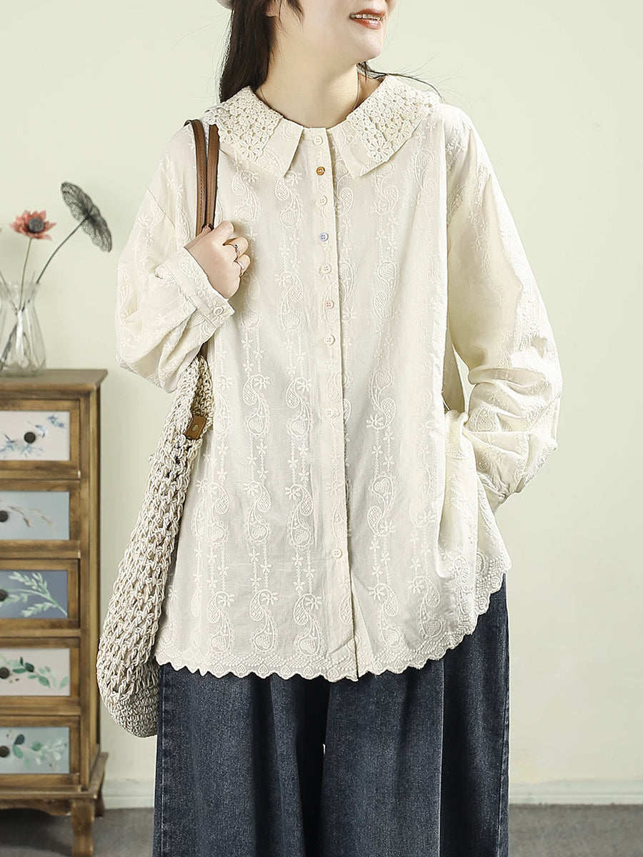Camisa feminina artística de outono com bordado, 100% algodão.