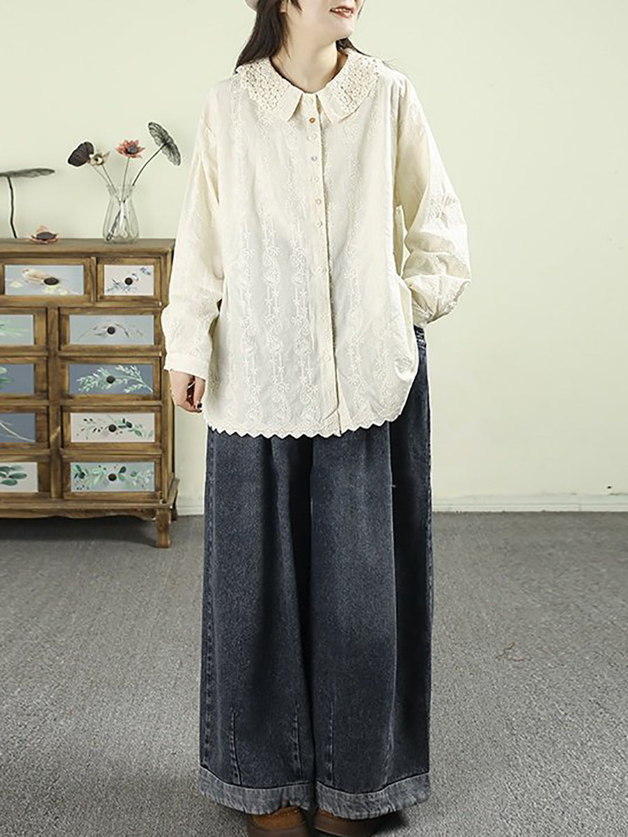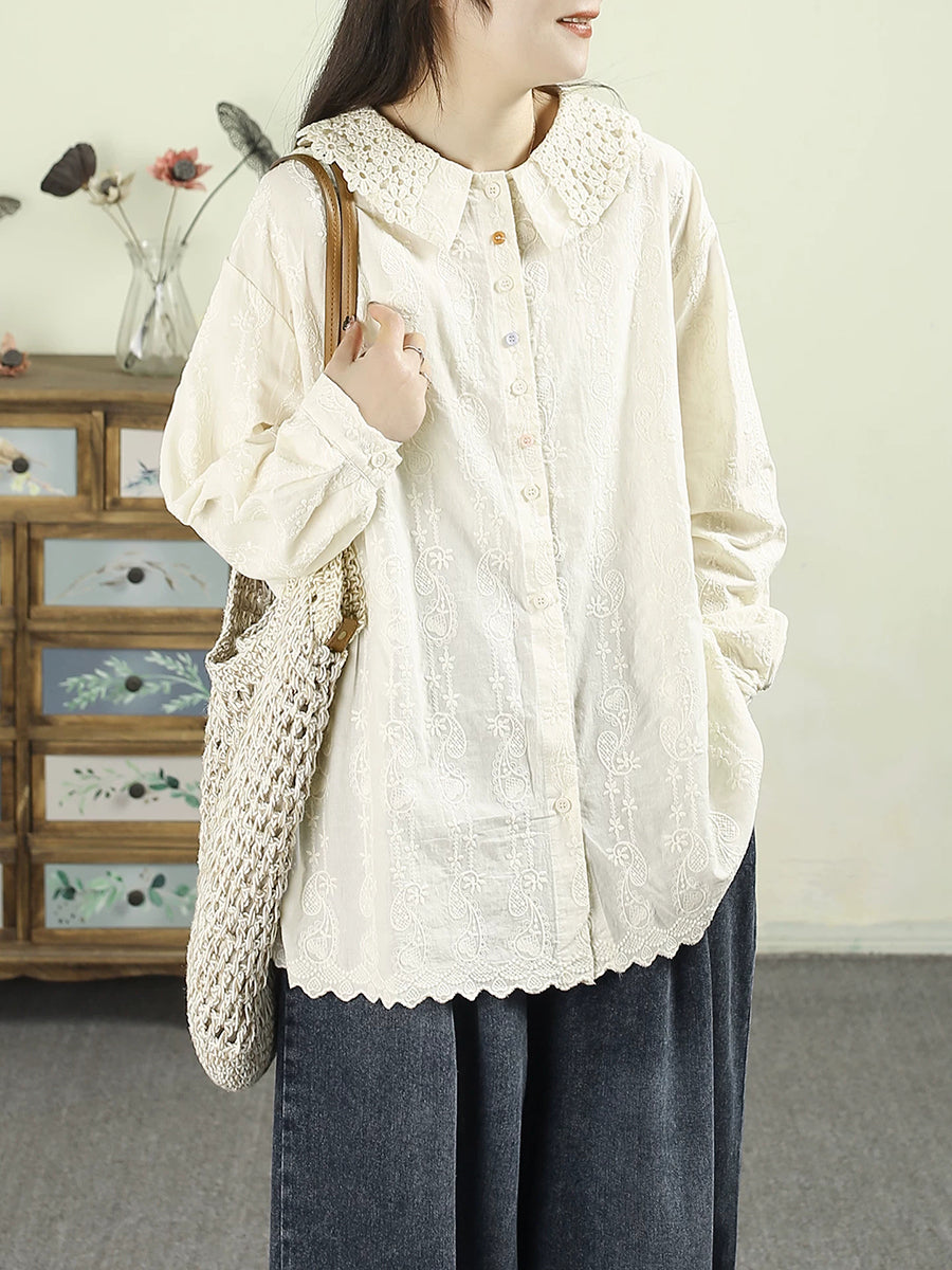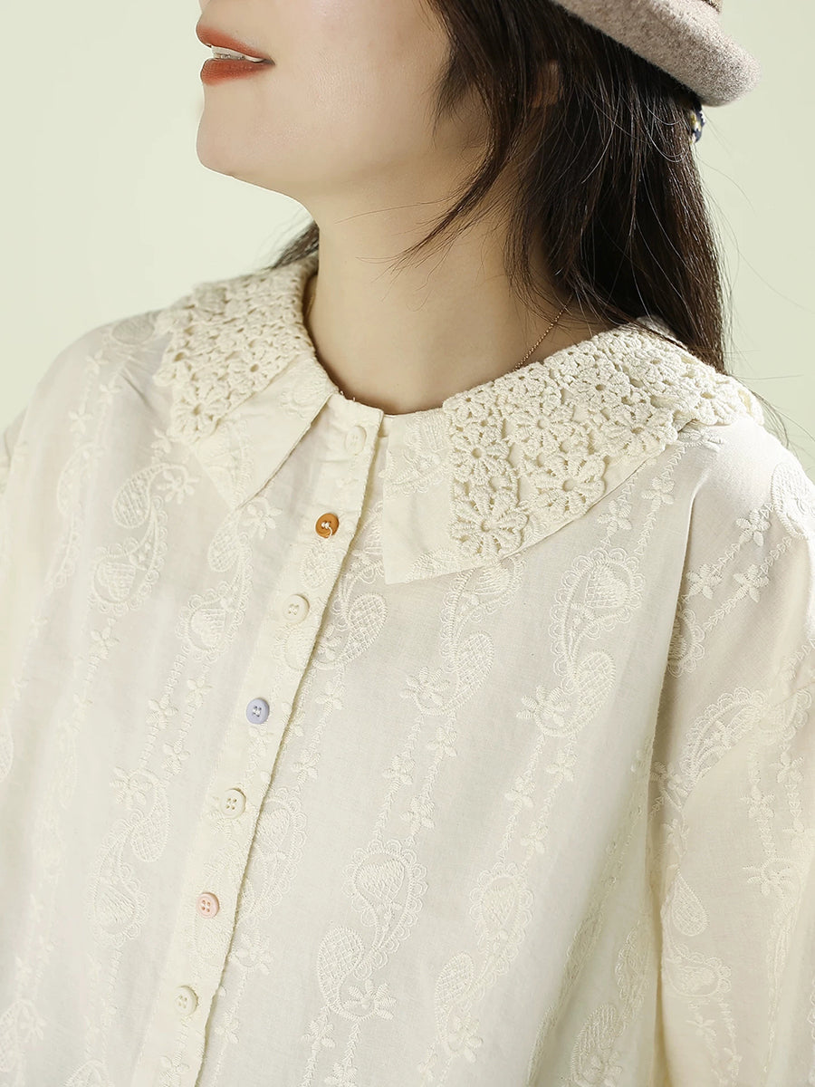 Camisa feminina artística de outono com bordado, 100% algodão.