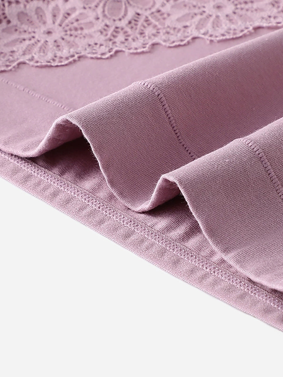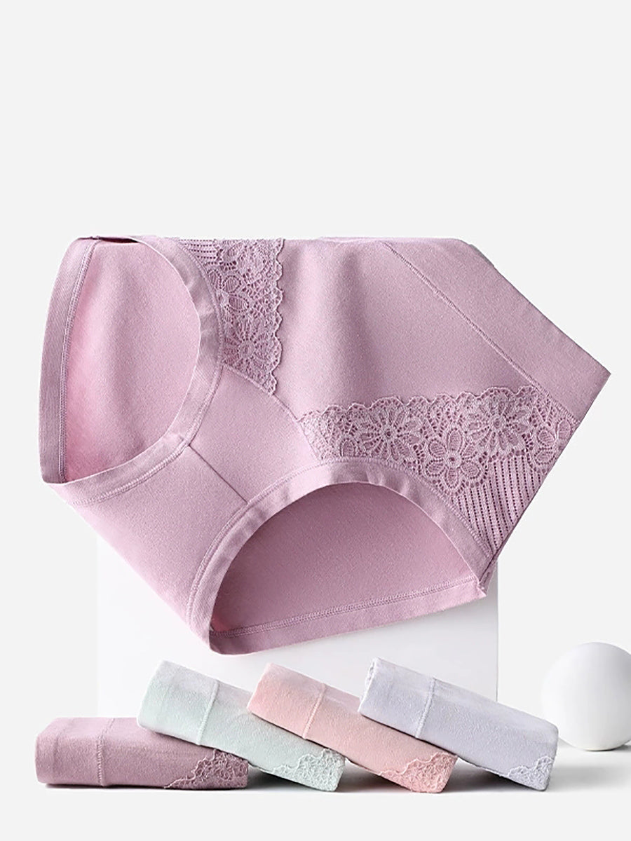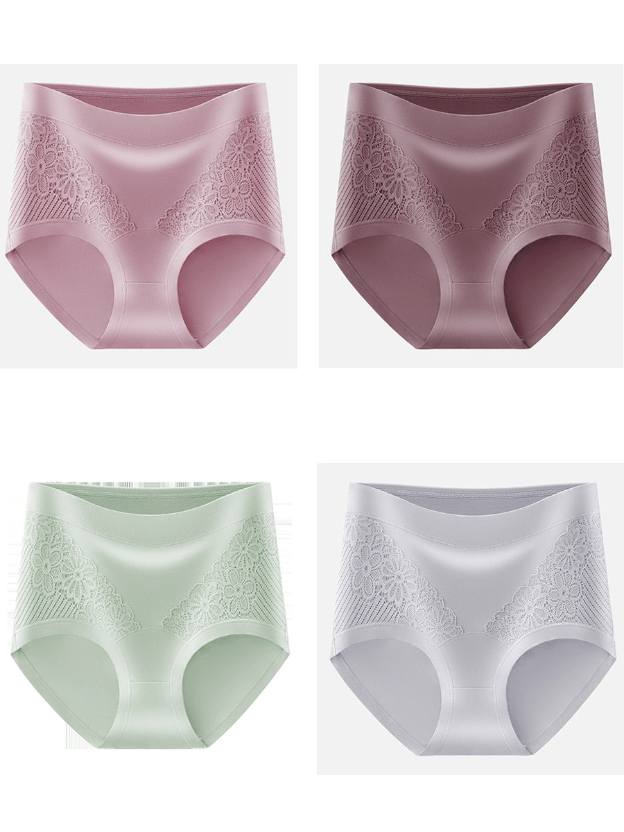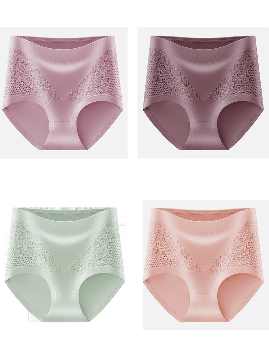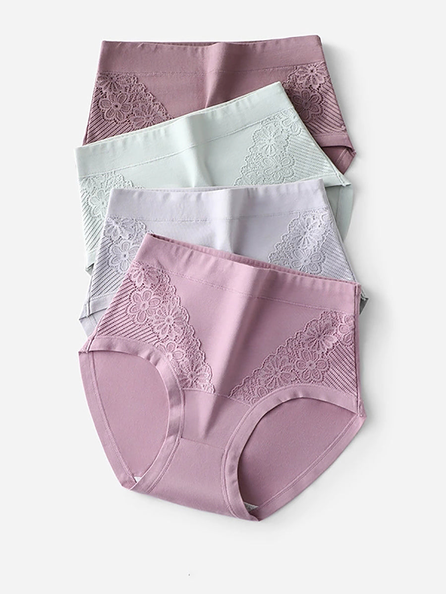 Conjunto de 4 peças de calcinha feminina de cintura alta com renda floral artística.