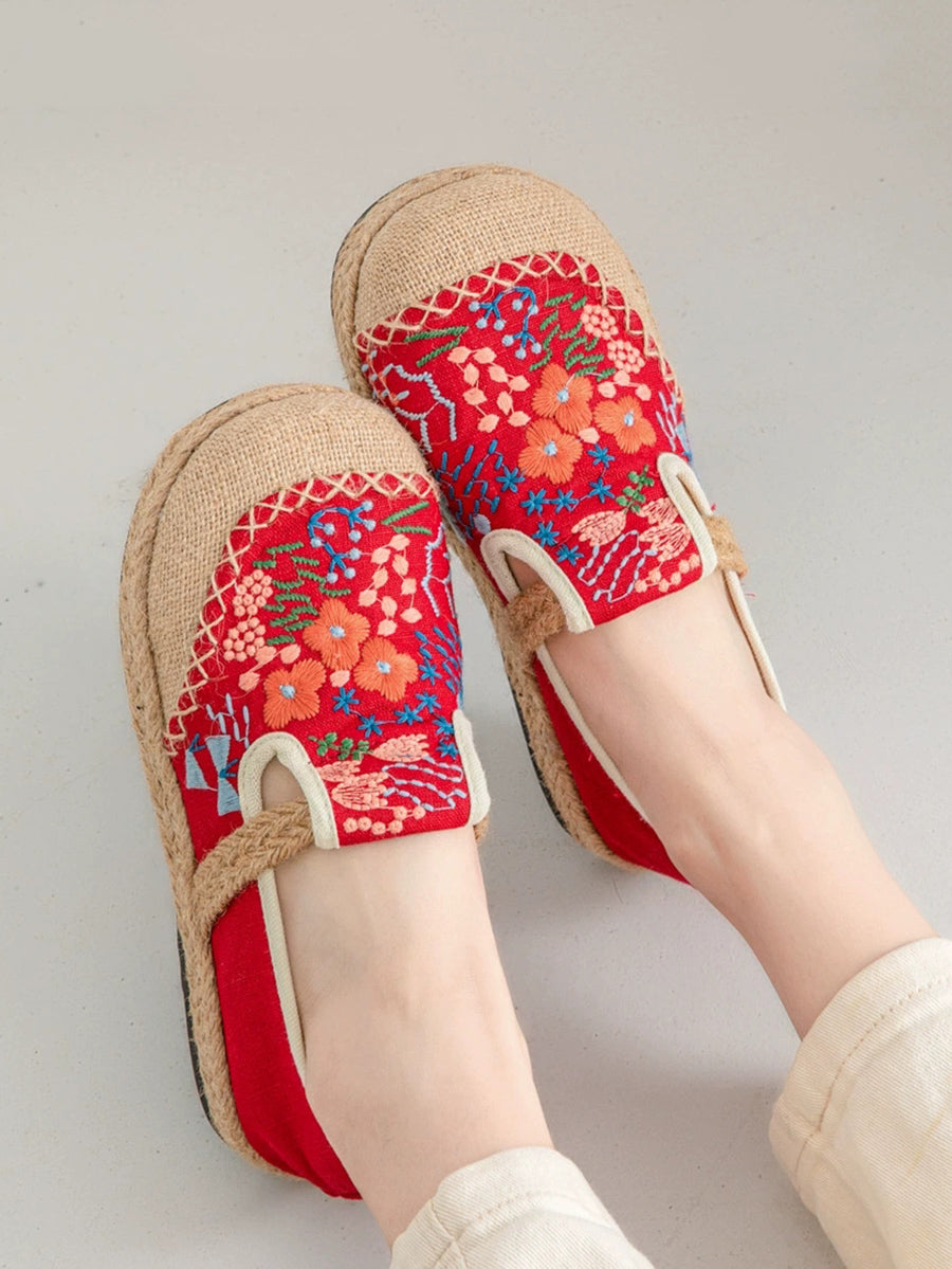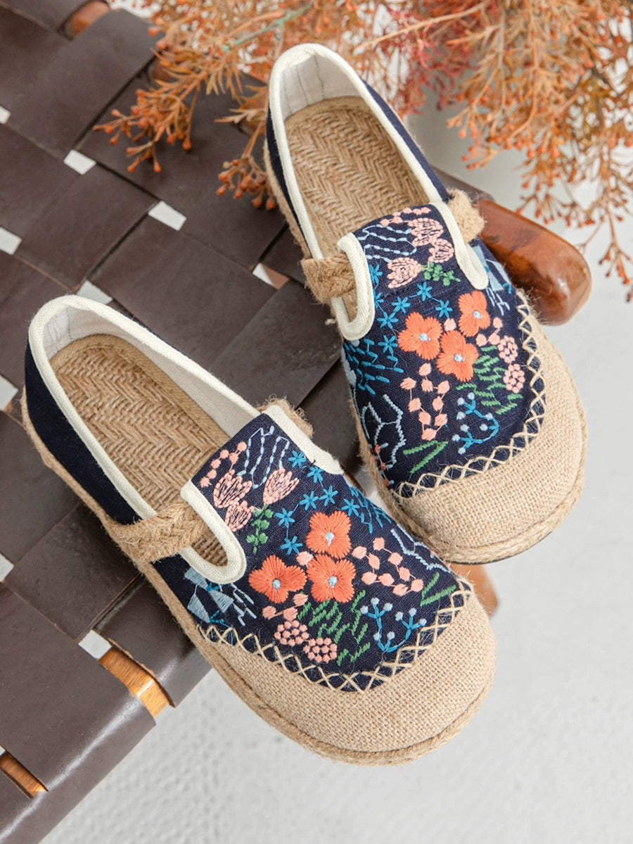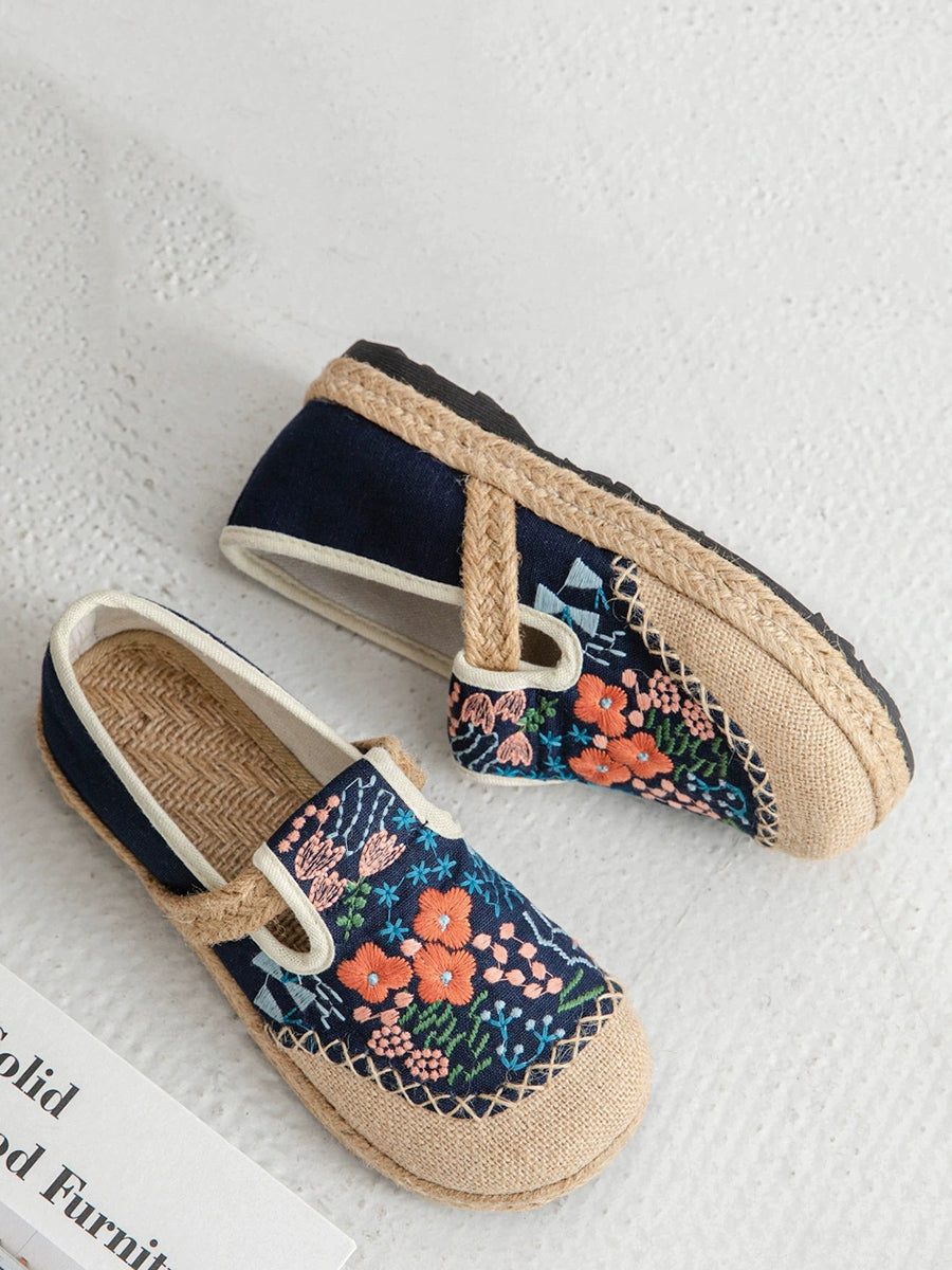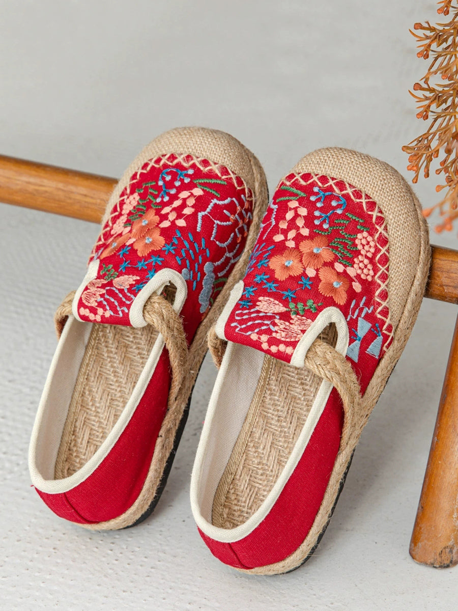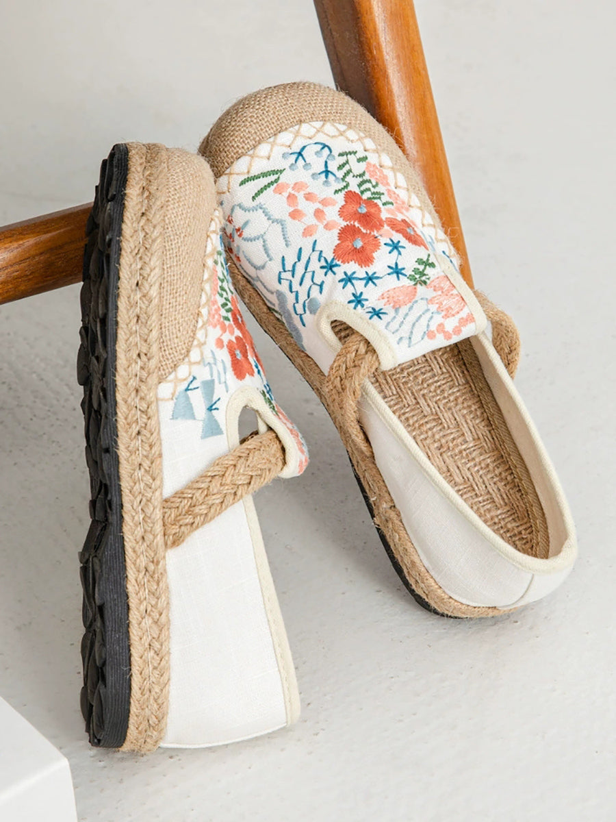Sapatos femininos de verão em linho e lona com bordado étnico de flores