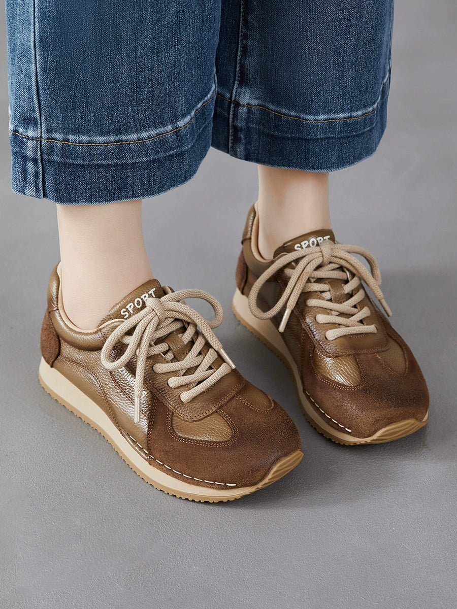Tênis esportivo feminino de primavera em couro legítimo com detalhes em patchwork