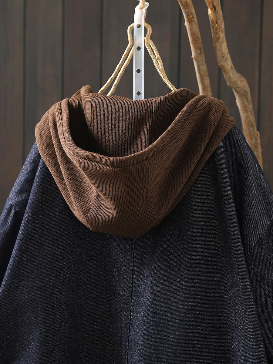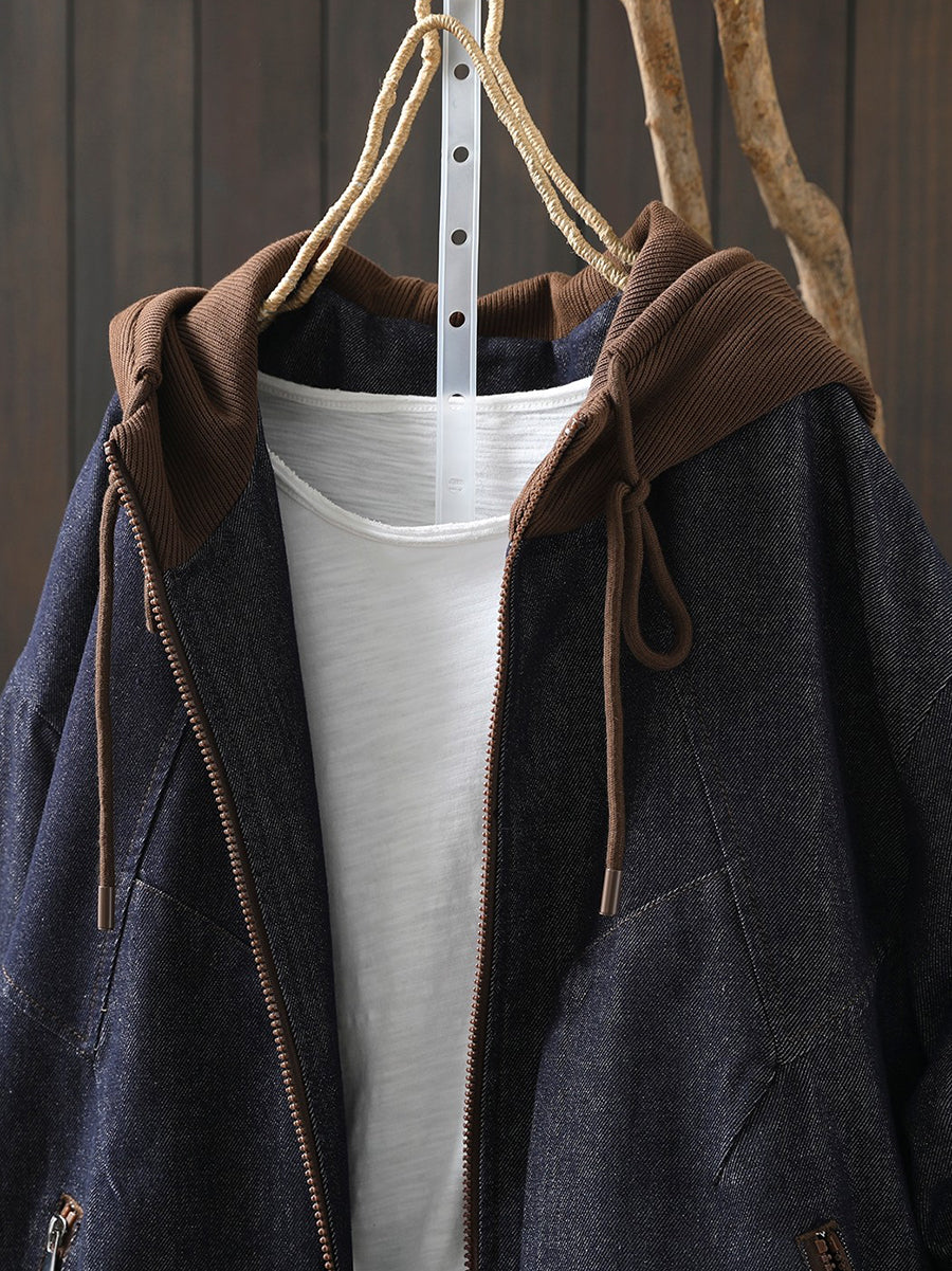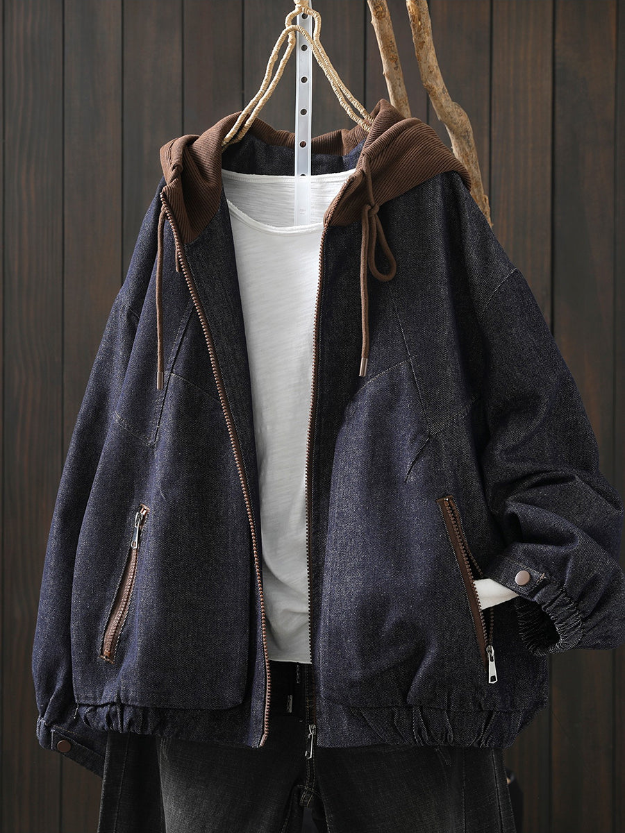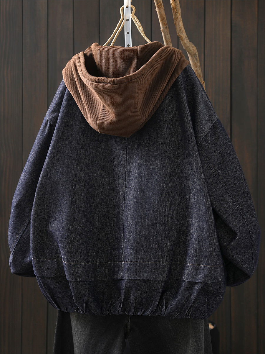 Jaqueta jeans feminina com capuz e blocos de cores retrô para a primavera