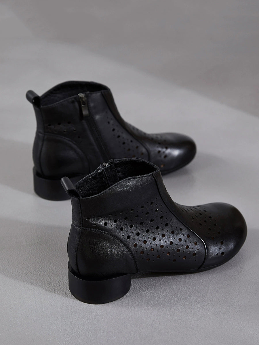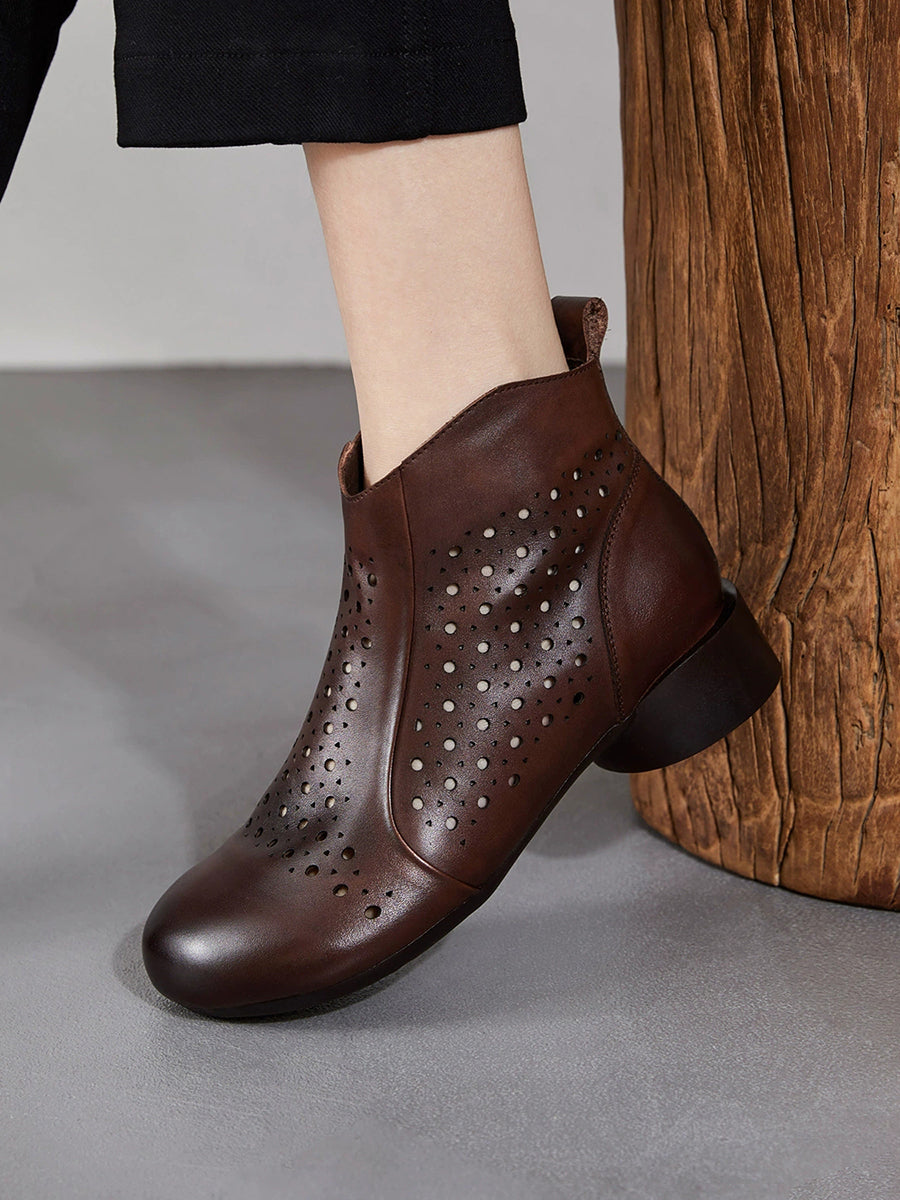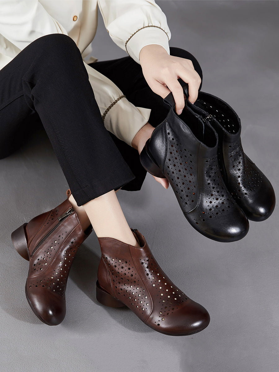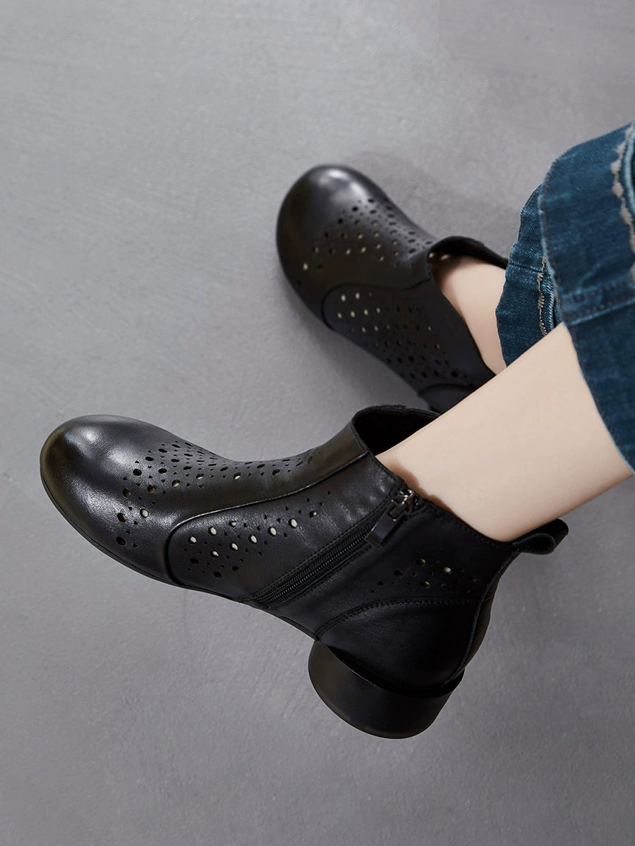 Botas femininas de couro legítimo com salto baixo e detalhes vazados