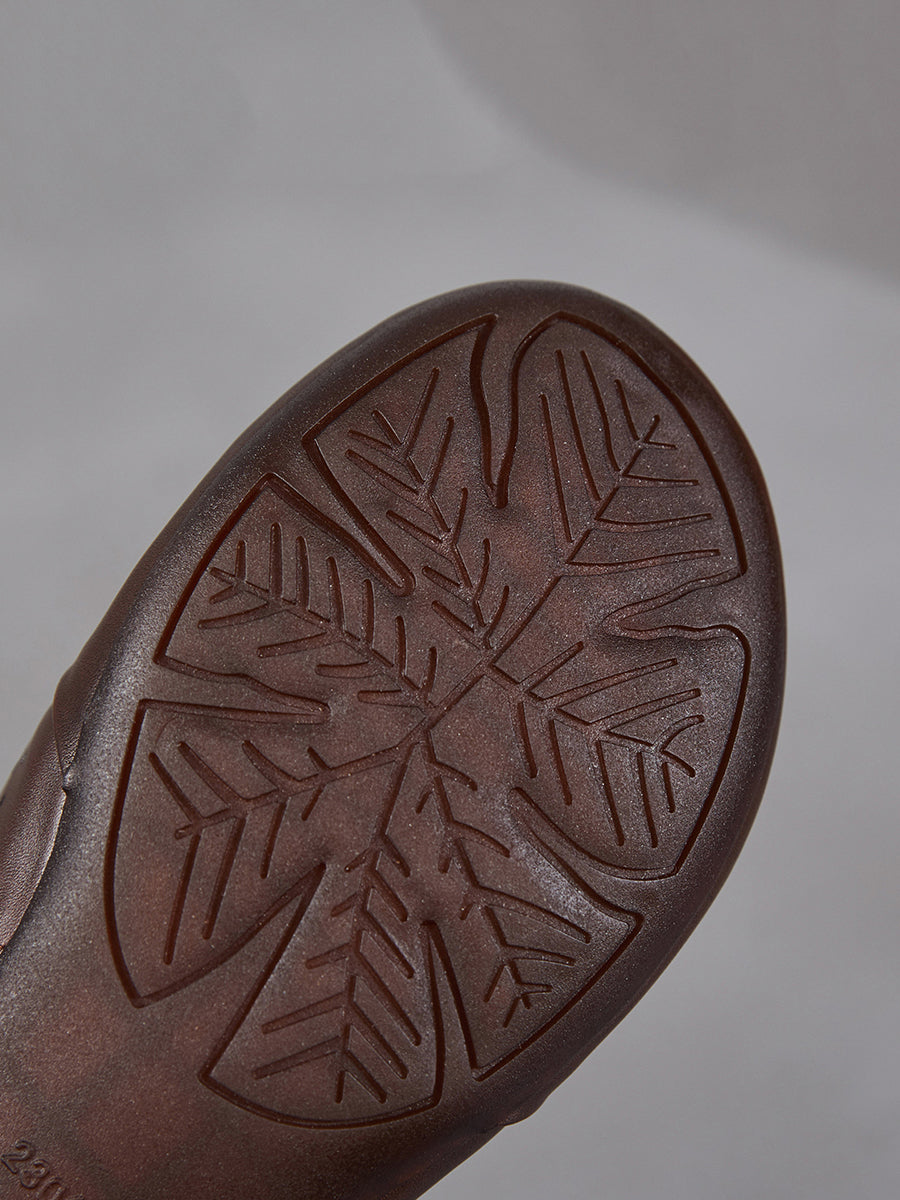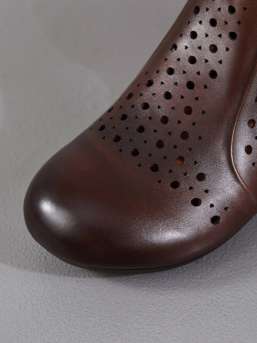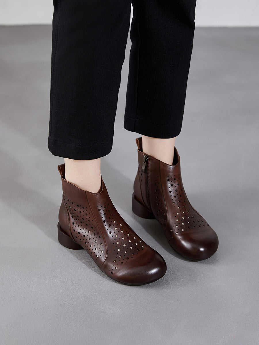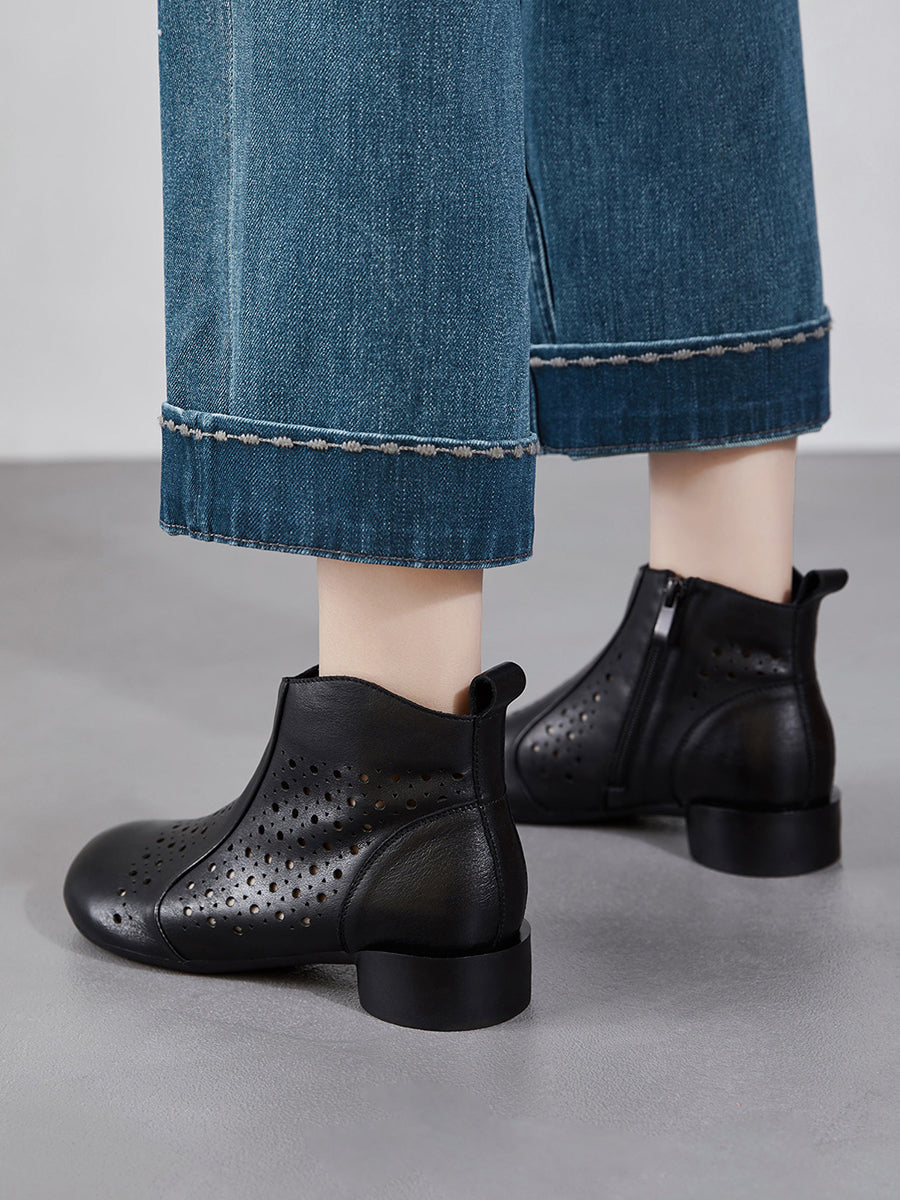 Botas femininas de couro legítimo com salto baixo e detalhes vazados