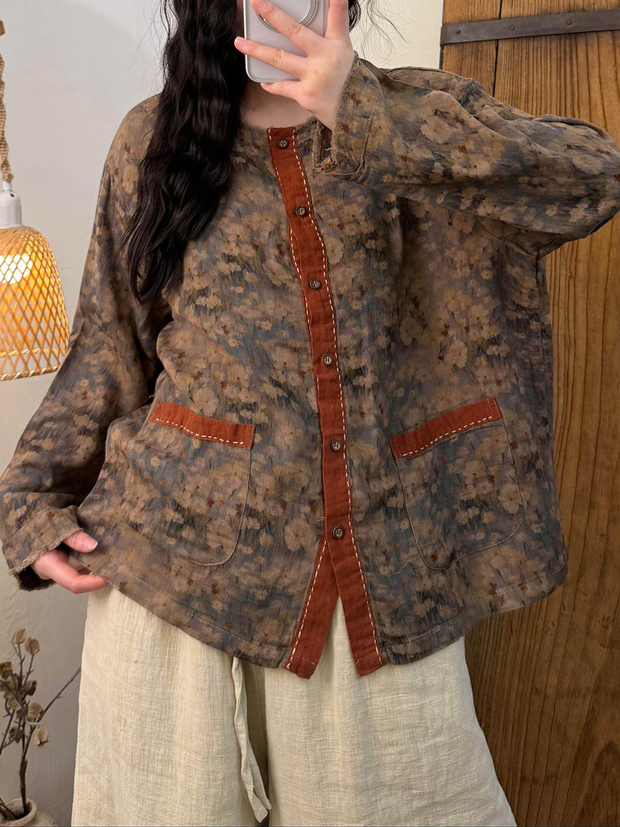 Camisa feminina vintage de primavera com estampa floral e gola redonda