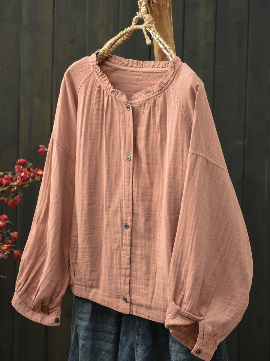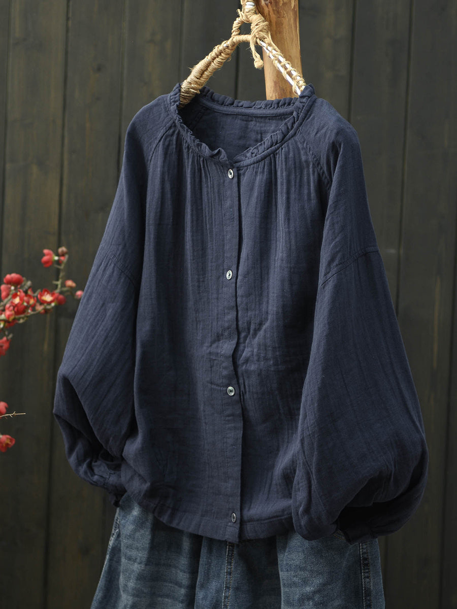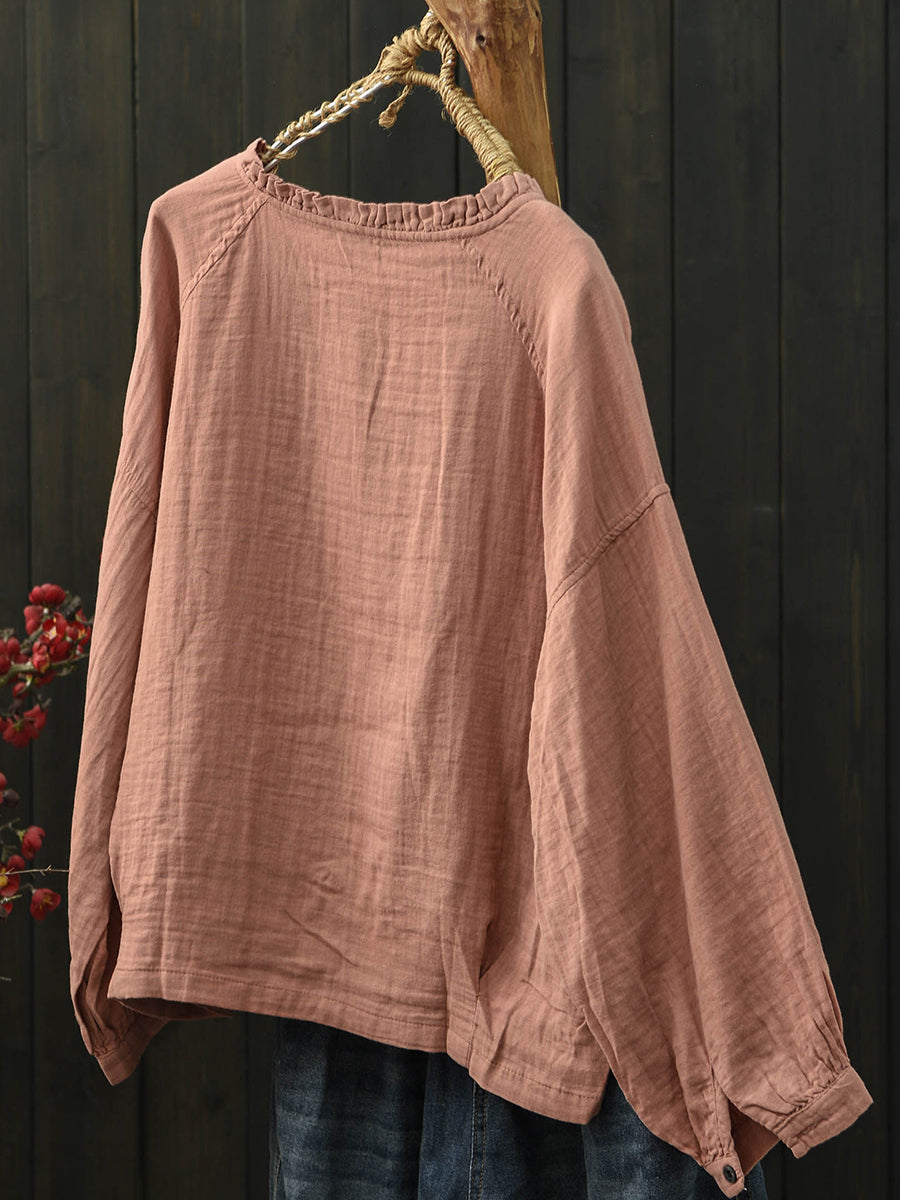 Camisa feminina de algodão com gola alta, estampa artística de primavera em cores sólidas.