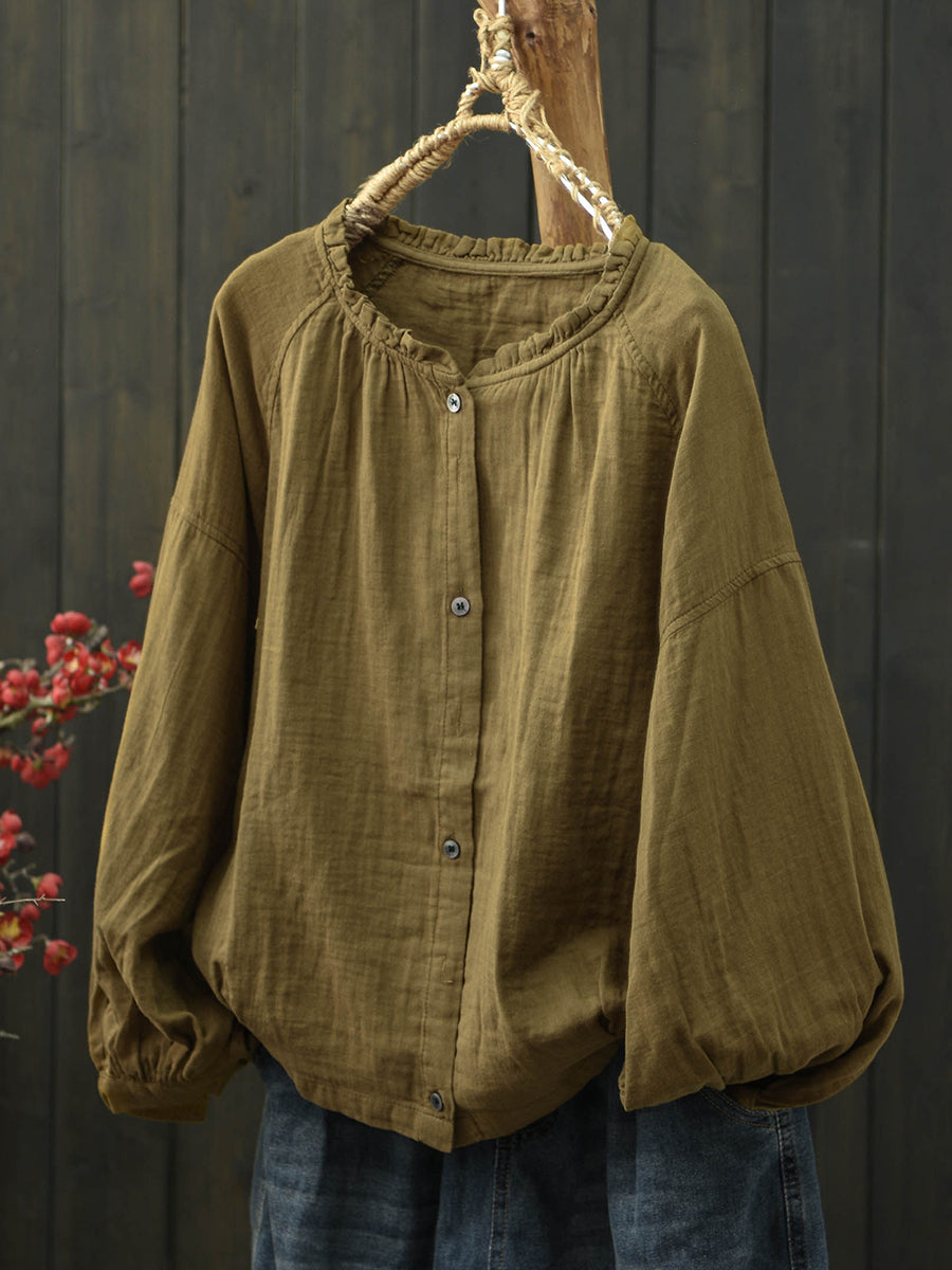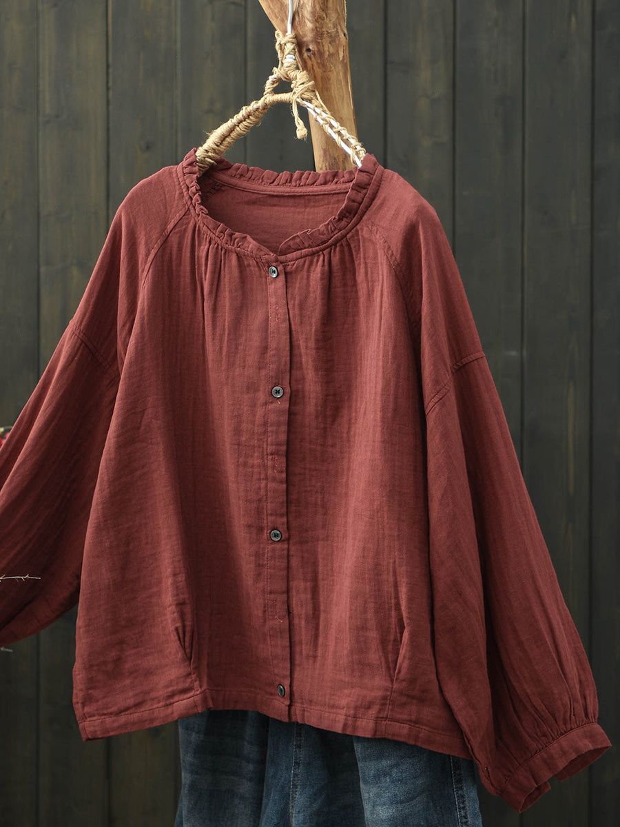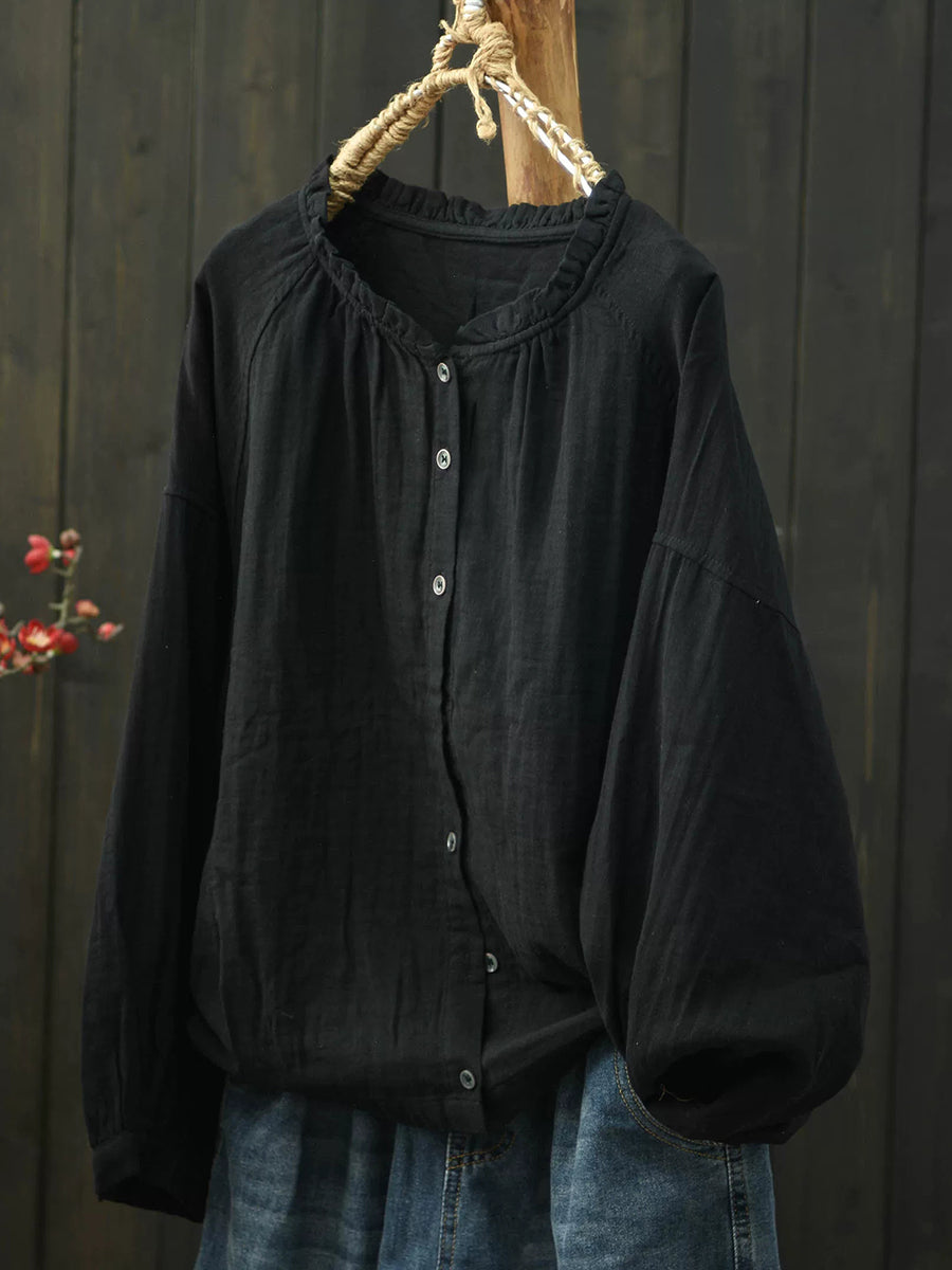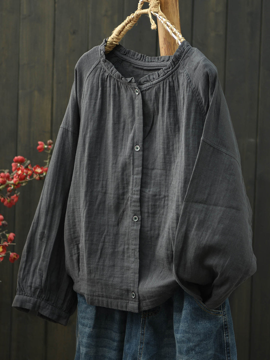 Camisa feminina de algodão com gola alta, estampa artística de primavera em cores sólidas.