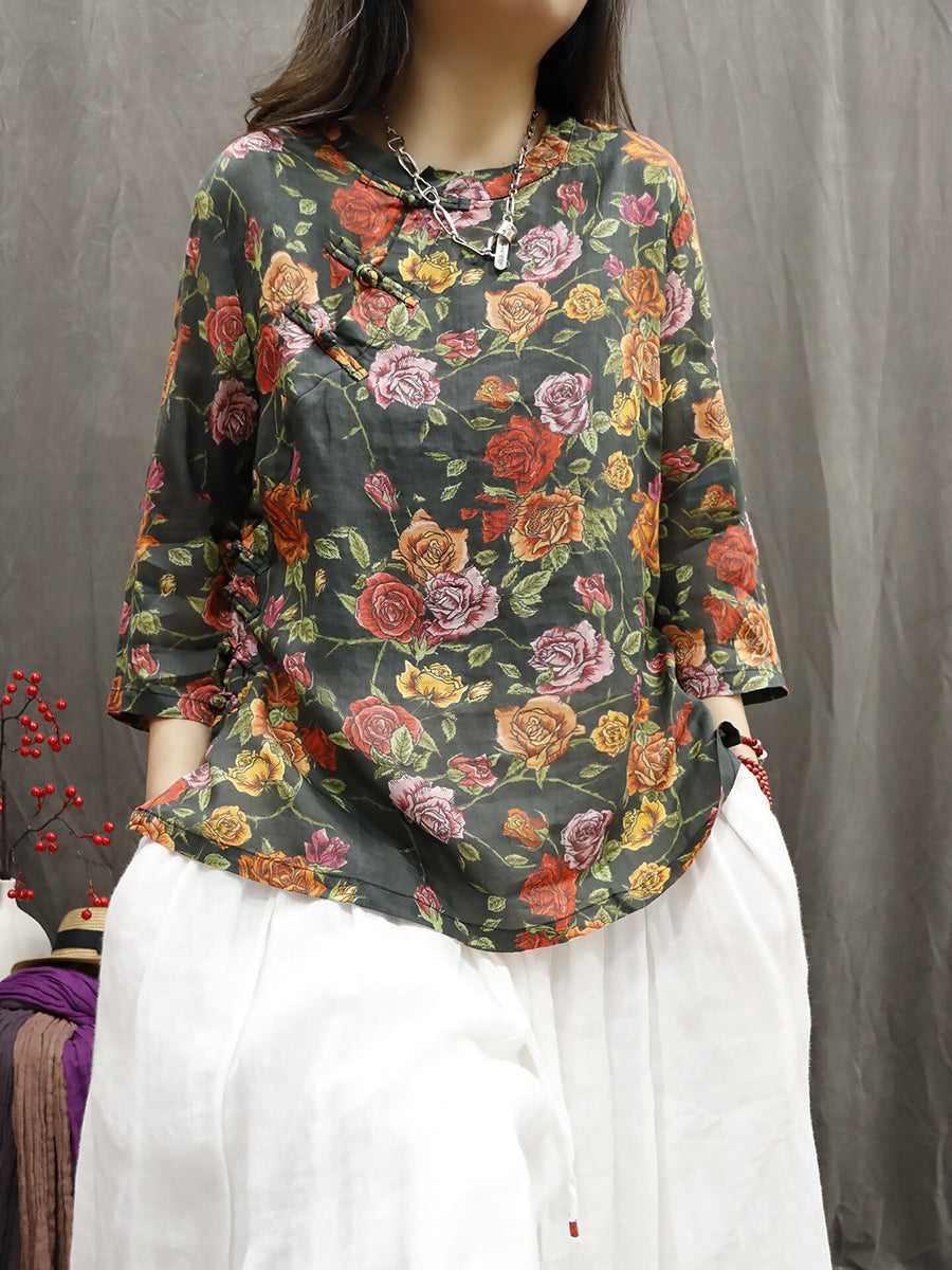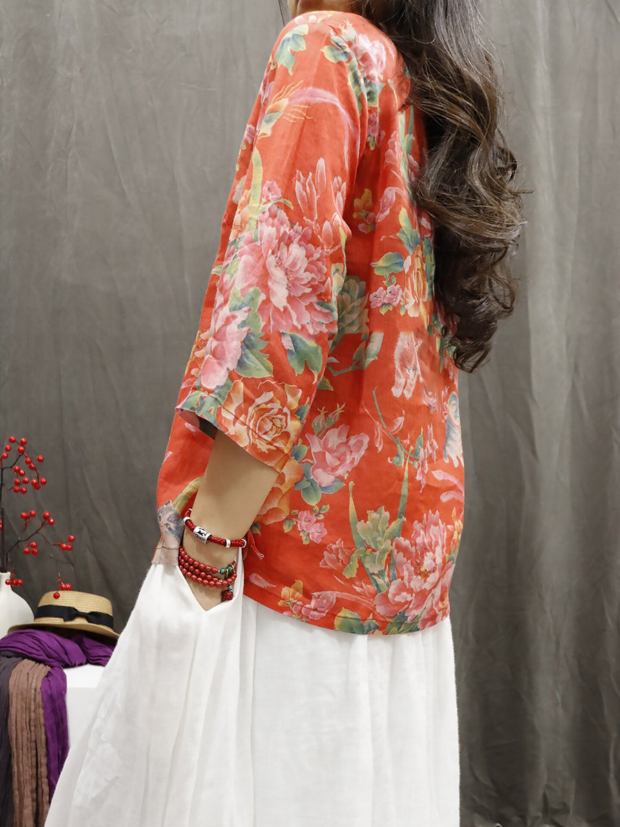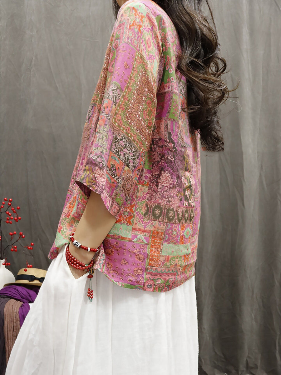 Blusa feminina de verão com estampa étnica floral, 100% rami, gola redonda.