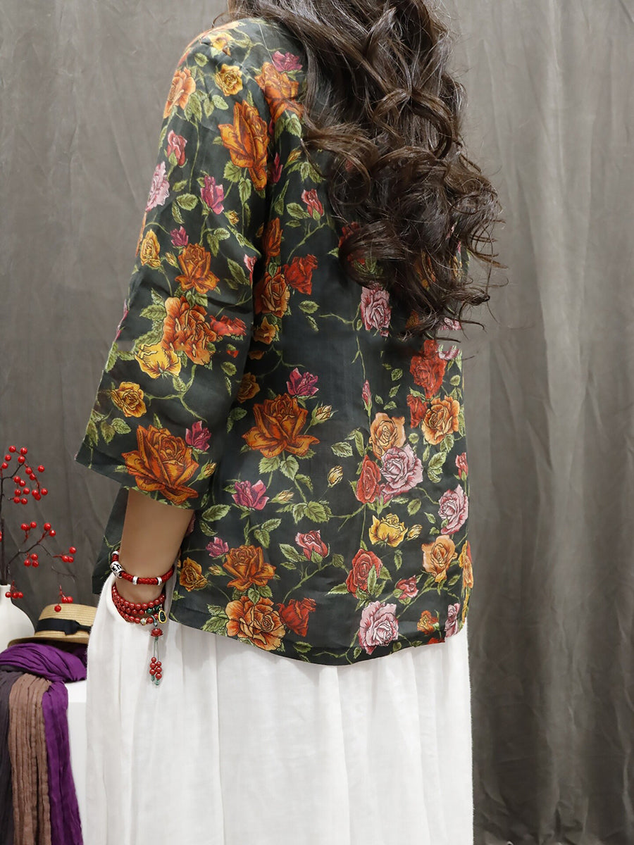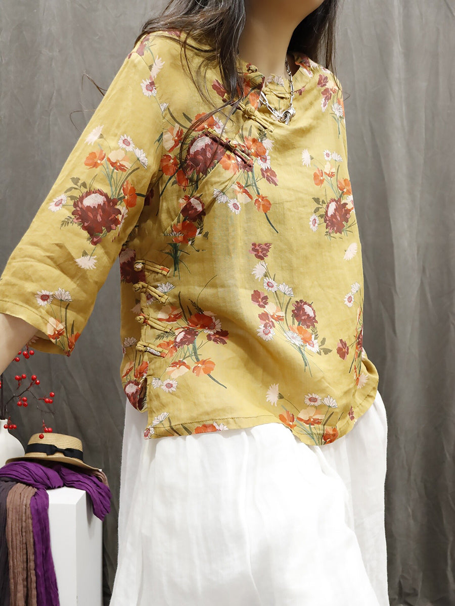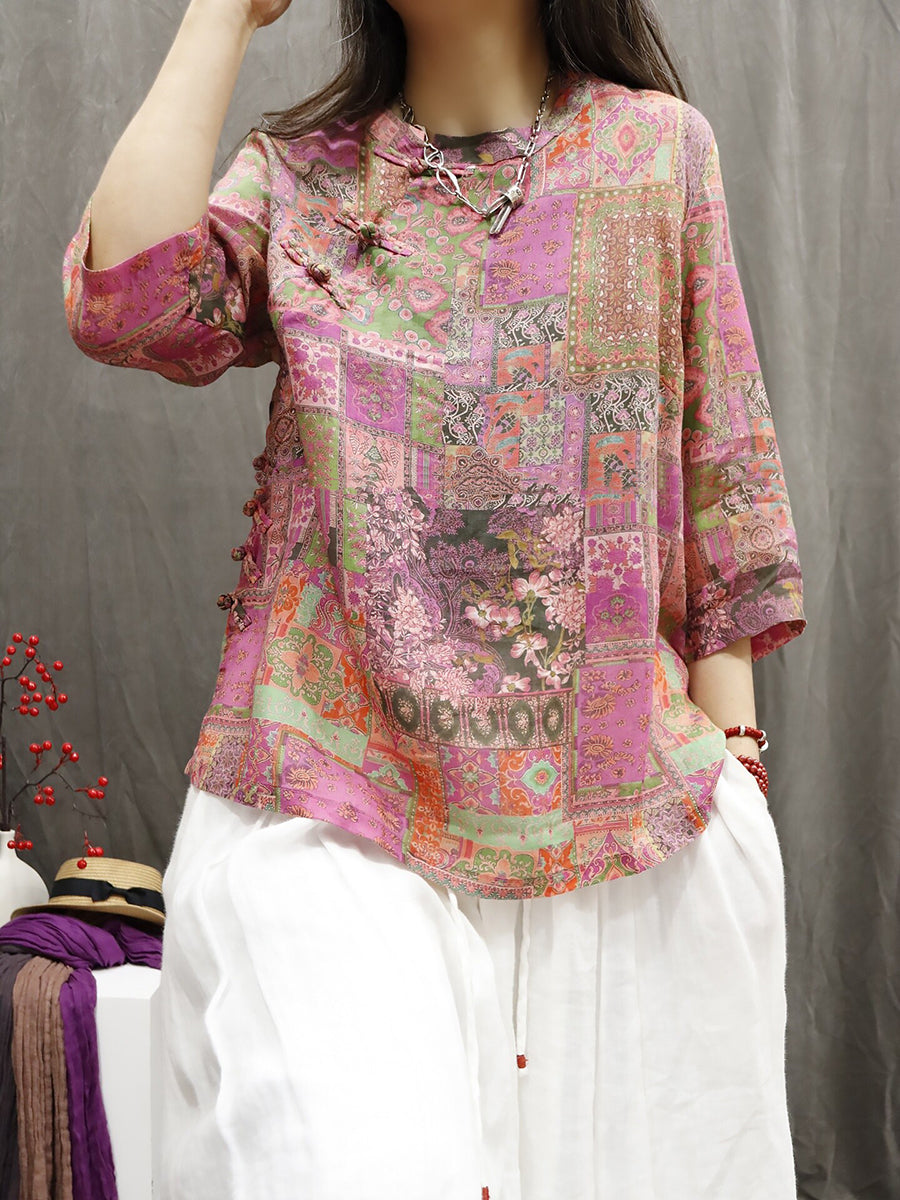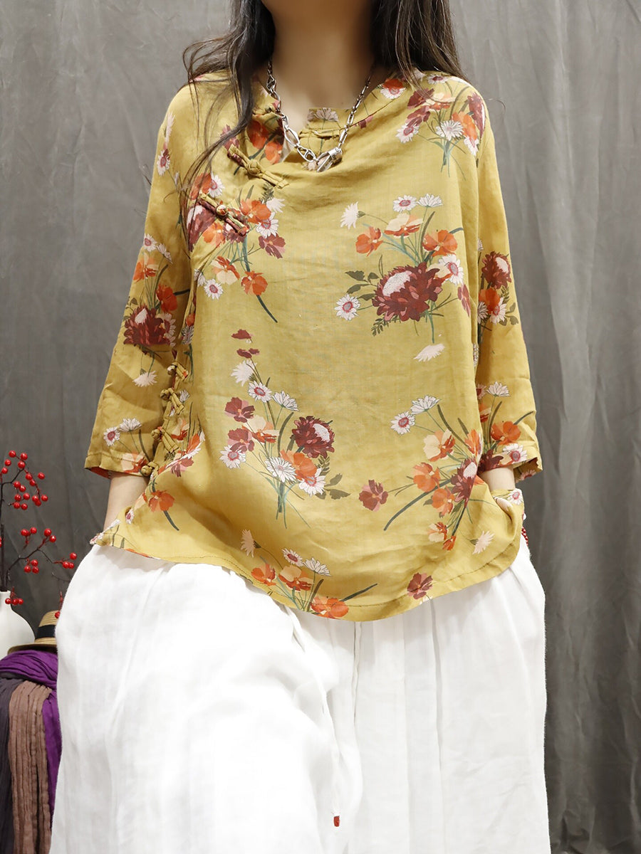 Blusa feminina de verão com estampa étnica floral, 100% rami, gola redonda.