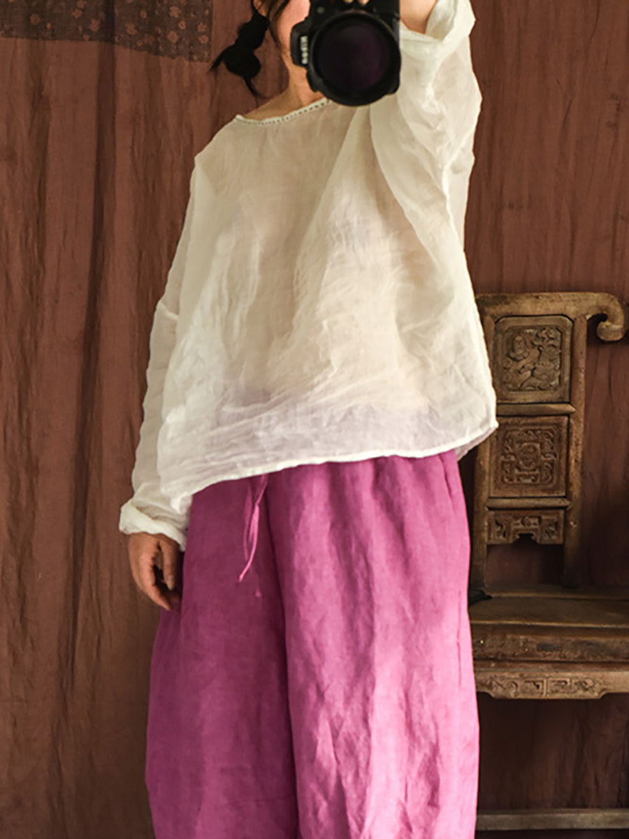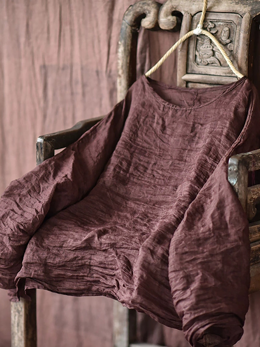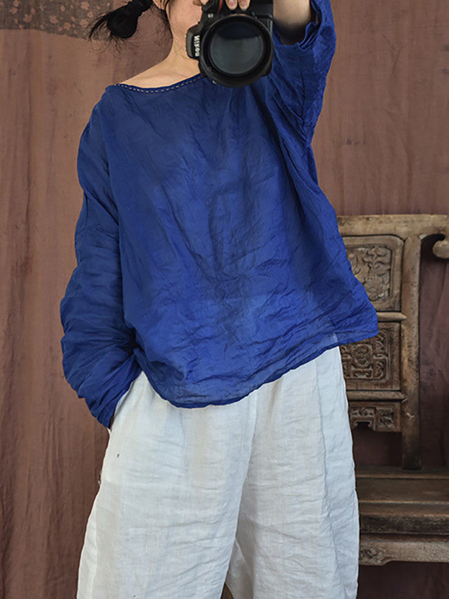 Blusa feminina de verão vintage em rami com decote redondo