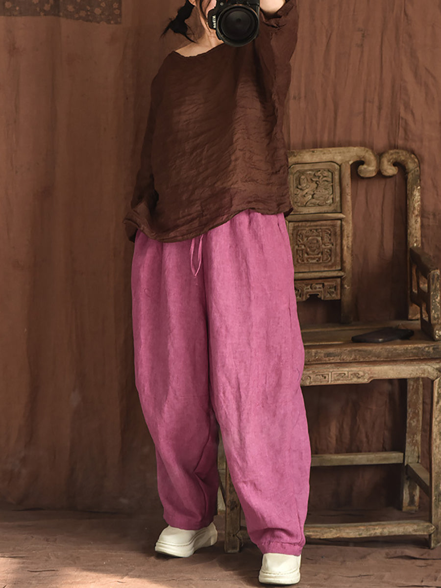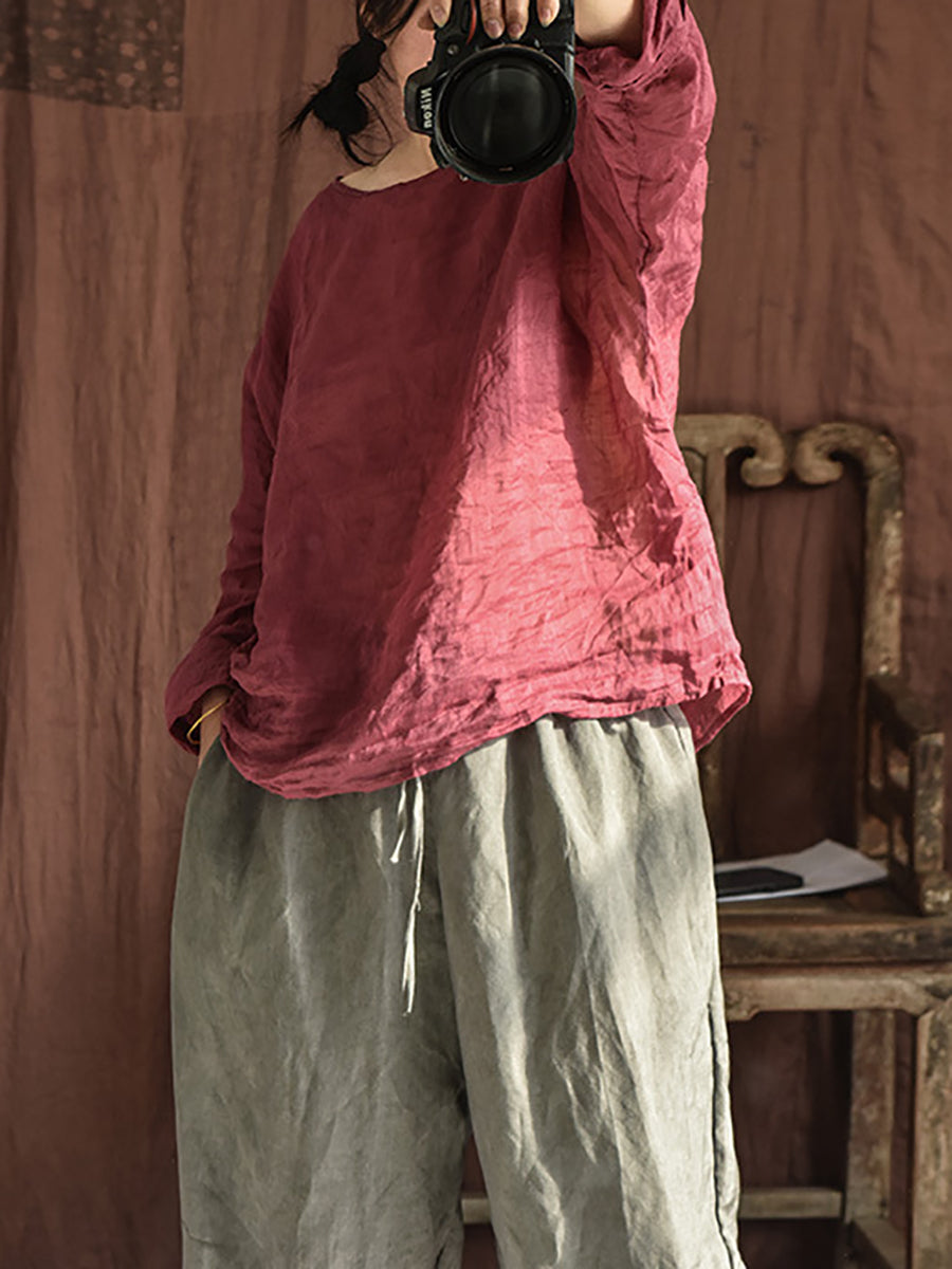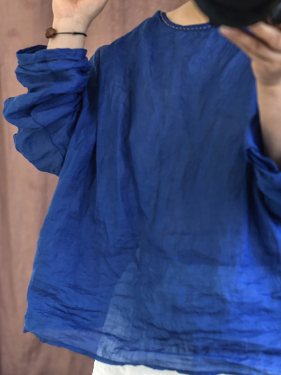 Blusa feminina de verão vintage em rami com decote redondo