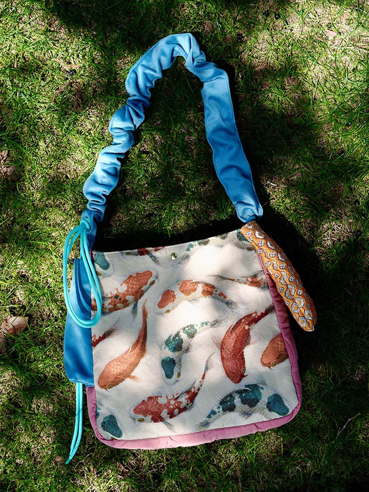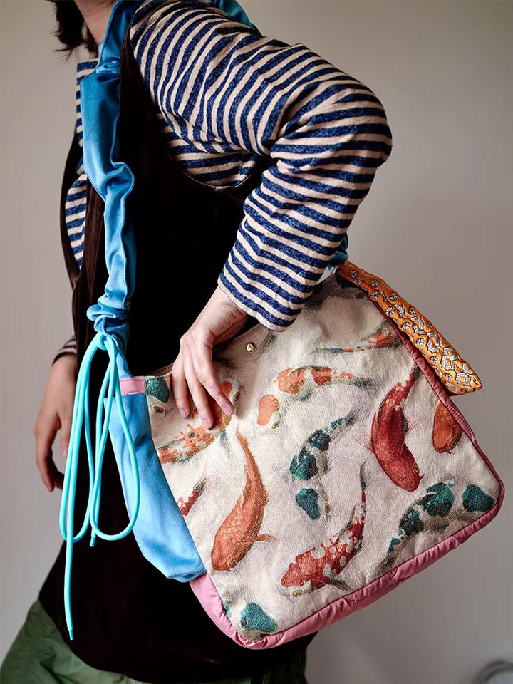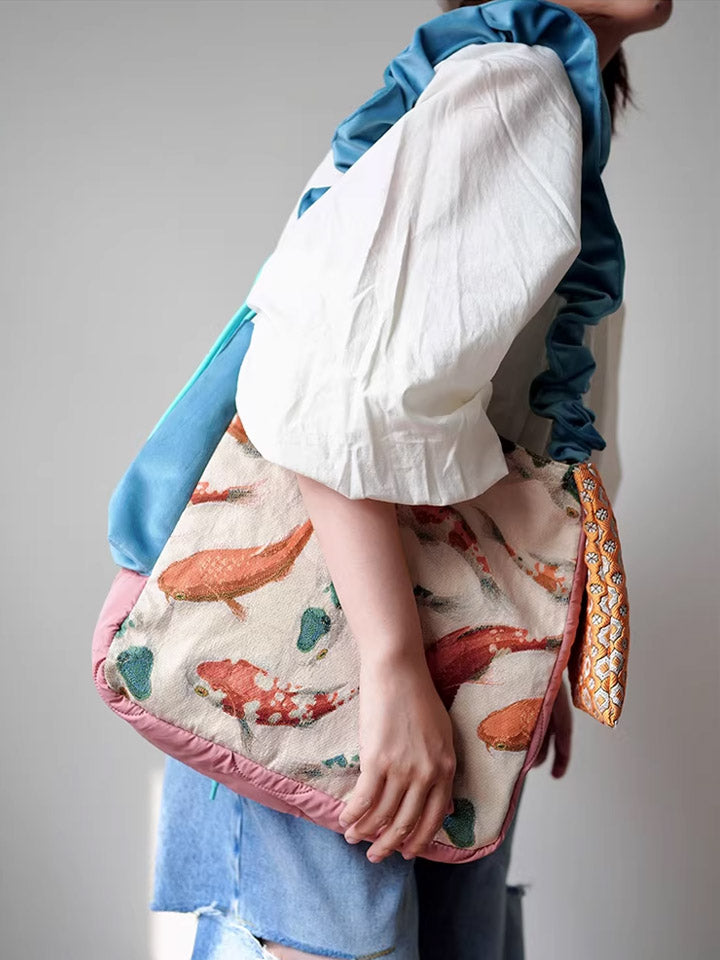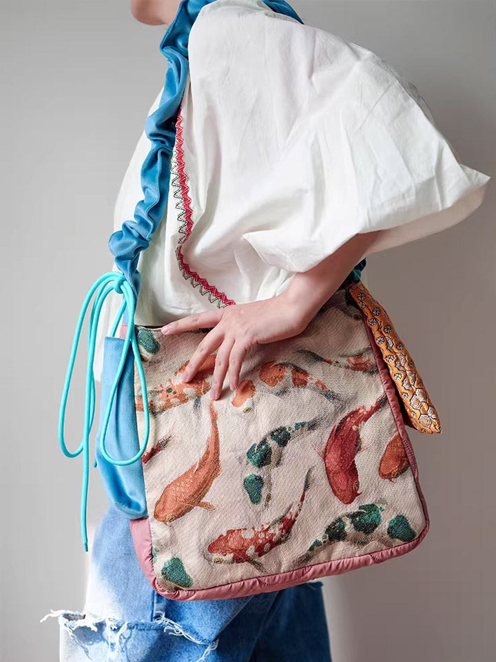 Bolsa transversal com estampa étnica de carpas koi, modelo 30210.