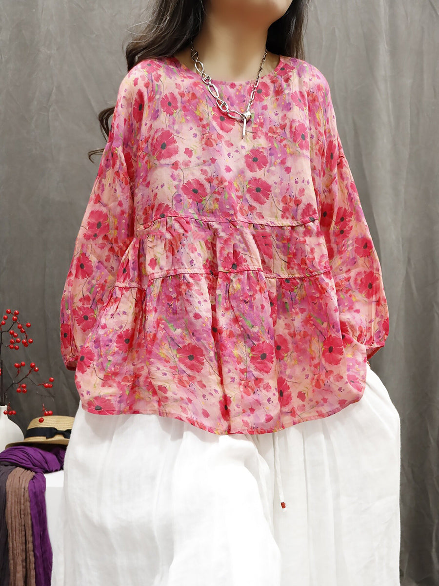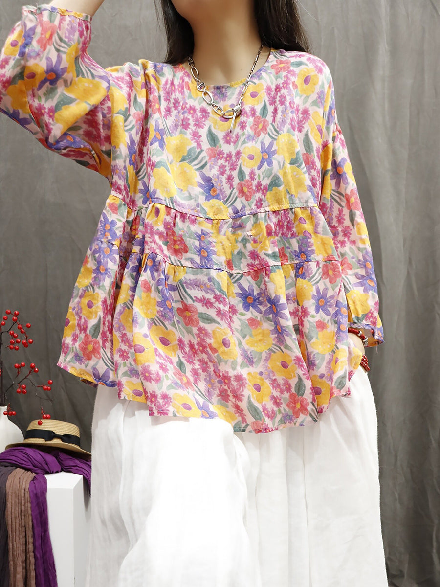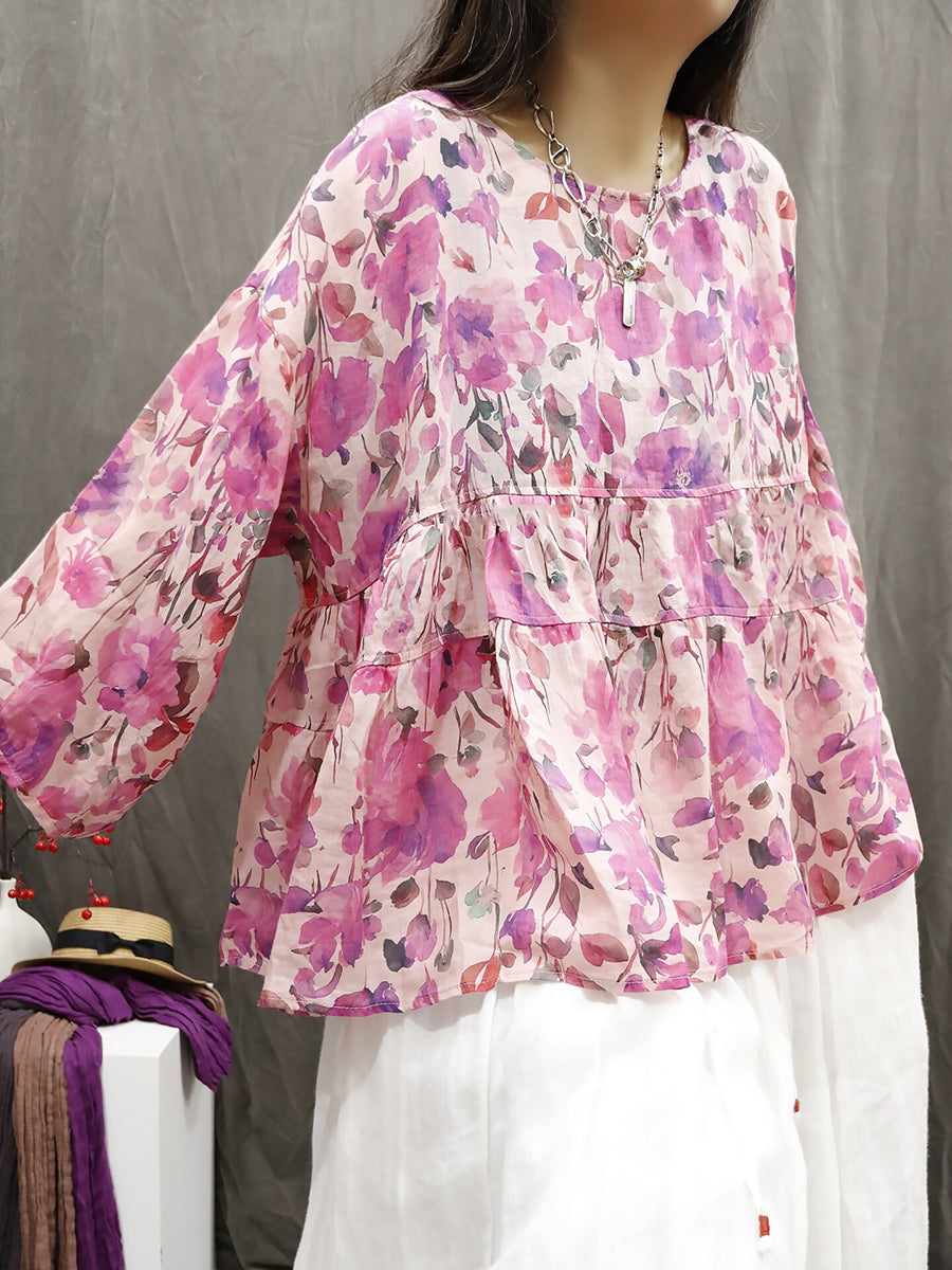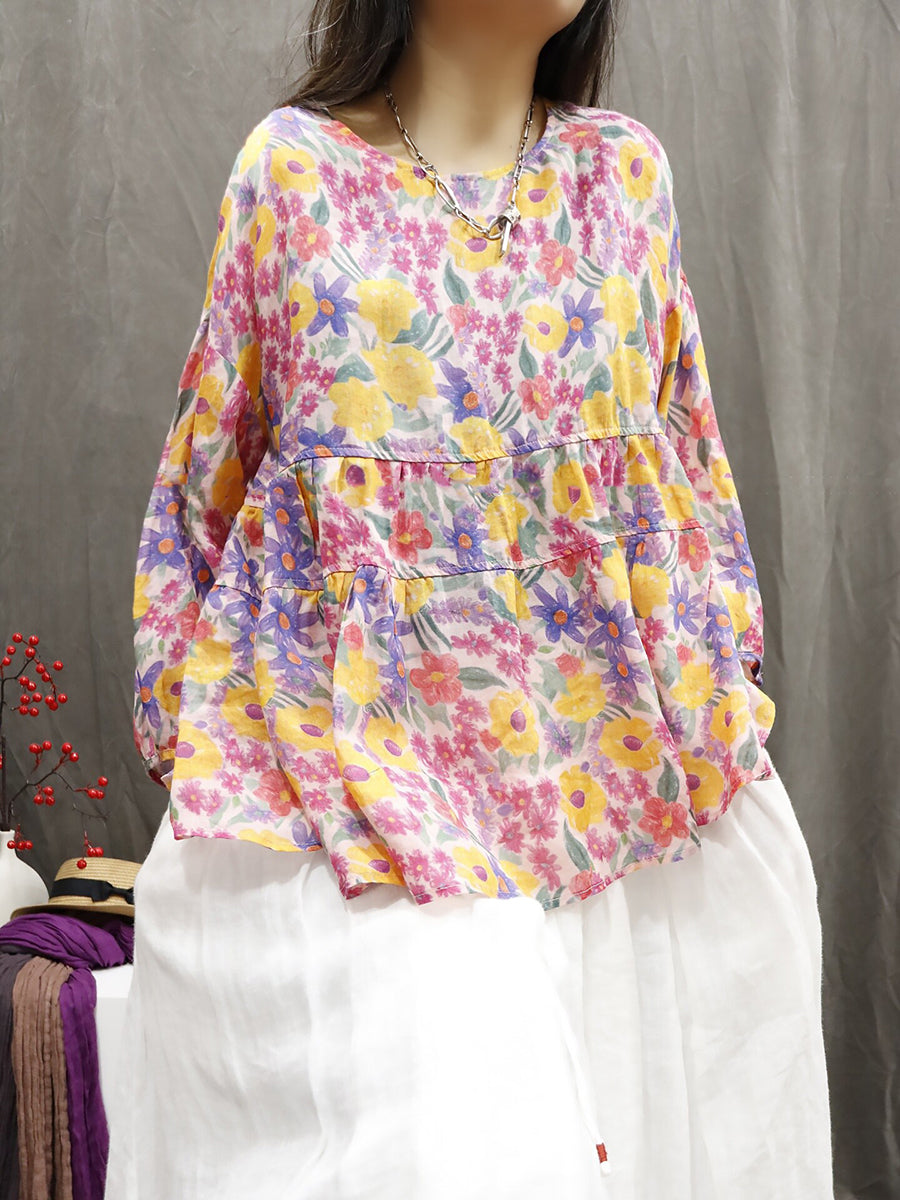 Blusa feminina de verão com estampa étnica floral, 100% rami.