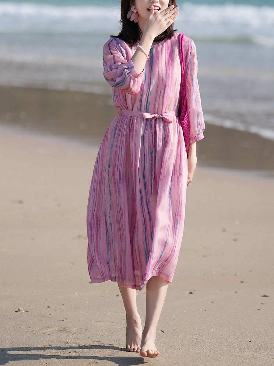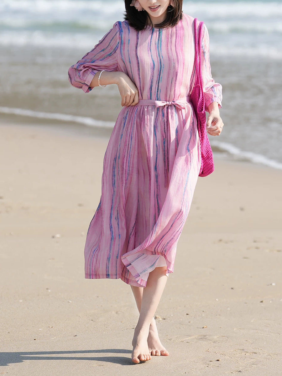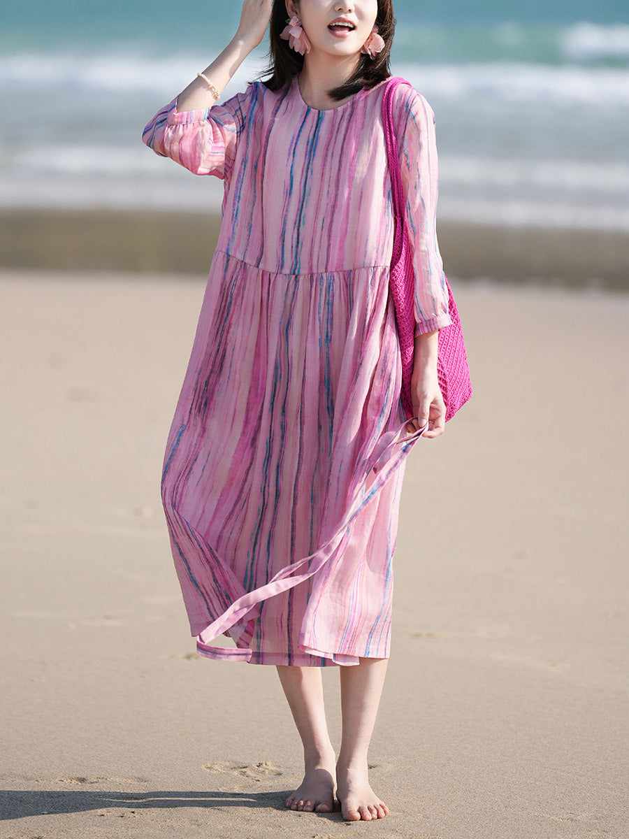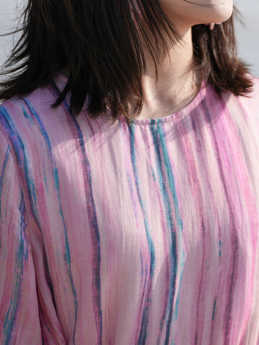 Vestido feminino de verão com estampa artística de listras, 100% rami, gola redonda.