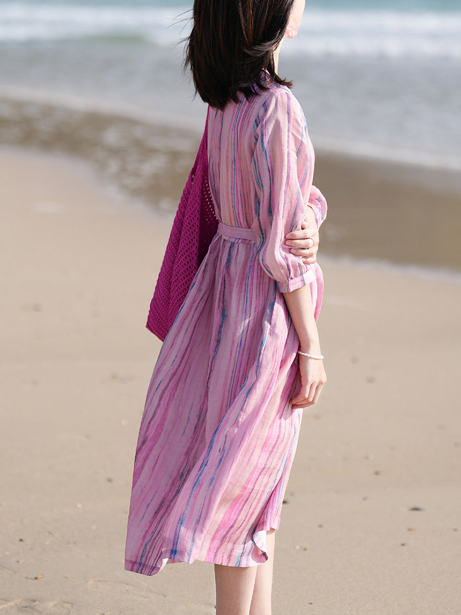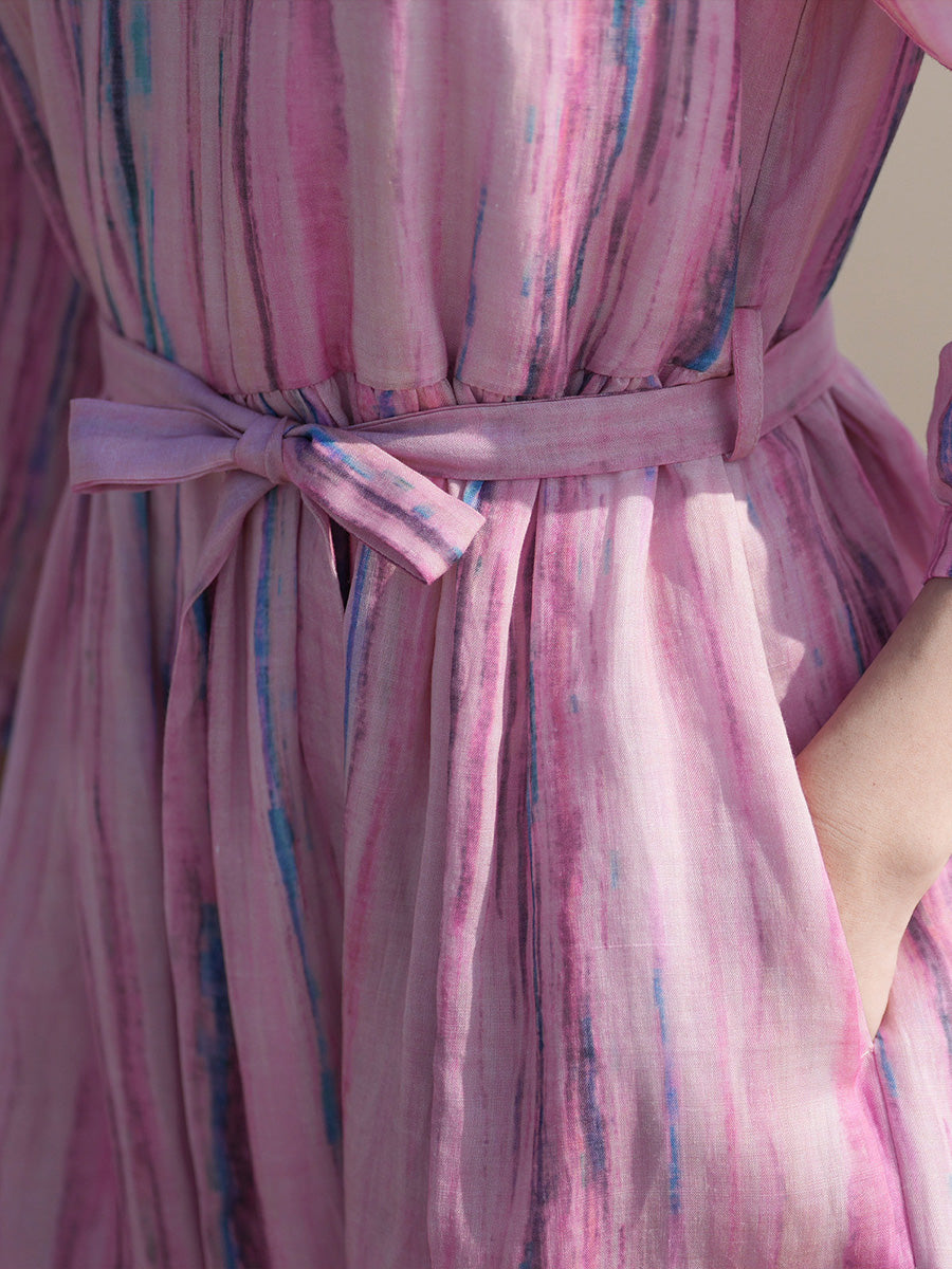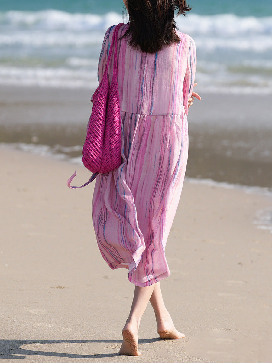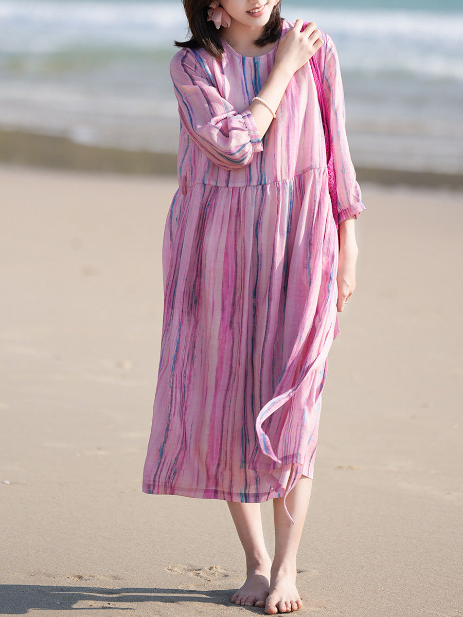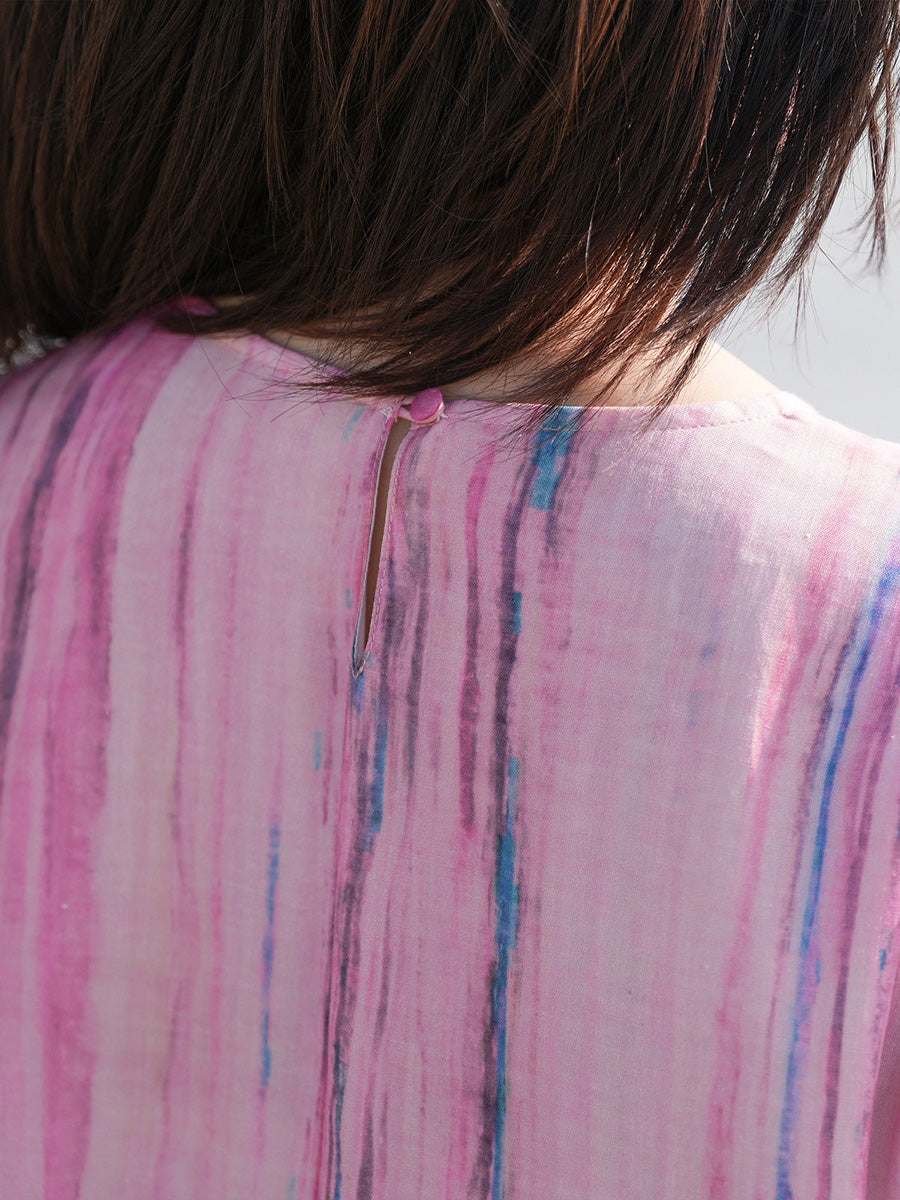 Vestido feminino de verão com estampa artística de listras, 100% rami, gola redonda.