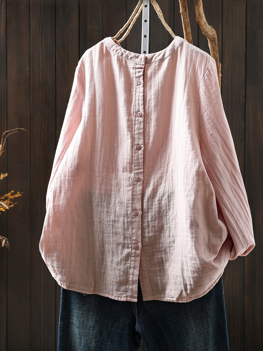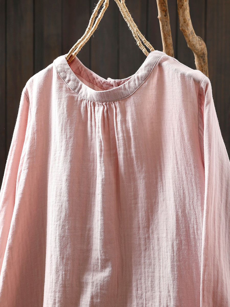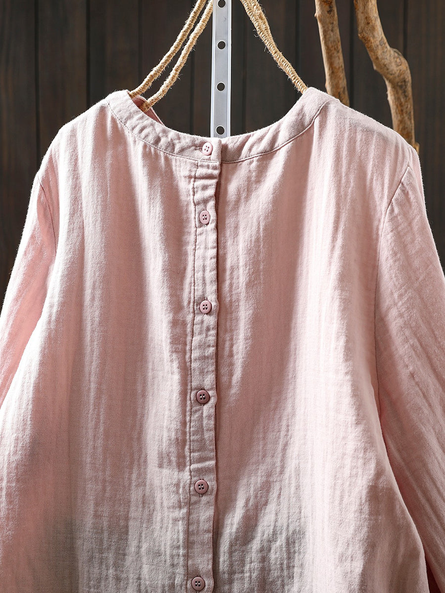 Camisa feminina de algodão 100% com estampa artística de primavera em cores puras.