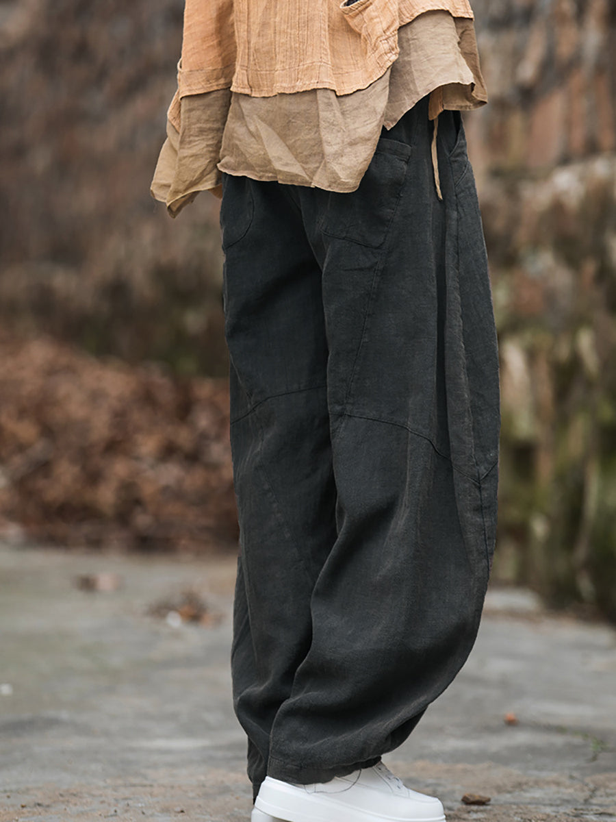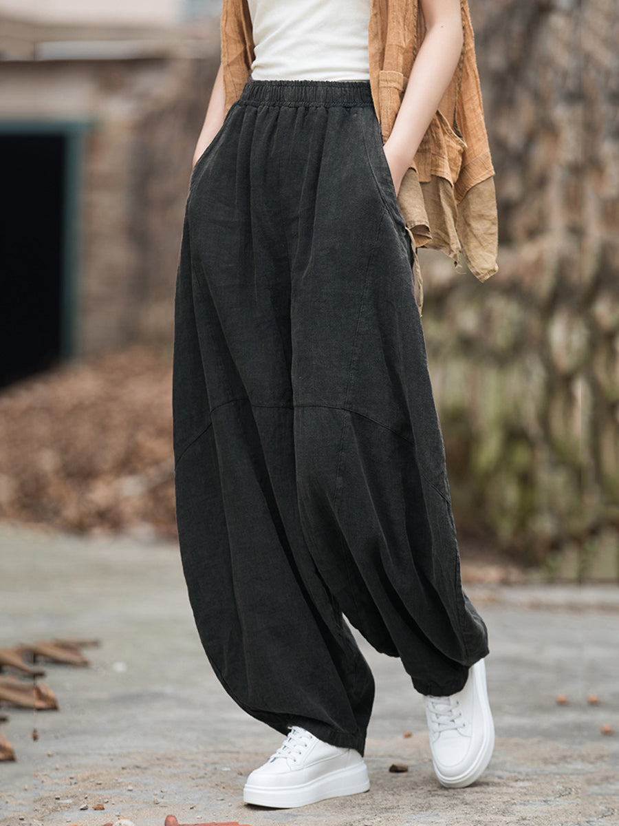 Estas calças harém de estilo retrô apresentam uma cintura elástica e um padrão sólido. Com um design de comprimento total e bolsos práticos, elas são perfeitas para estações mais frias, como outono e inverno.