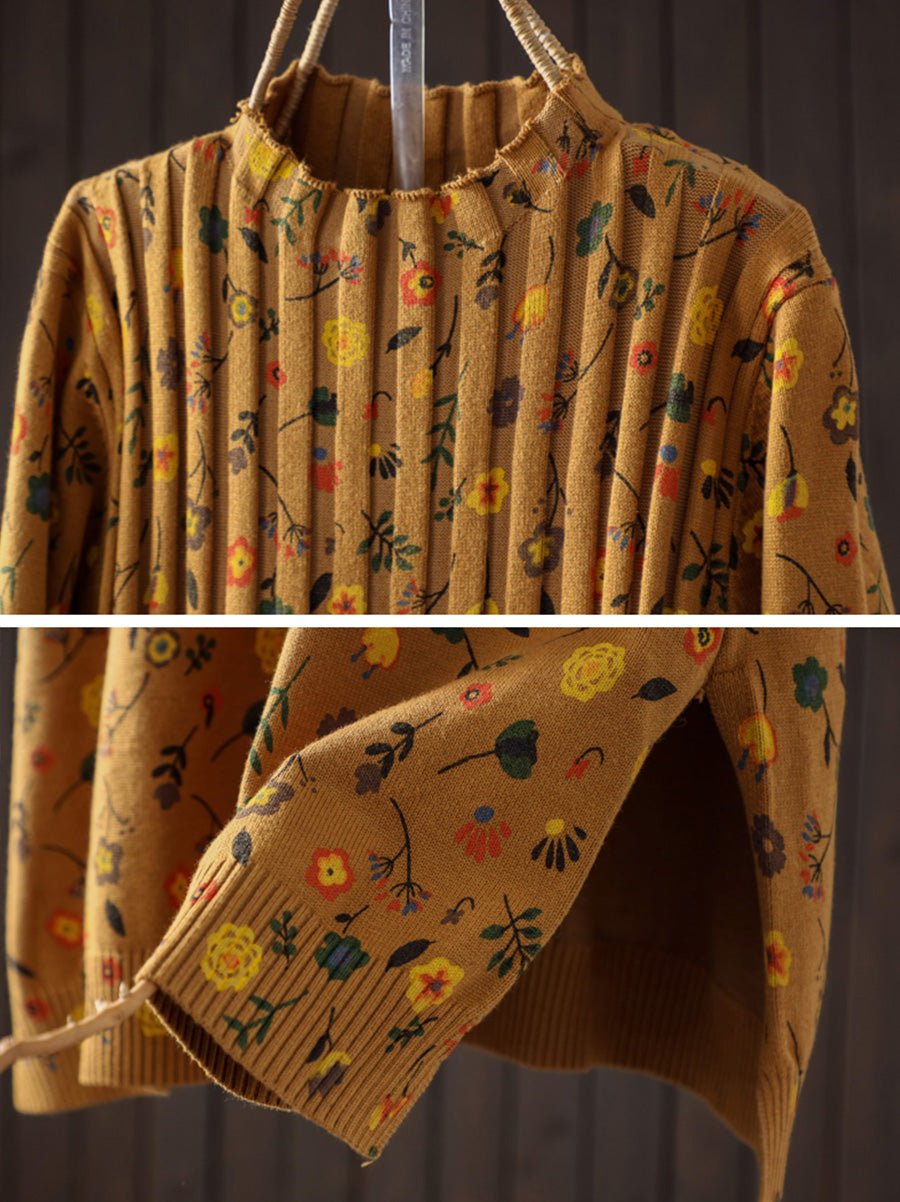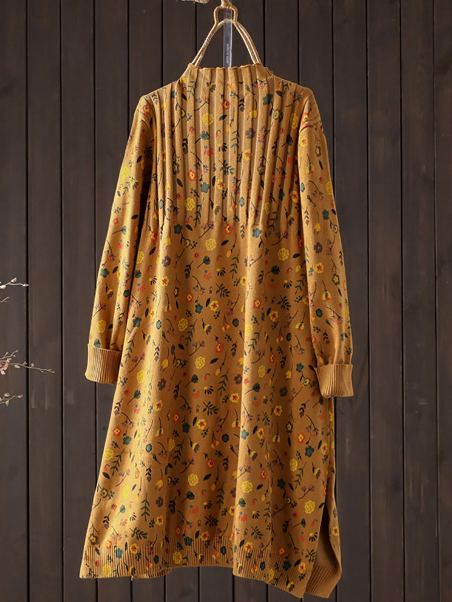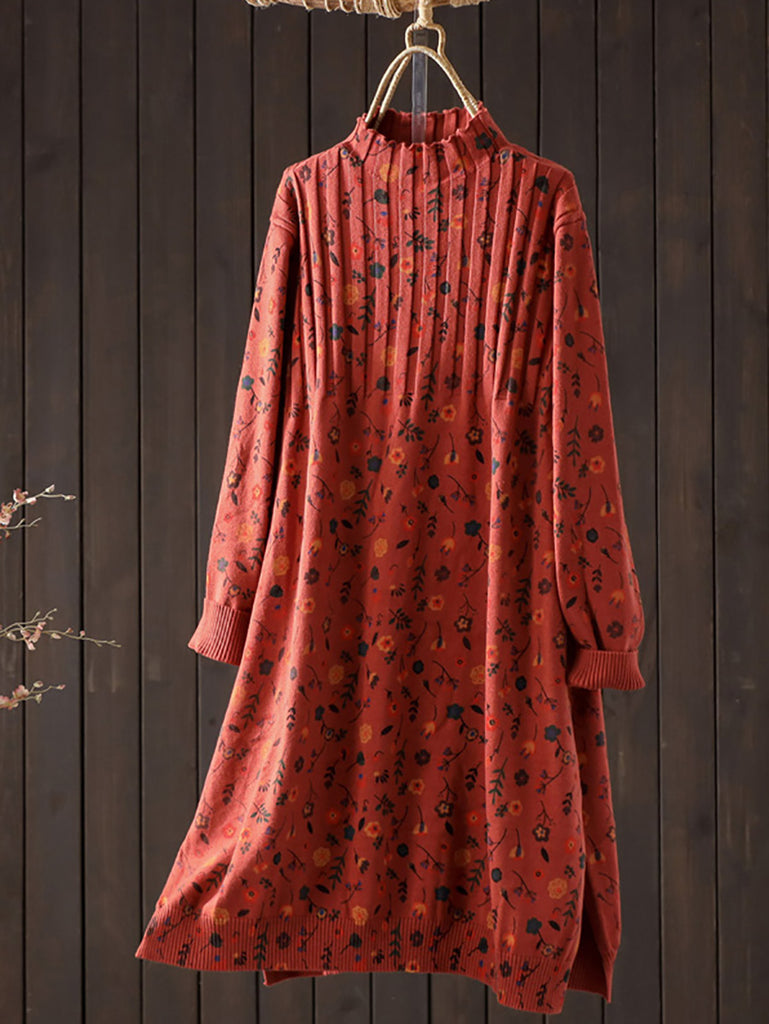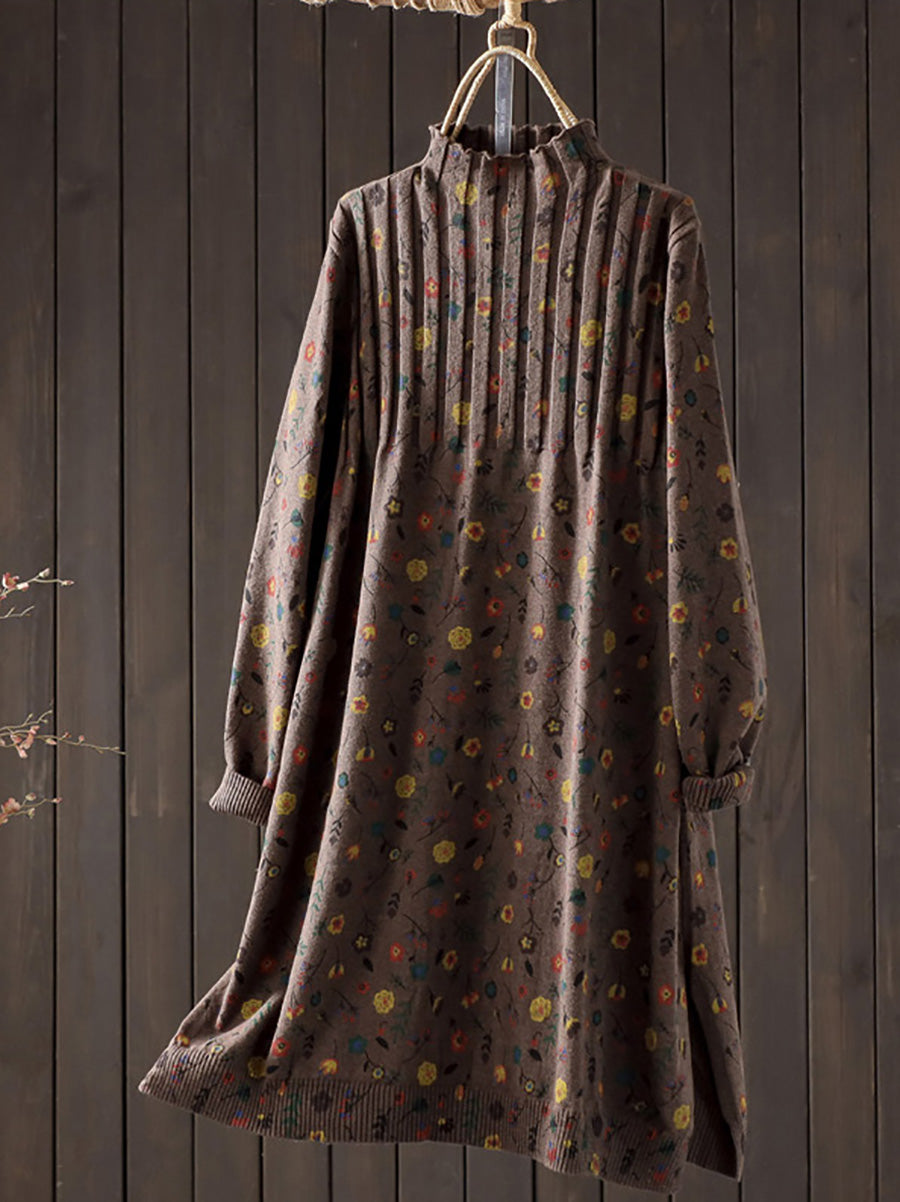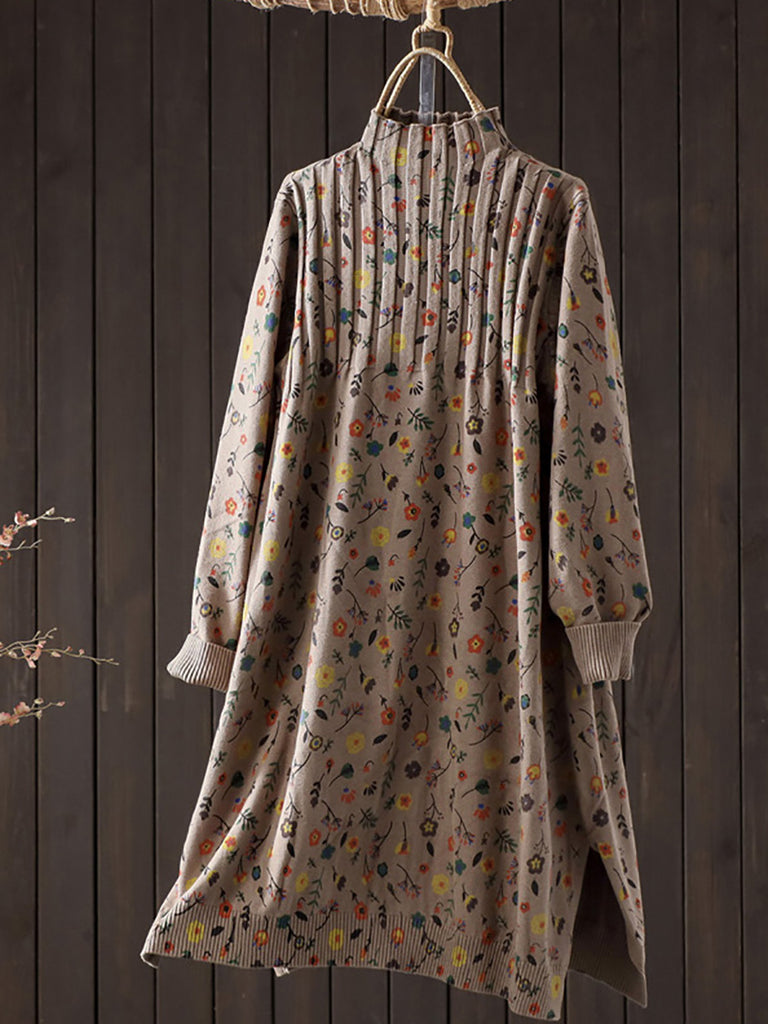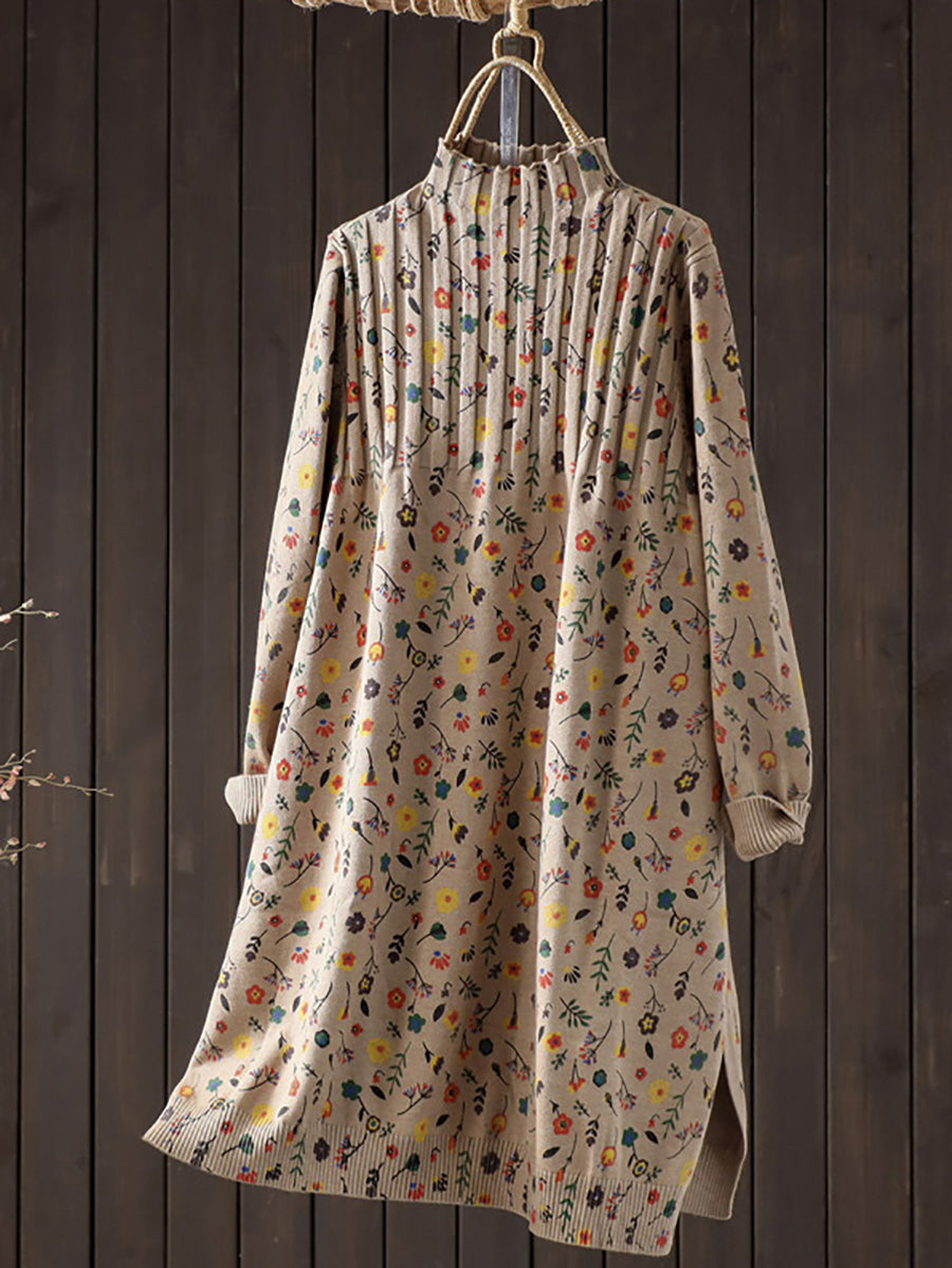 Vestido feminino de tricô com gola alta e estampa floral vintage para o outono.