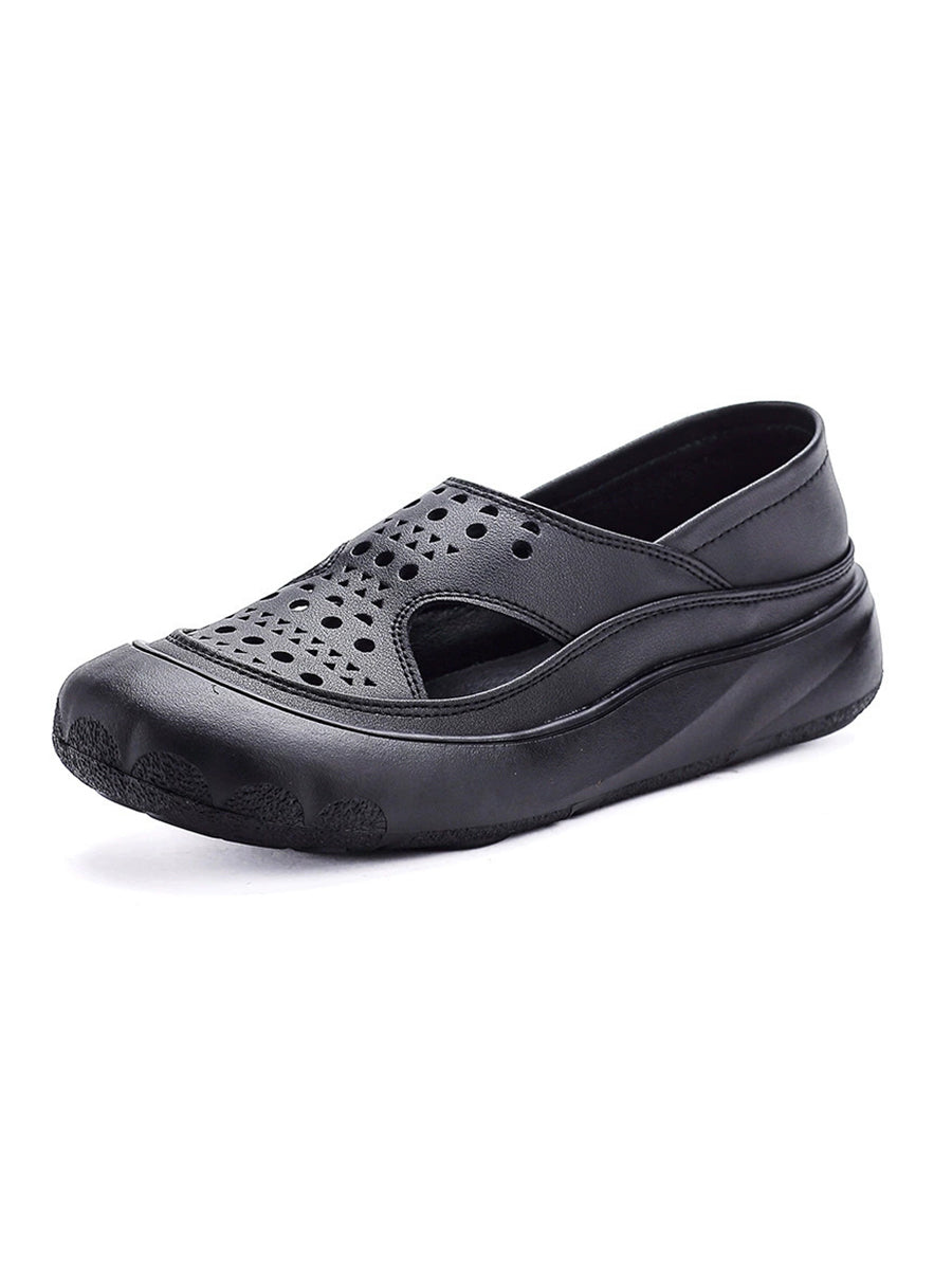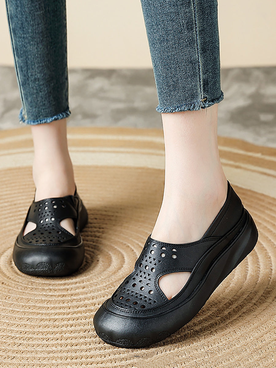Sapatos femininos de verão vazados em couro legítimo, modelo baixo.