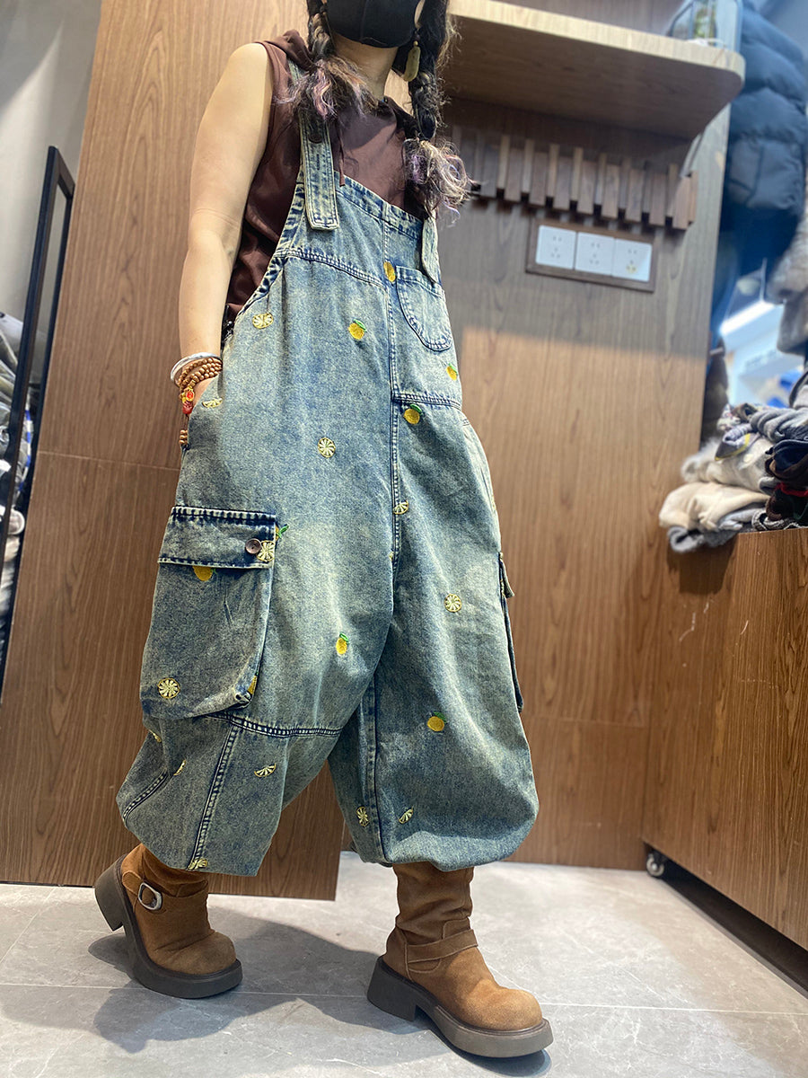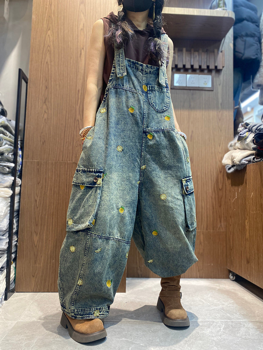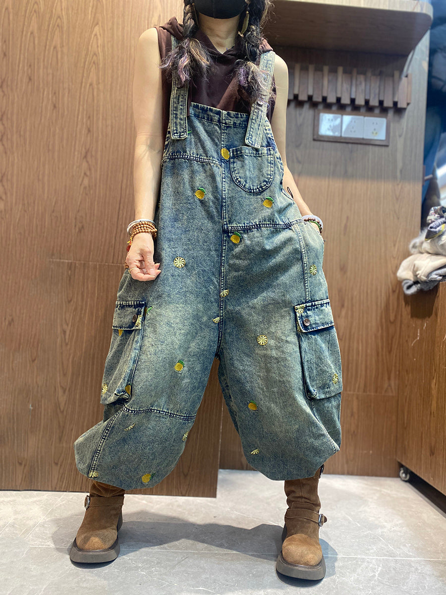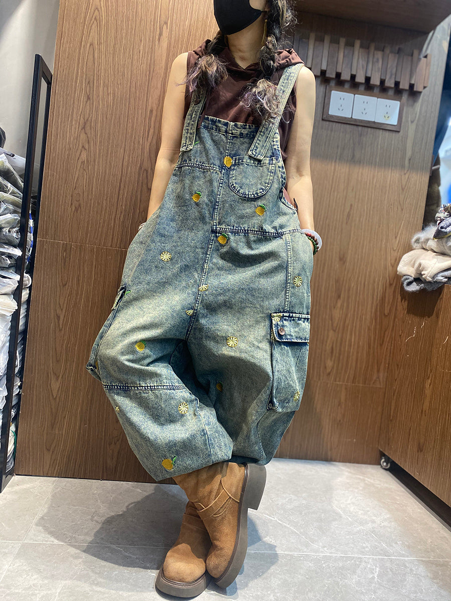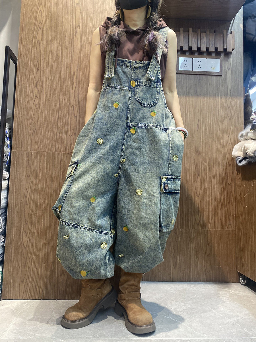 Macacão jeans feminino vintage bordado, modelagem solta.