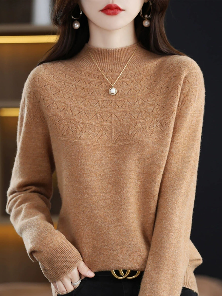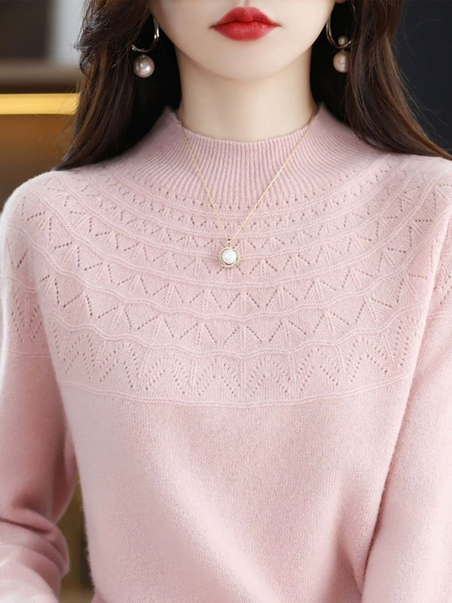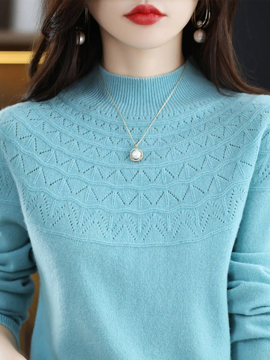 Suéter feminino de gola alta curta em cor lisa, estilo artístico para a primavera.