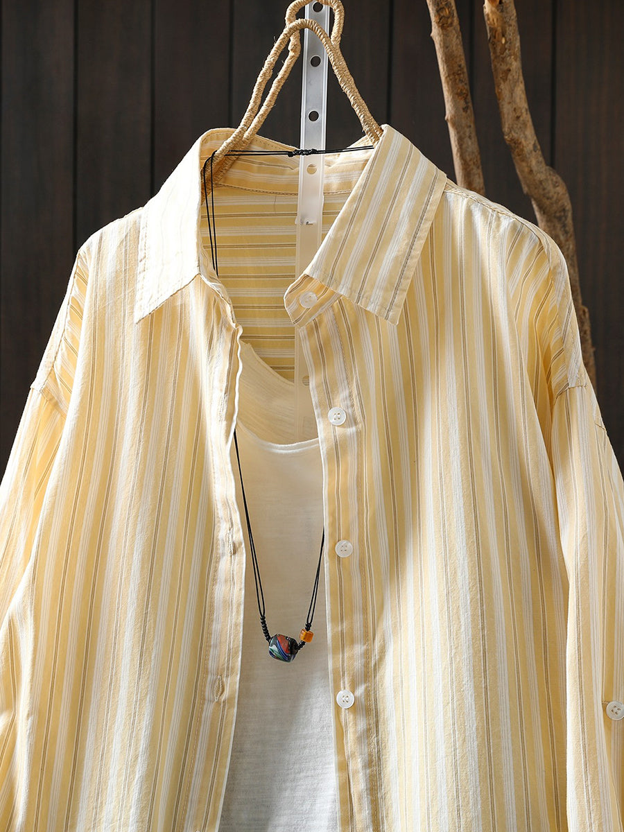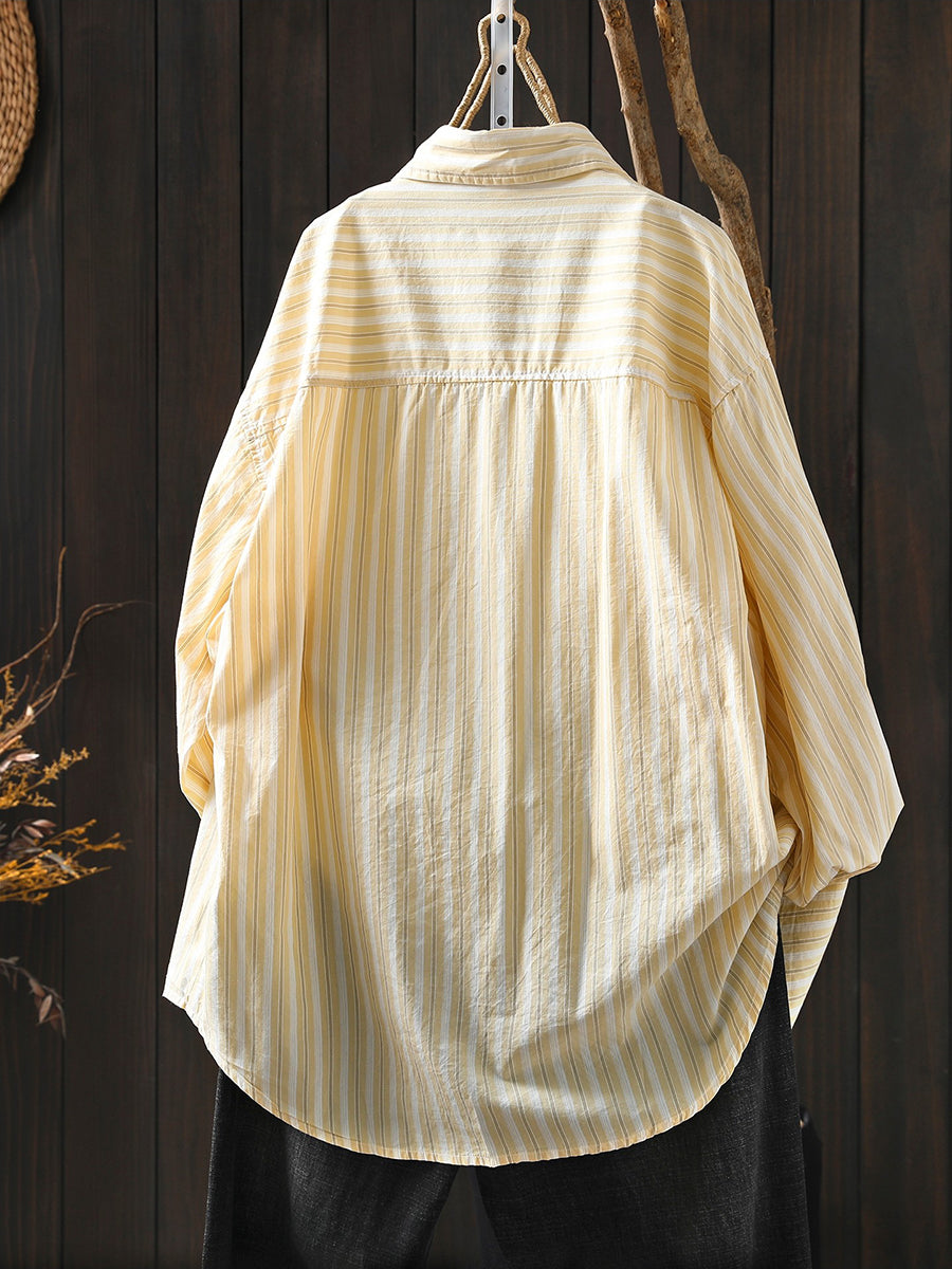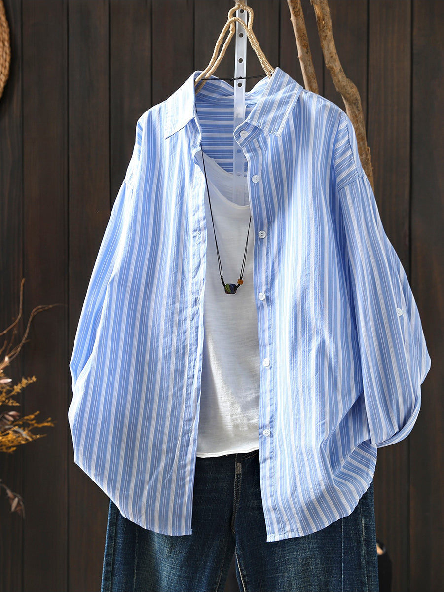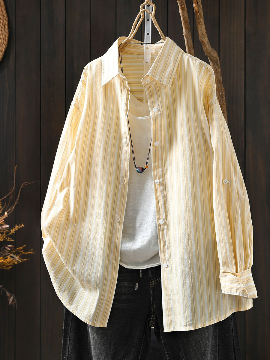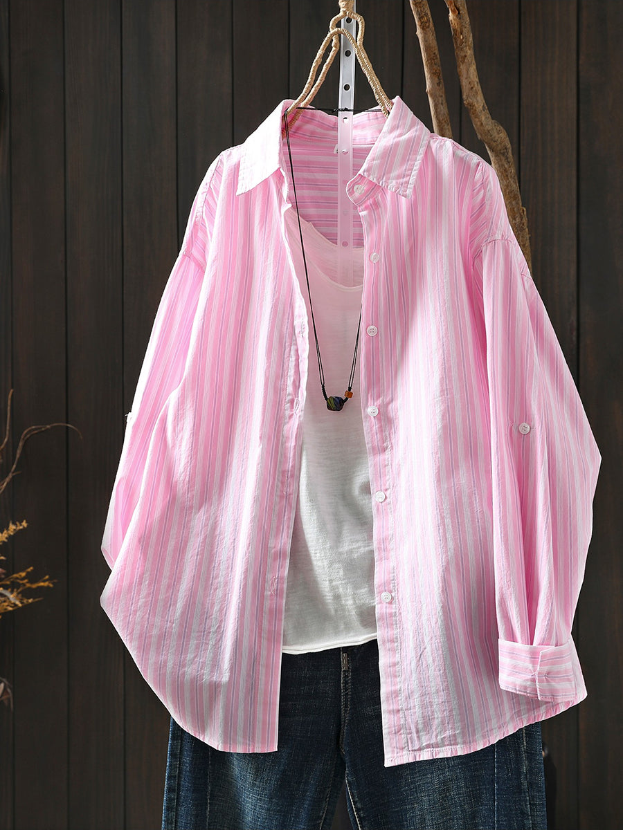 Camisa feminina listrada artística de primavera, 100% algodão, com gola dobrável.
