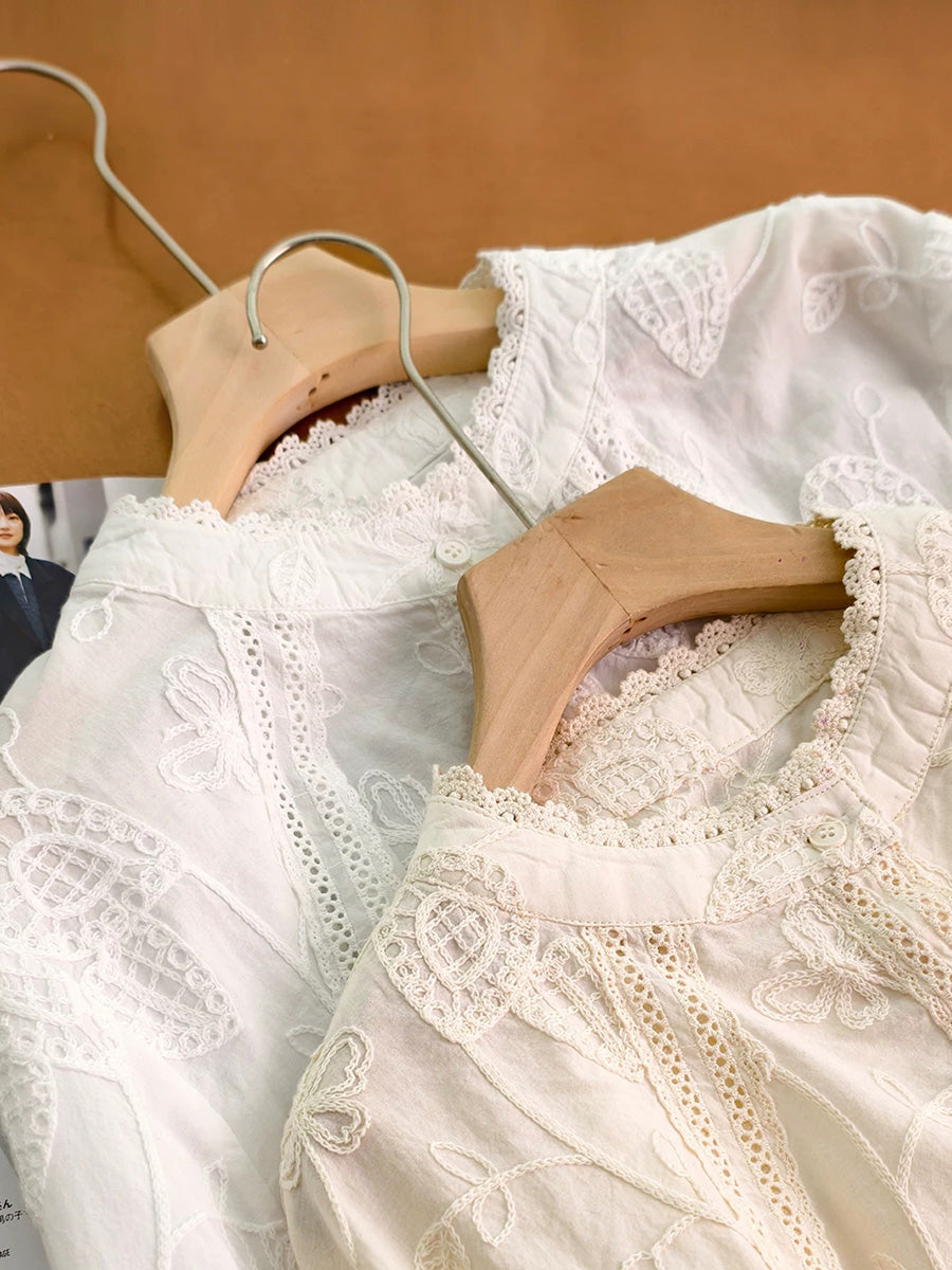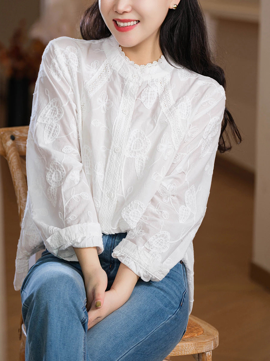 Camisa feminina de algodão com bordado artístico para o verão