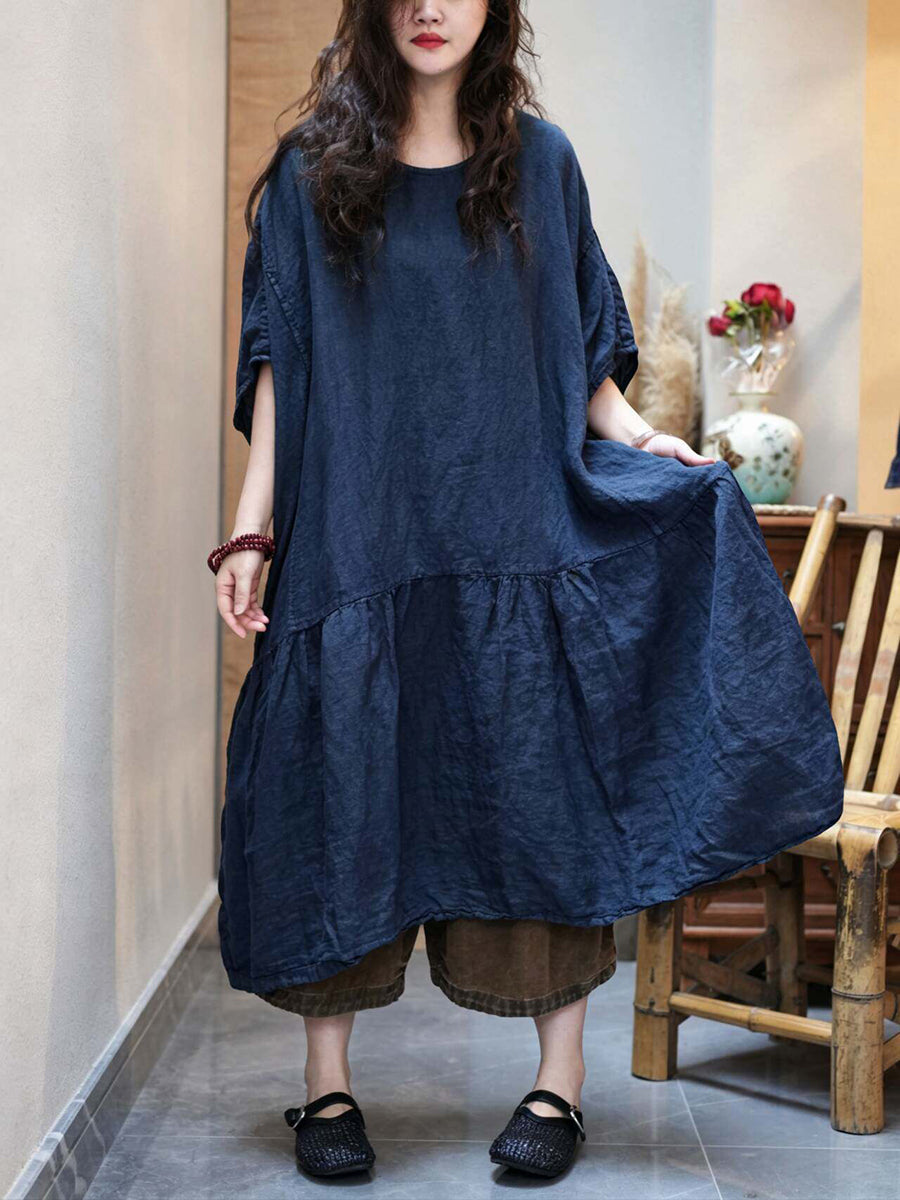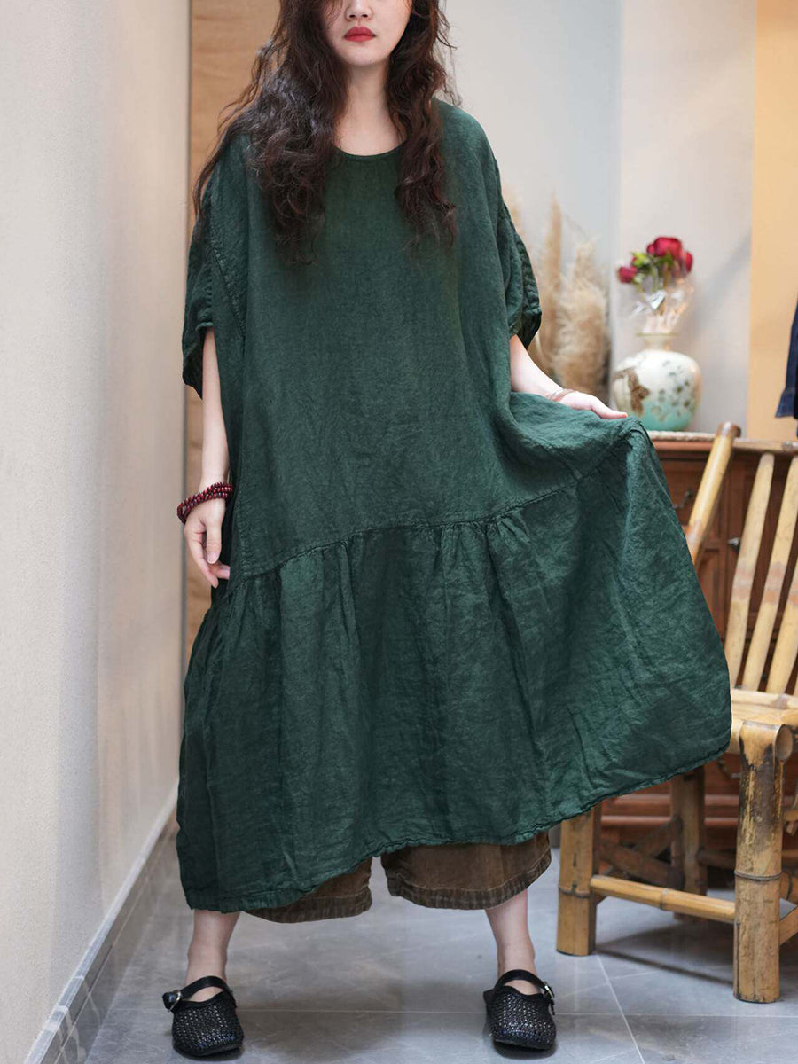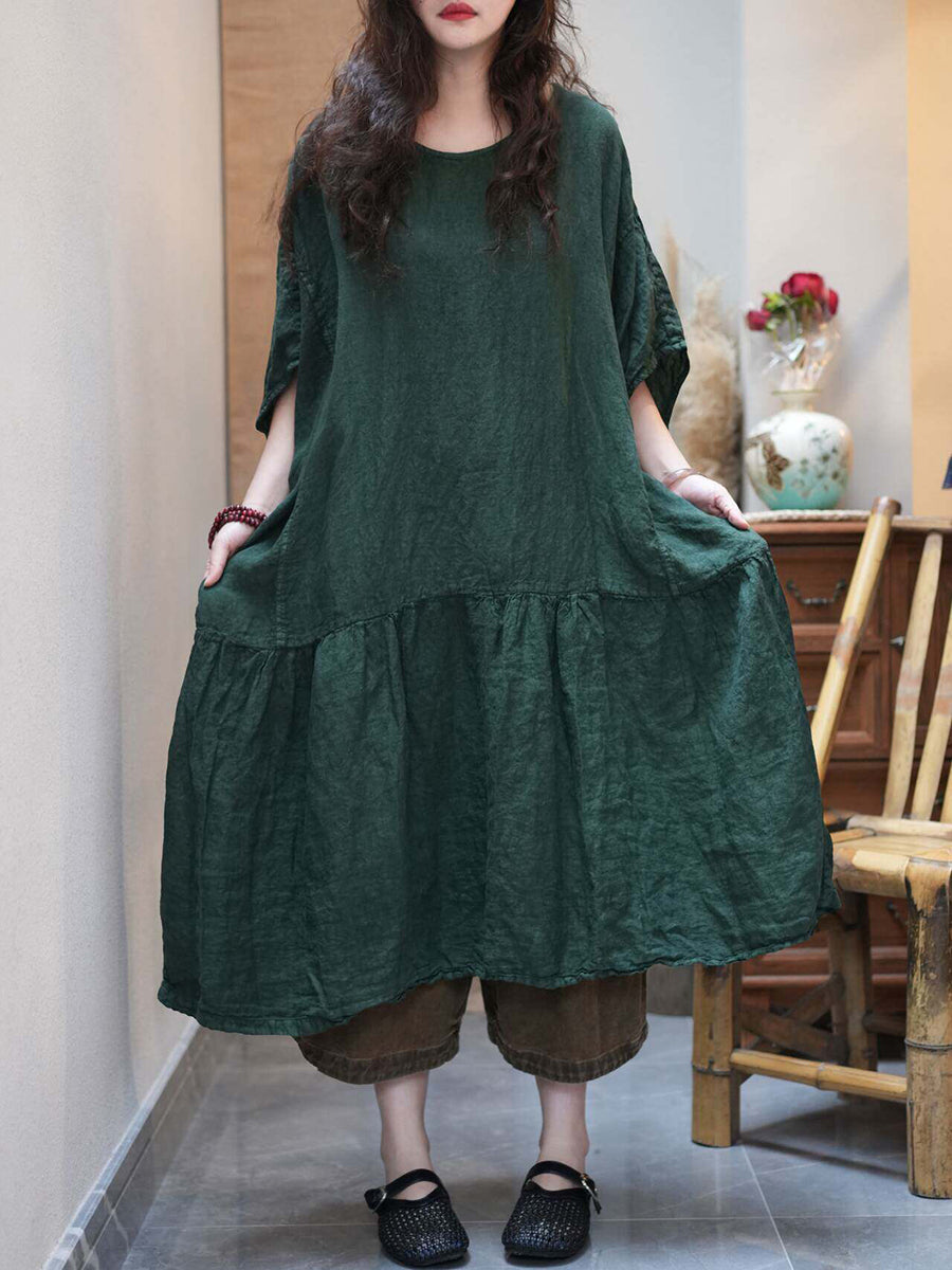 Vestido feminino de linho retrô de cor lisa com decote redondo para o verão