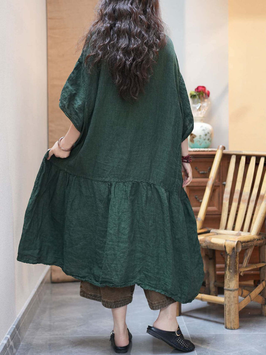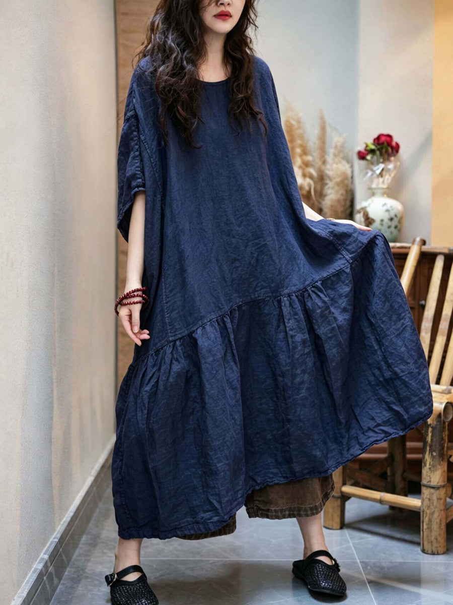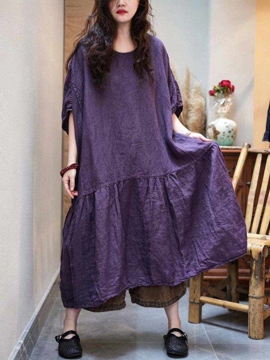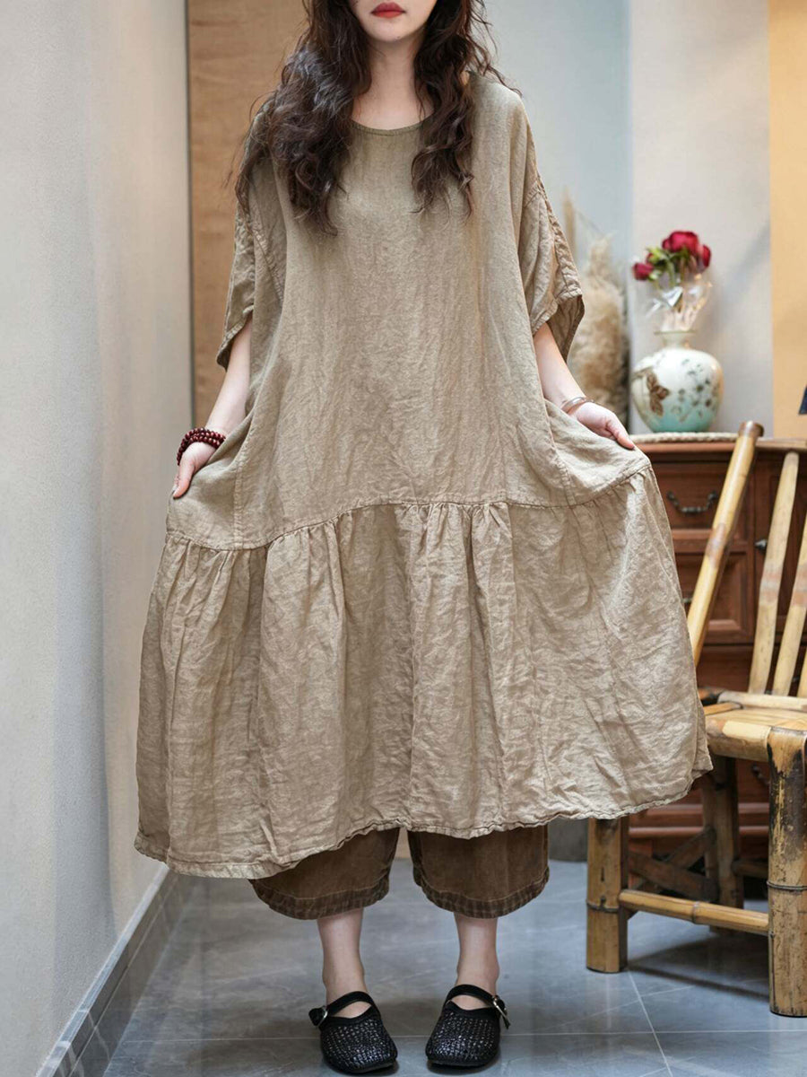 Vestido feminino de linho retrô de cor lisa com decote redondo para o verão